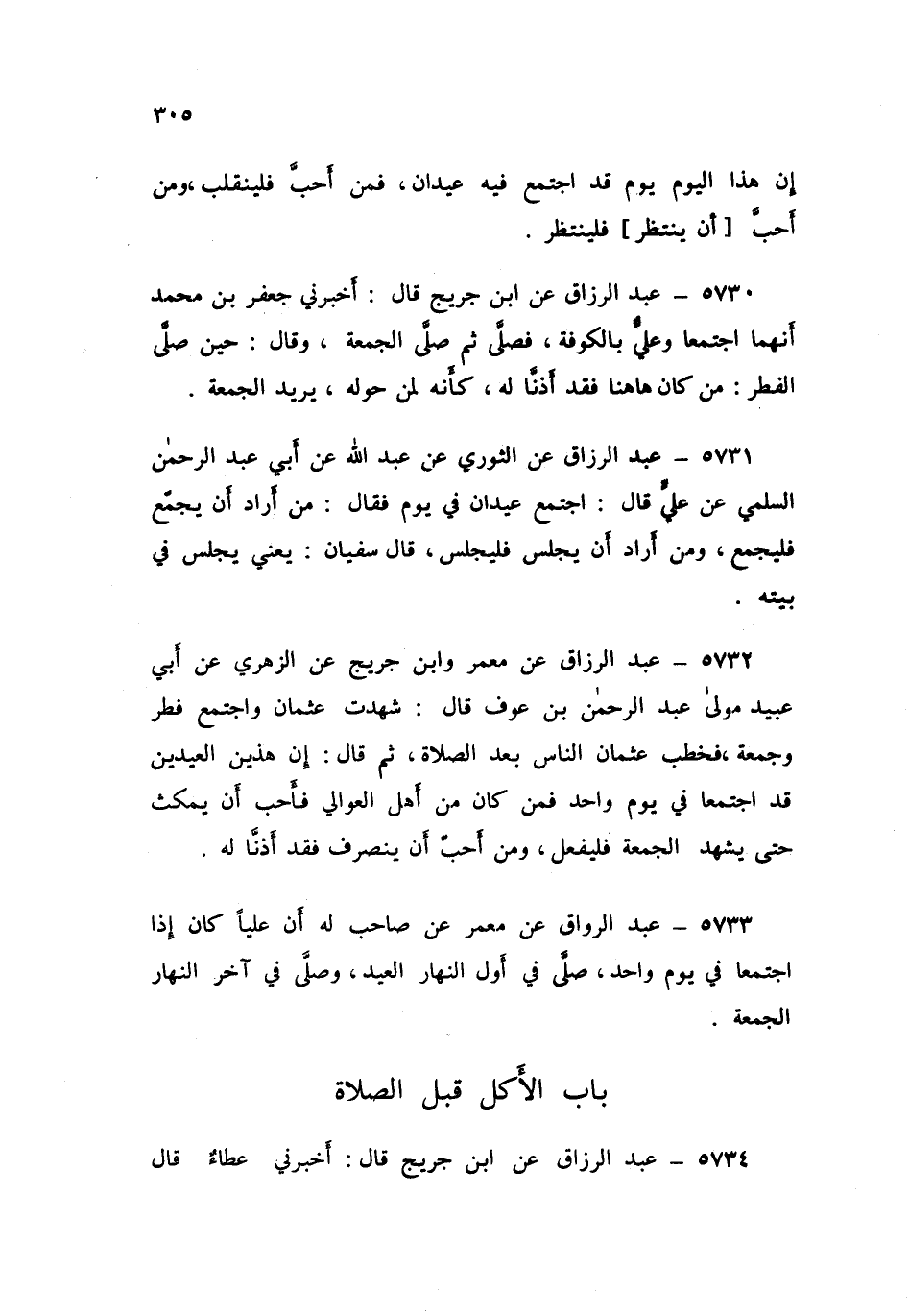 ٥٧٣٢ - عَبْدُ الرَّزَّاقِ، عَنْ مَعْمَرٍ، وَابْنِ جُرَيْجٍ، عَنِ الزُّهْرِيِّ، عَنْ أَبِي عُبَيْدٍ، مَوْلَى عَبْدِ الرَّحْمَنِ بْنِ عَوْفٍ قَالَ: شَهِدْتُ عُثْمَانَ وَاجْتَمَعَ فِطْرٌ وَجُمُعَةٌ، فَخَطَبَ عُثْمَانُ النَّاسَ بَعْدَ الصَّلَاةِ، ثُمَّ قَالَ: «إِنَّ هَذَيْنِ الْعِيدَيْنِ قَدِ اجْتَمَعَا فِي يَوْمٍ وَاحِدٍ، فَمَنْ كَانَ مِنْ أَهْلِ الْعَوَالِي فَأَحَبَّ أَنْ يَمْكُثَ حَتَّى يَشْهَدَ الْجُمُعَةَ فَلْيَفْعَلْ، وَمَنْ أَحَبَّ أَنْ يَنْصَرِفَ قَدْ أَذِنَّا لَهُ»
