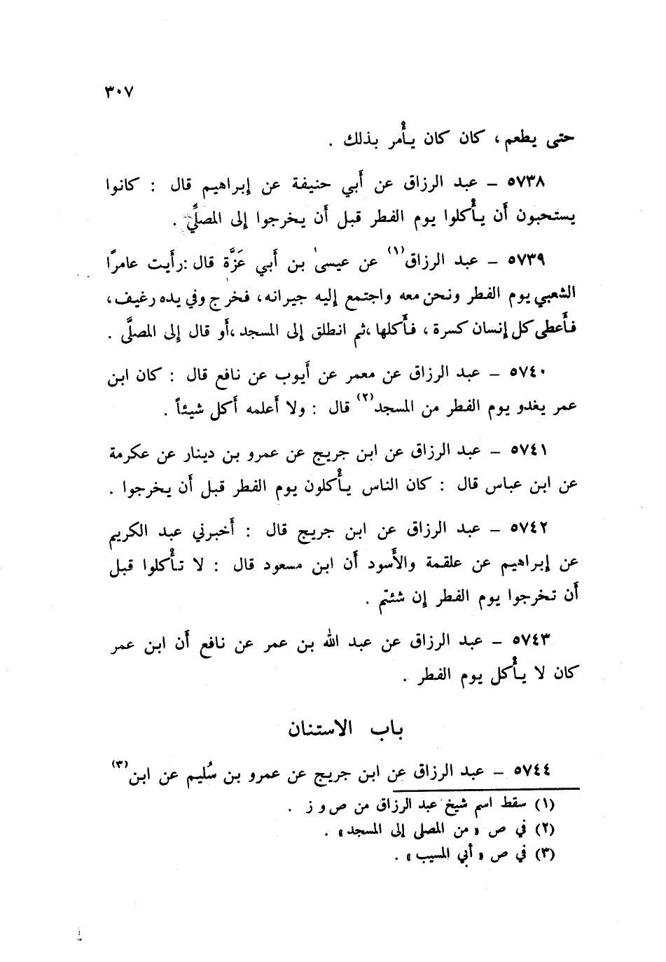 ٥٧٤٠ - عَنْ مَعْمَرٍ، عَنْ أَيُّوبَ، عَنْ نَافِعٍ قَالَ: «كَانَ ابْنُ عُمَرَ يَغْدُو يَوْمَ الْفِطْرِ مِنَ الْمَسْجِدِ» قَالَ: «وَلَا أَعْلَمُهُ أَكَلَ شَيْئًا»