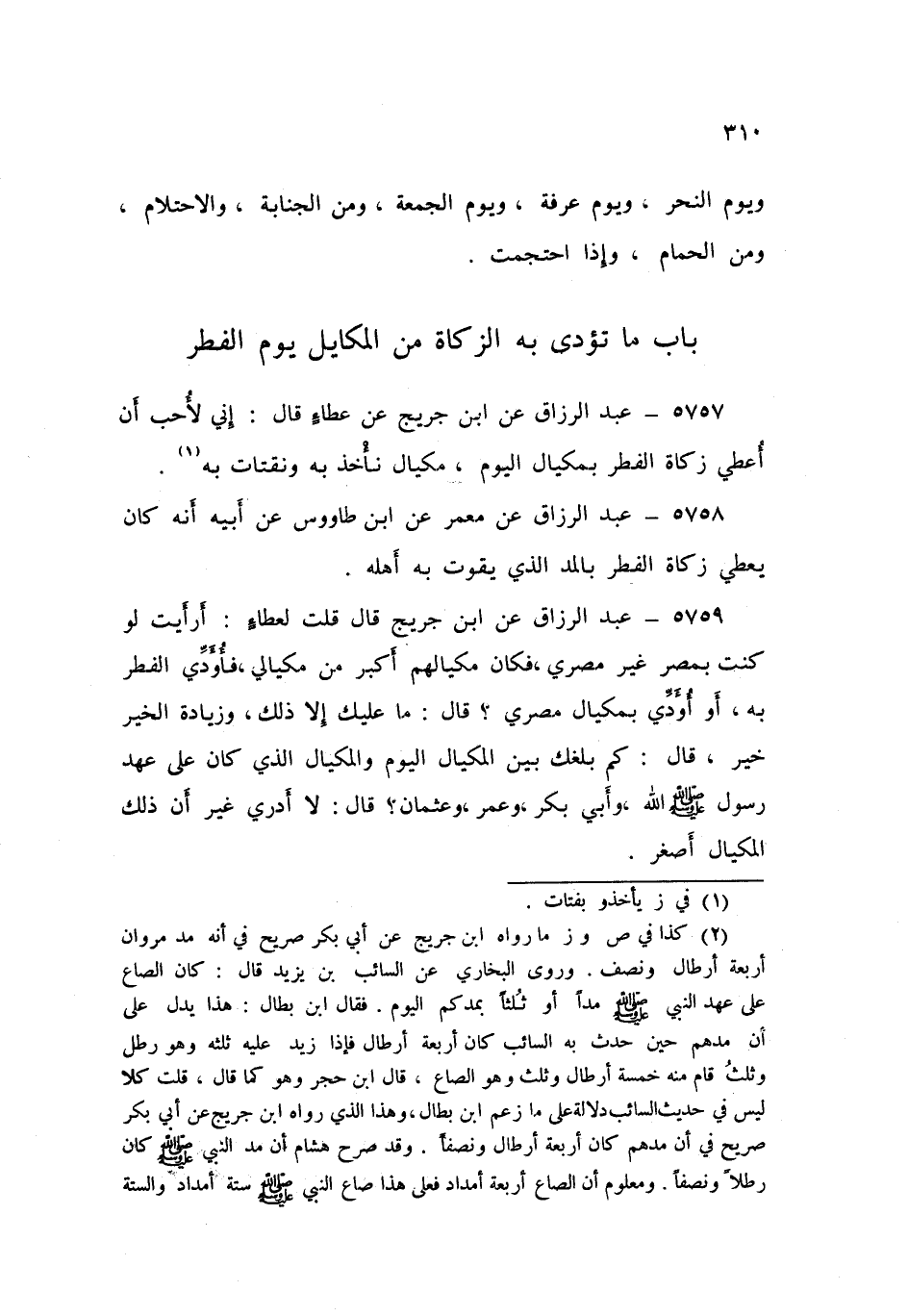 ٥٧٥٩ - عَنِ ابْنِ جُرَيْجٍ قَالَ: " قُلْتُ لِعَطَاءٍ: أَرَأَيْتَ لَوْ كُنْتُ بِمِصْرٍ غَيْرِ مِصْرِي فَكَانَ مِكْيَالُهُمْ أَكْبَرَ مِنْ مِكْيَالِي فَأُؤَدِّي الْفِطْرَ بِهِ - أَوْ أُؤَدِّي - بِمِكْيَالِ مِصْرِي؟ قَالَ: «مَا عَلَيْكَ إِلَّا ذَلِكَ، وَزِيَادَةُ الْخَيْرِ خَيْرٌ» قَالَ: كَمْ بَلَغَكَ بَيْنَ الْمِكْيَالِ الْيَوْمَ وَالْمِكْيَالِ الَّذِي كَانَ عَلَى عَهْدِ رَسُولِ اللَّهِ صَلَّى اللهُ عَلَيْهِ وَسَلَّمَ وَأَبِي بَكْرٍ وَعُمَرَ وَعُثْمَانَ؟ قَالَ: «لَا أَدْرِي غَيْرَ أَنَّ ذَلِكَ الْمِكْيَالَ أَصْغَرُ»