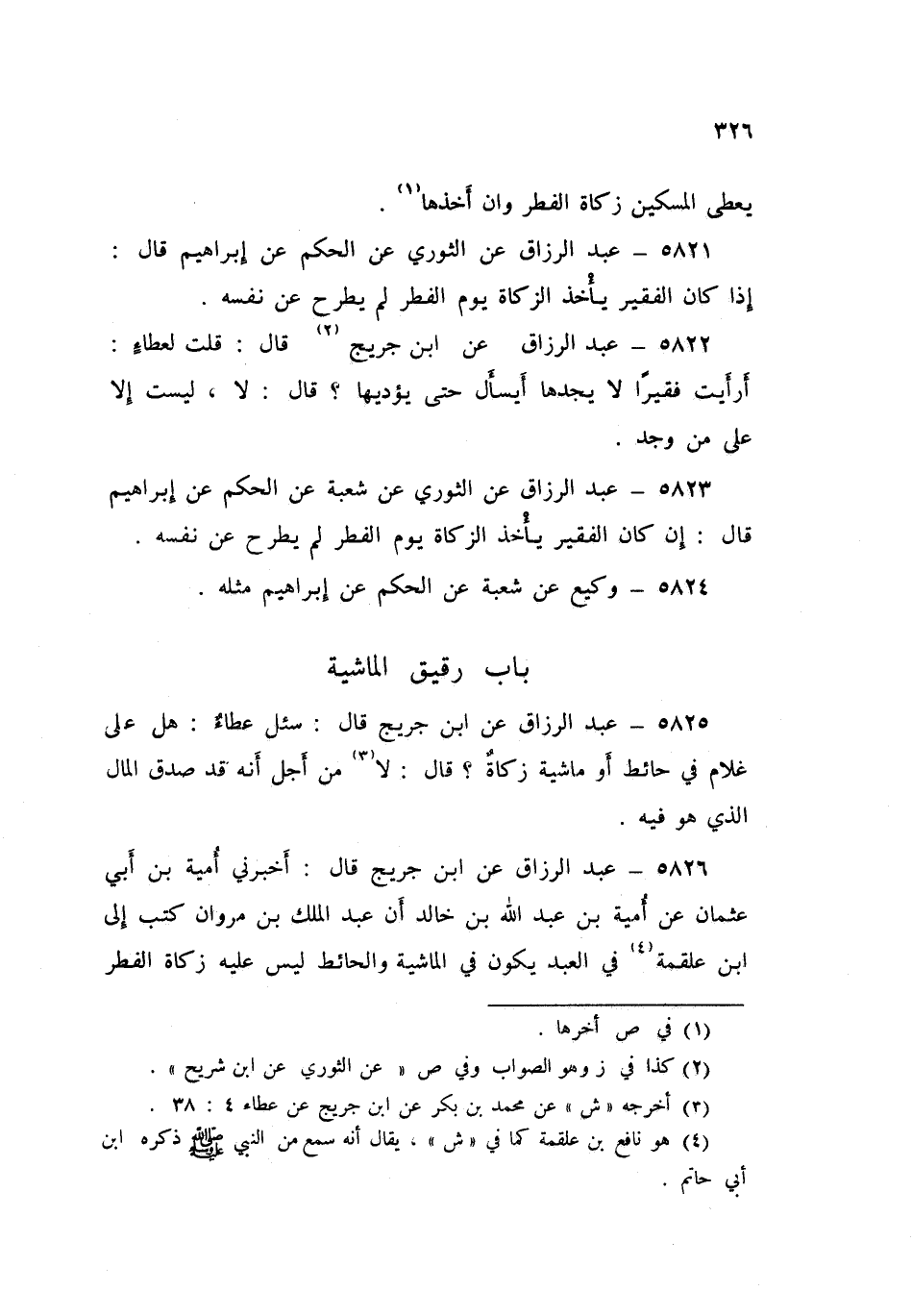 ٥٨٢٦ - عَنِ ابْنِ جُرَيْجٍ قَالَ: أَخْبَرَنِي أُمَيَّةُ بْنُ أَبِي عُثْمَانَ، عَنْ أُمَيَّةَ بْنِ عَبْدِ اللَّهِ بْنِ خَالِدٍ، أَنَّ عَبْدَ الْمَلِكِ بْنَ مَرْوَانَ كَتَبَ إِلَى ابْنِ عَلْقَمَةَ فِي الْعَبْدِ يَكُونُ فِي الْمَاشِيَةِ وَالْحَائِطِ لَيْسَ عَلَيْهِ زَكَاةُ الْفِطْرِ مِنْ أَجْلِ أَنَّ الْحَائِطَ وَالْمَاشِيَةَ الَّذِي هُوَ فِيهَا إِنَّمَا صُدِّقَتْ بِهِ "