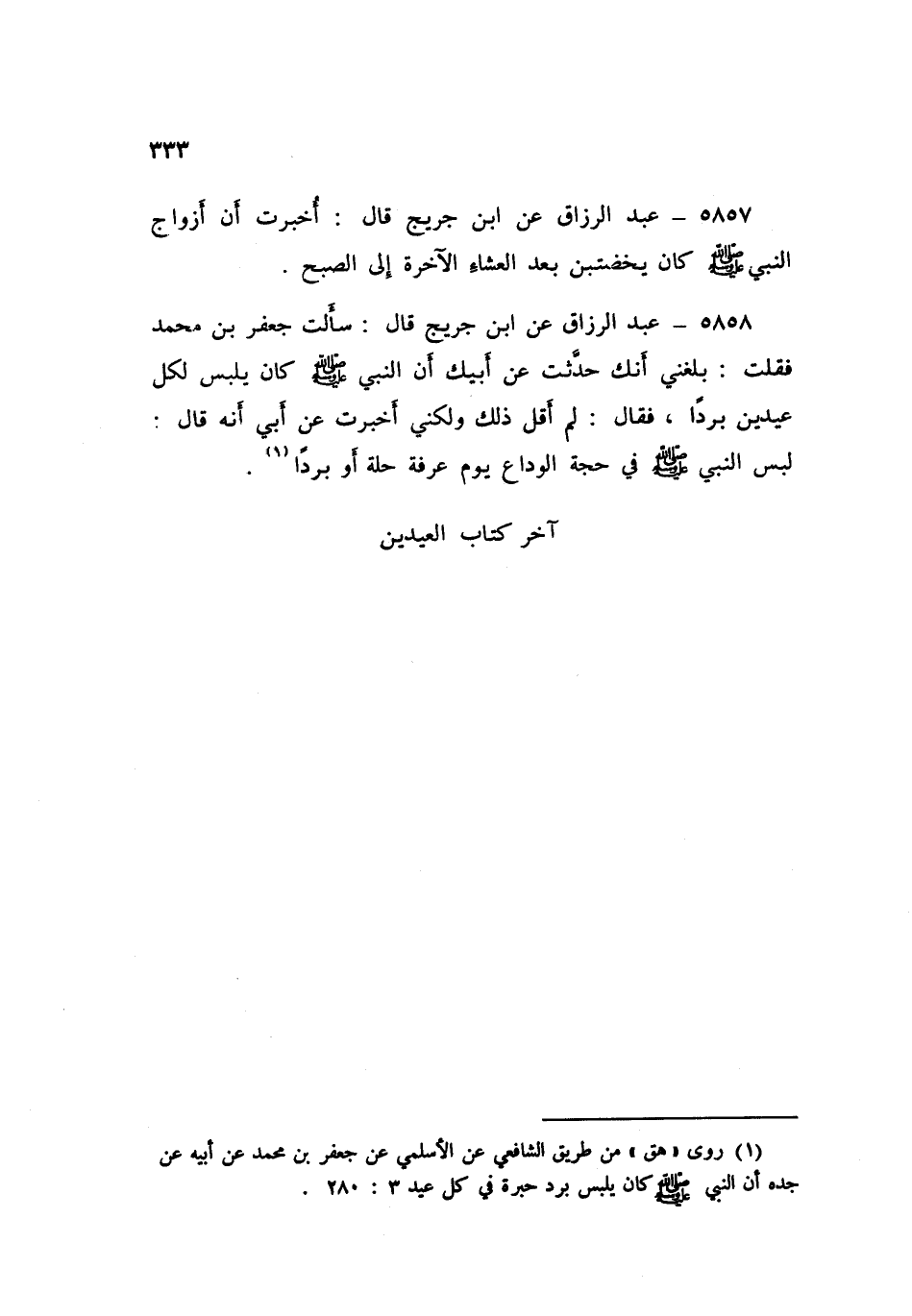 ٥٨٥٨ - عَنِ ابْنِ جُرَيْجٍ قَالَ: سَأَلْتُ جَعْفَرَ بْنَ مُحَمَّدٍ، فَقُلْتُ: بَلَغَنِي أَنَّكَ حَدَّثْتَ عَنْ أَبِيكَ، أَنَّ النَّبِيَّ صَلَّى اللهُ عَلَيْهِ وَسَلَّمَ كَانَ يَلْبِسُ لِكُلِّ عِيدَيْنِ بُرْدًا، فَقَالَ: لَمْ أَقُلْ ذَلِكَ، وَلَكِنِّي أُخْبِرْتُ عَنْ أَبِي أَنَّهُ قَالَ: «لَبِسَ النَّبِيُّ صَلَّى اللهُ عَلَيْهِ وَسَلَّمَ فِي حَجَّةِ الْوَدَاعِ يَوْمَ عَرَفَةَ حُلَّةً - أَوْ بُرْدًا -»