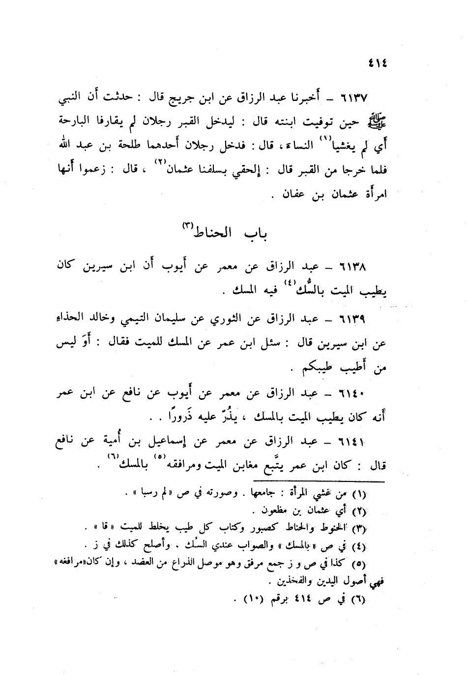 ٦١٣٨ - عَنْ مَعْمَرٍ، عَنْ أَيُّوبَ، أَنَّ ابْنَ سِيرِينَ، كَانَ يُطَيِّبُ الْمَيِّتَ بِالسُّكِّ فِيهِ الْمِسْكُ "