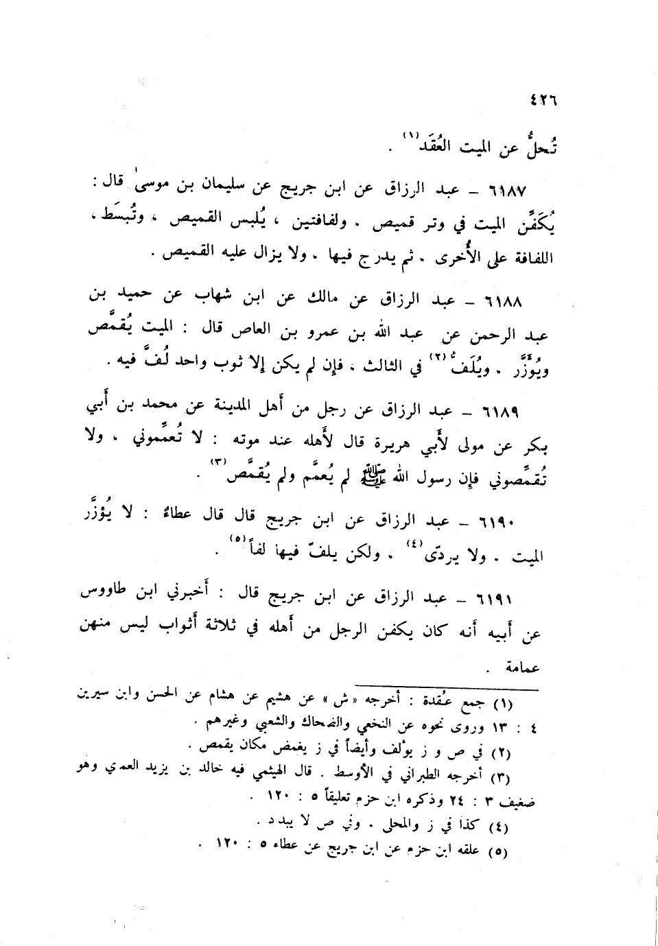 ٦١٩٠ - عَنِ ابْنِ جُرَيْجٍ قَالَ: قَالَ عَطَاءٌ «لَا يُؤَزَّرُ الْمَيِّتُ، وَلَا يُرَدَّى، وَلَكِنْ يُلَفُّ فِيهَا لَفًّا»