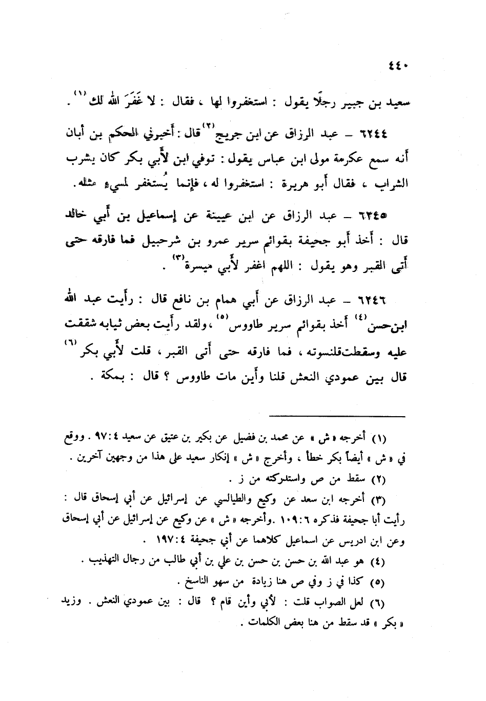 ٦٢٤٦ - عَنْ أَبِي هَمَّامِ بْنِ نَافِعٍ قَالَ: رَأَيْتُ عَبْدَ اللَّهِ بْنَ حَسَنٍ أَخَذَ بِقَوَائِمِ سَرِيرِ طَاوُسٍ، وَلَقَدْ رَأَيْتُ بَعْضَ ثِيَابِهِ شُقِّقَتْ عَلَيْهِ، وَسَقَطَتْ قَلَنْسُوَتُهُ، فَمَا فَارَقَهُ حَتَّى أَتَى الْقَبْرَ، قُلْتُ لِأَبِي بَكْرٍ قَالَ: «بَيْنَ عَمُودَيِ النَّعْشِ»، قُلْنَا: وَأَيْنَ مَاتَ طَاوُسٌ؟ قَالَ: «بِمَكَّةَ»