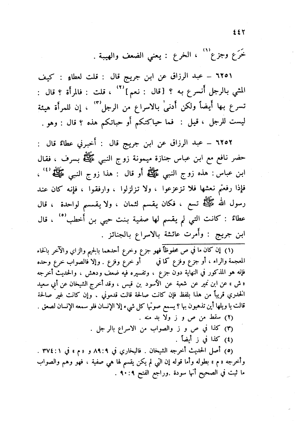 ٦٢٥٢ - عَنِ ابْنِ جُرَيْجٍ قَالَ: أَخْبَرَنِي عَطَاءٌ قَالَ: حَضَرَ نَافِعٌ مَعَ ابْنِ عَبَّاسٍ جِنَازَةَ مَيْمُونَةَ زَوْجِ النَّبِيِّ صَلَّى اللهُ عَلَيْهِ وَسَلَّمَ بِسَرِفَ، فَقَالَ ابْنُ عَبَّاسٍ: هَذِهِ زَوْجُ النَّبِيِّ صَلَّى اللهُ عَلَيْهِ وَسَلَّمَ أَوْ قَالَ: «هَذَا زَوْجُ النَّبِيِّ صَلَّى اللهُ عَلَيْهِ وَسَلَّمَ فَإِذَا رفَعْتُمْ نَعْشَهَا فَلَا تُزَعْزِعُوا، وَلَا تُزَلْزِلُوا، وَارْفُقُوا، فَإِنَّهُ كَانَ عِنْدَ رَسُولِ اللَّهِ صَلَّى اللهُ عَلَيْهِ وَسَلَّمَ تِسْعٌ فَكَانَ يَقْسِمُ لِثَمَانٍ وَلَا يَقْسِمُ لِوَاحِدَةٍ»، قَالَ عَطَاءٌ: كَانَتِ الَّتِي لَمْ يَقْسِمْ لَهَا صَفِيَّةُ بِنْتُ حُيَيِّ بْنِ أَخْطَبَ، قَالَ ابْنُ جُرَيْجٍ: وَأَمَرَتْ عَائِشَةُ بِالْإِسْرَاعِ بِالْجَنَائِزِ