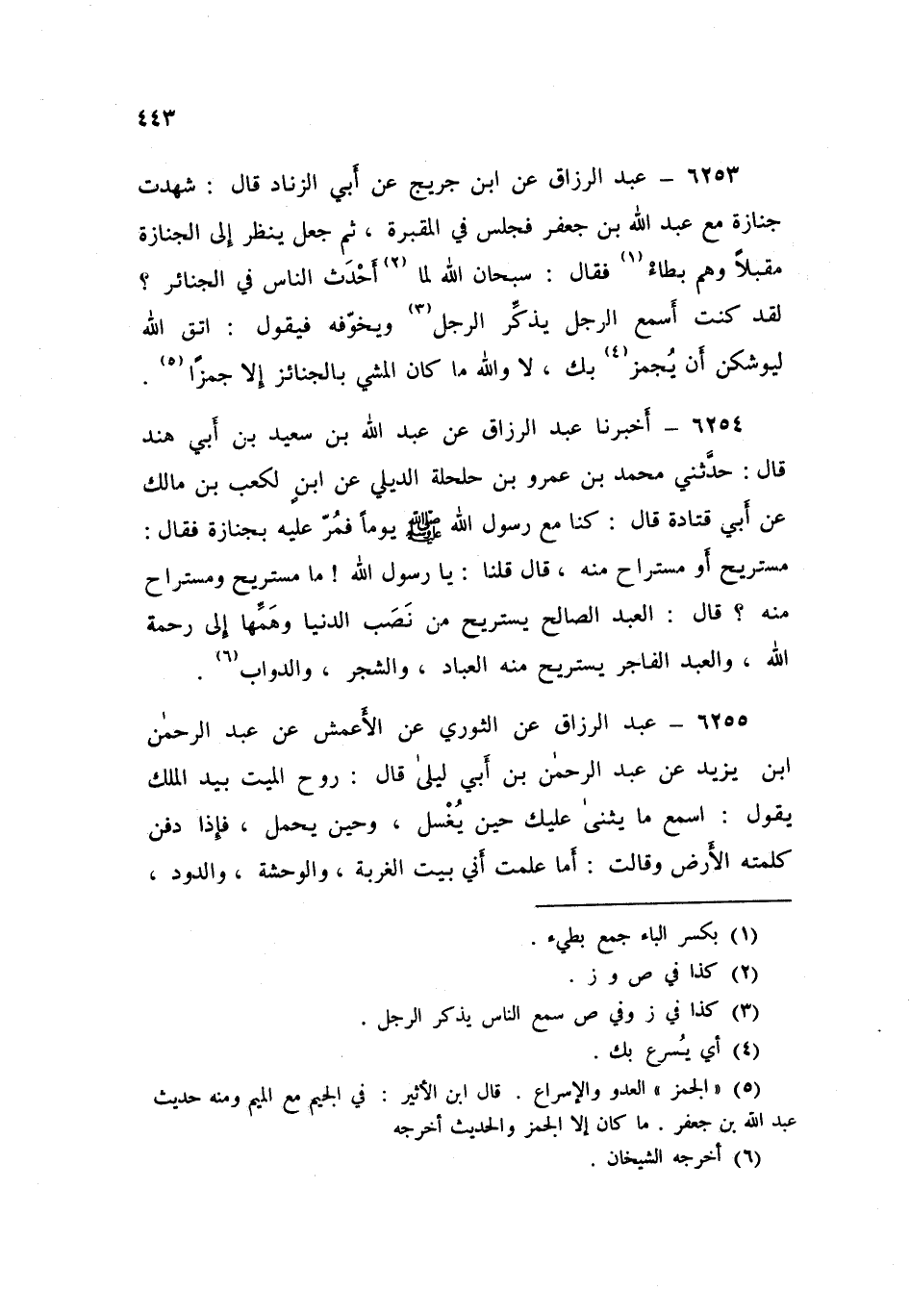 ٦٢٥٤ - أَخْبَرَنَا عَبْدُ الرَّزَّاقِ، عَنْ عَبْدِ اللَّهِ بْنِ سَعِيدِ بْنِ أَبِي هِنْدَ قَالَ: حَدَّثَنِي مُحَمَّدُ بْنُ عَمْرِو بْنِ حَلْحَلَةَ الدَّيْلِيُّ، عَنِ ابْنٍ لِكَعْبِ بْنِ مَالِكٍ، عَنْ أَبِي قَتَادَةَ قَالَ: كُنَّا مَعَ رَسُولِ اللَّهِ صَلَّى اللهُ عَلَيْهِ وَسَلَّمَ يَوْمًا فَمُرَّ عَلَيْهِ بِجِنَازَةٍ، فَقَالَ: «مُسْتَرِيحُ، أَوْ مُسْتَرَاحٌ مِنْهُ» قَالَ: قُلْنَا: يَا رَسُولَ اللَّهِ، مَا مُسْتَرِيحُ وَمُسْتَرَاحُ مِنْهُ؟ قَالَ: «الْعَبْدُ الصَّالِحُ يَسْتَرِيحُ مِنْ نَصَبِ الدُّنْيَا وَهَمِّهَا إِلَى رَحْمَةِ اللَّهِ، وَالْعَبْدُ الْفَاجِرُ يَسْتَرِيحُ مِنْهُ الْعِبَادُ وَالشَّجَرُ وَالدَّوَابُّ»