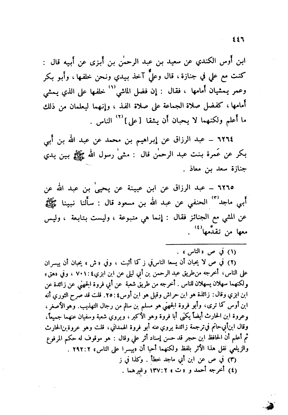 ٦٢٦٥ - عَنِ ابْنِ عُيَيْنَةَ، عَنْ يَحْيَى بْنِ عَبْدِ اللَّهِ، عَنْ أَبِي مَاجِدٍ الْحَنَفِيِّ، عَنْ عَبْدِ اللَّهِ بْنِ مَسْعُودٍ قَالَ: سَأَلْنَا نَبِيَّنَا صَلَّى اللهُ عَلَيْهِ وَسَلَّمَ عَنِ الْمَشْيِ مَعَ الْجَنَائِزِ فَقَالَ: «إِنَّمَا هِيَ مَتْبُوعَةٌ وَلَيْسَتْ بِتَابِعَةٍ، وَلَيْسَ مَعَهَا مَنْ تَقَدَّمَهَا»