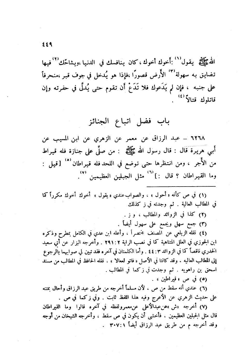 ٦٢٦٨ - عَنْ مَعْمَرٍ، عَنِ الزُّهْرِيُّ، عَنِ ابْنِ الْمُسَيِّبِ، عَنْ أَبِي هُرَيْرَةَ قَالَ: قَالَ رَسُولُ اللَّهِ صَلَّى اللهُ عَلَيْهِ وَسَلَّمَ: «مَنْ صَلَّى عَلَى جِنَازَةَ فَلَهُ قِيرَاطٌ مِنَ الْأَجْرِ، وَمَنِ انْتَظَرَهَا حَتَّى تُوضَعَ فِي اللَّحْدِ فَلَهُ قِيرَاطَانِ» قِيلَ: وَمَا الْقِيرَاطَانِ؟ قَالَ: «مِثْلُ الْجَبَلَيْنِ الْعَظِيمَيْنِ»