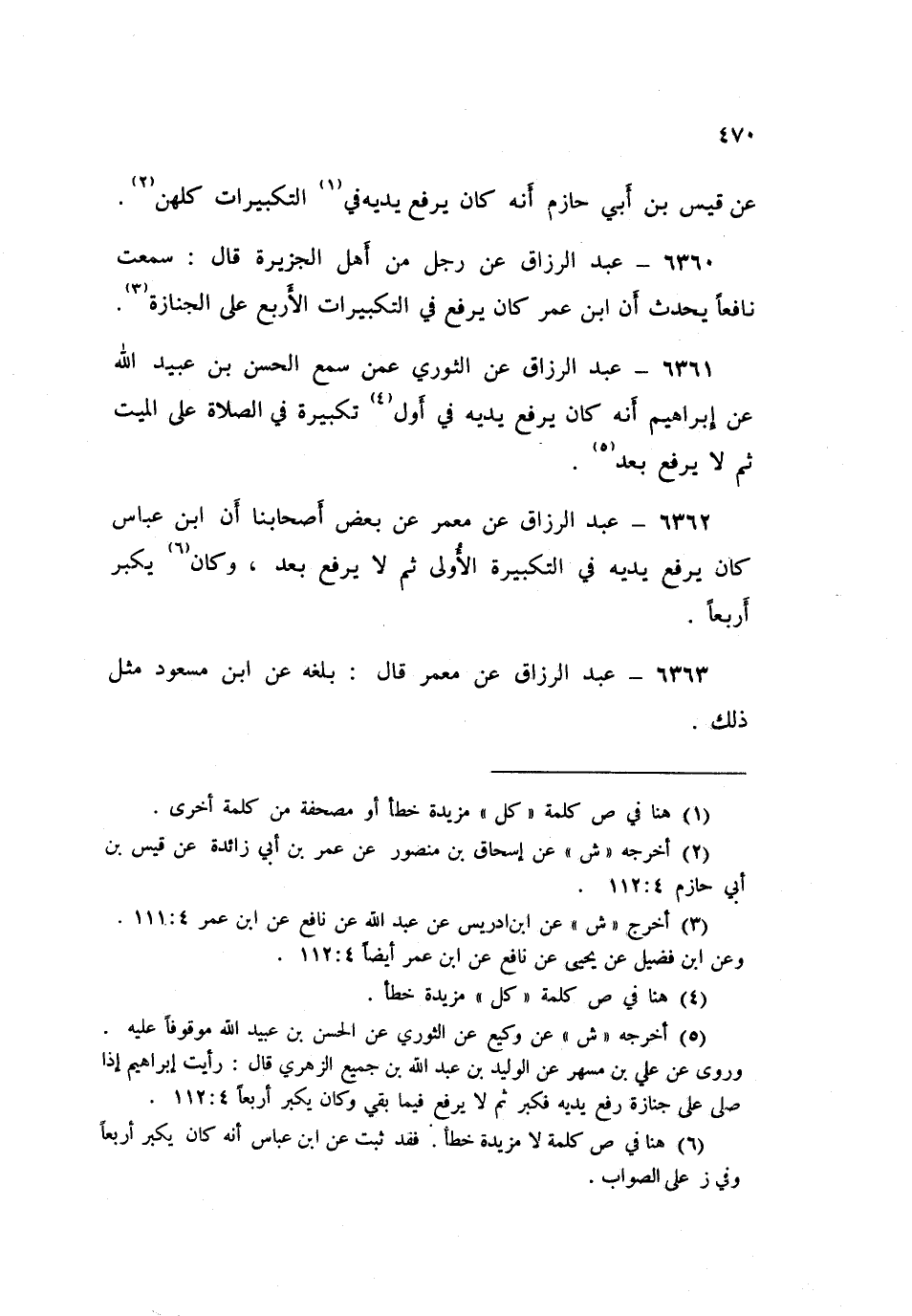 ٦٣٦٢ - عَنْ مَعْمَرٍ، عَنْ بَعْضِ أَصْحَابِنَا أَنَّ ابْنَ عَبَّاسٍ كَانَ يَرْفَعُ يَدَيْهِ فِي التَّكْبِيرَةِ الْأُولَى، ثُمَّ لَا يَرْفَعُ بَعْدُ، وَكَانَ يُكَبِّرُ أَرْبَعًا "، عَبْدُ الرَّزَّاقِ،