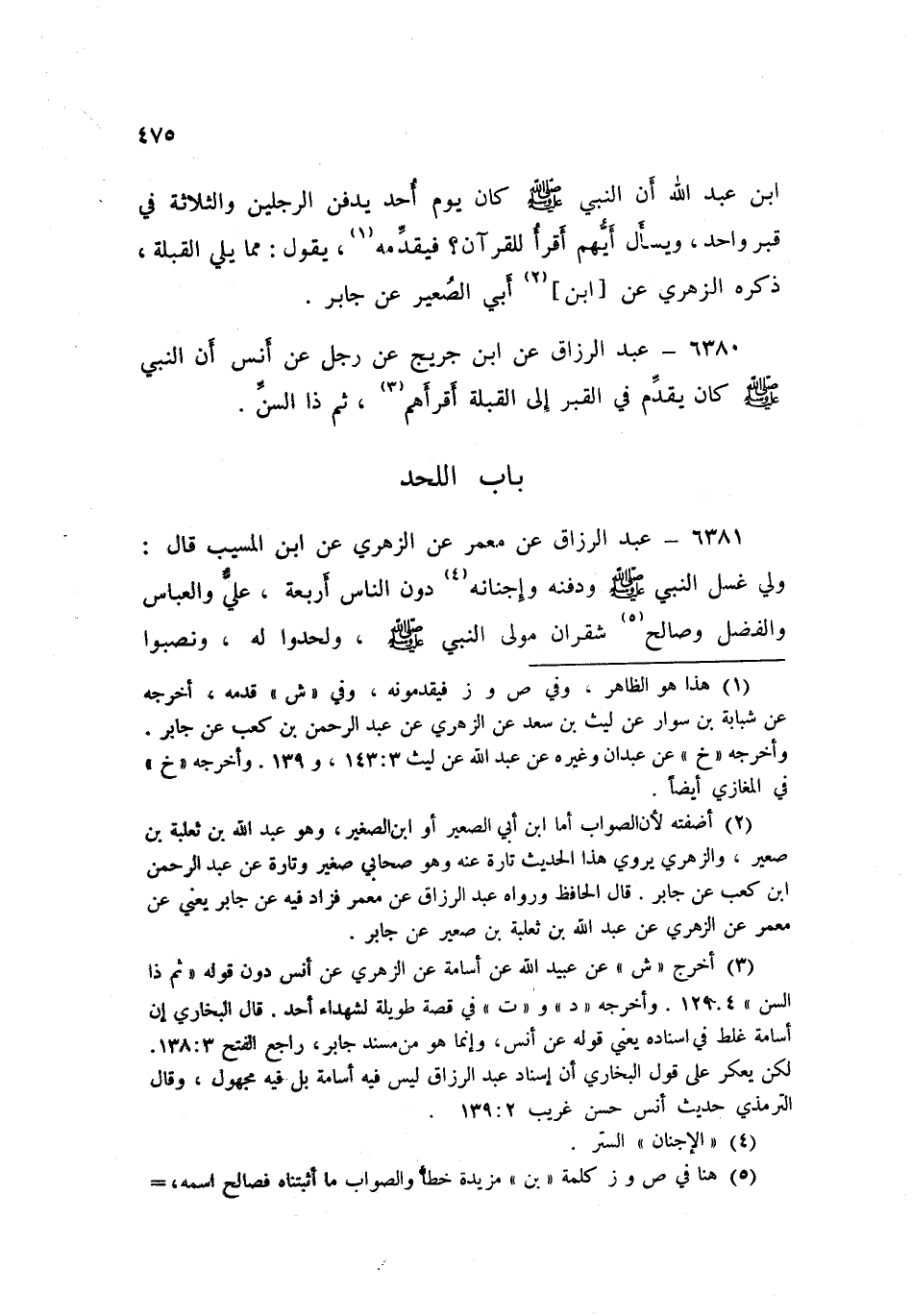 ٦٣٨١ - عَنْ مَعْمَرٍ، عَنِ الزُّهْرِيِّ، عَنِ ابْنِ الْمُسَيِّبِ قَالَ: " وَلِيَ غُسْلَ النَّبِيِّ صَلَّى اللهُ عَلَيْهِ وَسَلَّمَ وَدَفْنَهُ وَإِجْنَانَهُ دُونَ النَّاسِ أَرْبَعَةٌ: عَلِيٌّ وَالْعَبَّاسُ وَالْفَضْلُ وَصَالِحٌ شُقْرَانَ مَوْلَى النَّبِيِّ صَلَّى اللهُ عَلَيْهِ وَسَلَّمَ وَلَحَدُوا لَهُ، وَنَصَبُوا عَلَيْهِ اللَّبِنَ نَصْبًا "