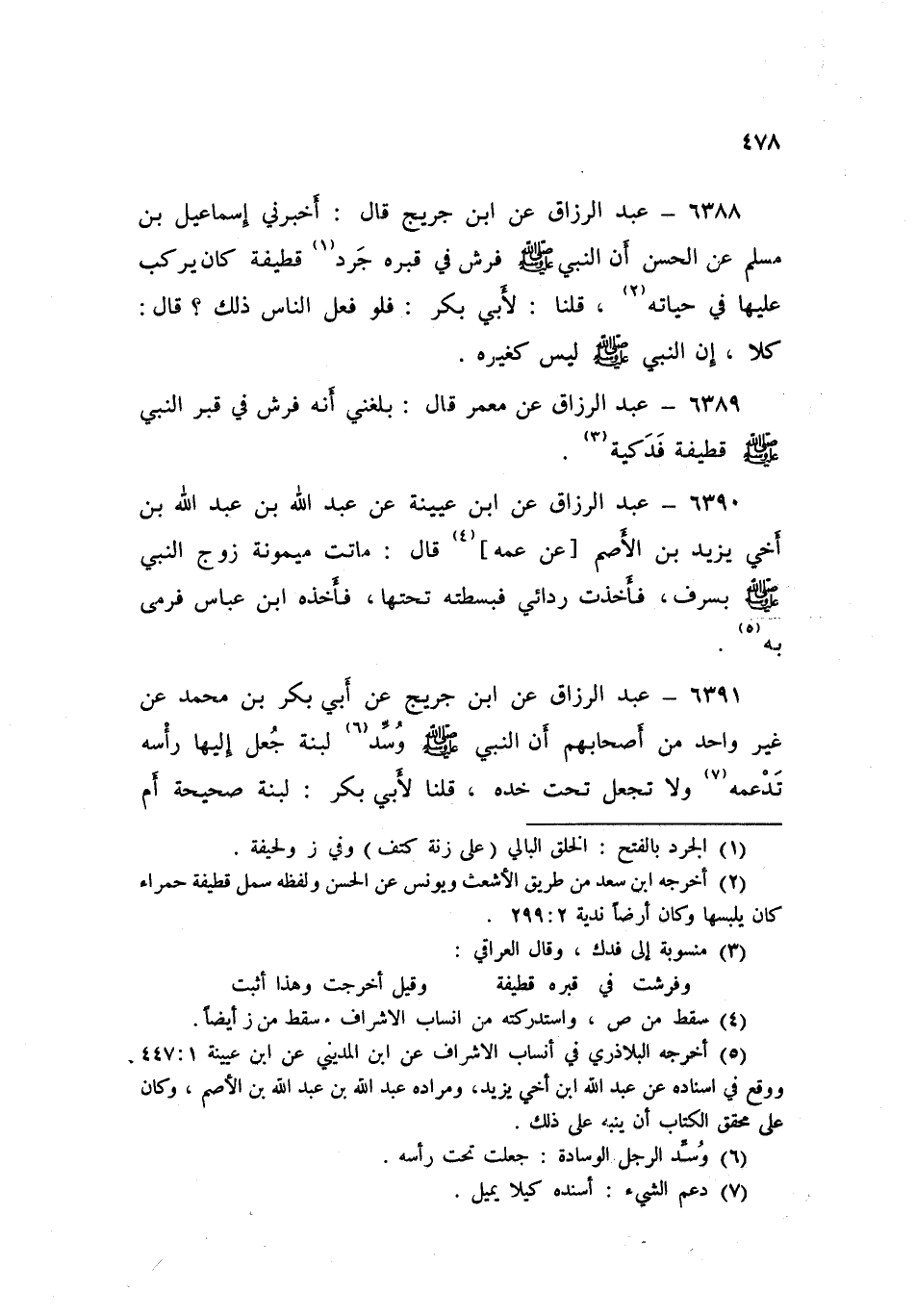 ٦٣٩١ - عَنِ ابْنِ جُرَيْجٍ، عَنْ أَبِي بَكْرِ بْنِ مُحَمَّدٍ، عَنْ غَيْرِ وَاحِدٍ، مِنْ أَصْحَابِهِمْ: «أَنَّ النَّبِيَّ صَلَّى اللهُ عَلَيْهِ وَسَلَّمَ وُسِّدَ لَبِنَةً جُعِلَ إِلَيْهَا رَأْسُهُ تَدْعَمُهُ وَلَا تُجْعَلُ تَحْتَ خَدِّهِ»، قُلْنَا لِأَبِي بَكْرٍ: لَبِنَةٌ صَحِيحَةٌ أَمْ كُسَيْرَةٌ؟ قَالَ: بَلْ لَبِنَةٌ