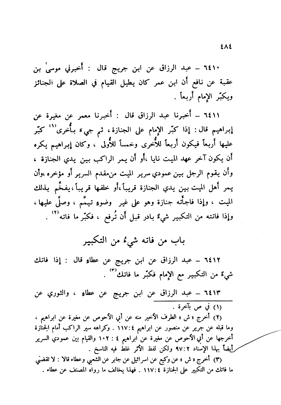 ٦٤١١ - عَبْدُ الرَّزَّاقِ قَالَ: أَخْبَرَنَا مَعْمَرٌ، عَنْ مُغِيرَةَ، عَنْ إِبْرَاهِيمَ قَالَ: «إِذَا كَبَّرَ الْإِمَامُ عَلَى الْجِنَازَةِ ثُمَّ جِيءَ بِأُخْرَى كَبَّرَ عَلَيْهَا أَرْبَعًا، فَيَكُونُ أَرْبَعًا لِلْأُخْرَى وَخَمْسًا لِلْأُولَى»، وَكَانَ إِبْرَاهِيمُ «يَكْرَهُ أَنْ يَكُونَ آخِرَ عَهْدِ الْمَيِّتِ نَايًا، أَوْ أَنْ يَمُرَّ الرَّاكِبُ بَيْنَ يَدَيِ الْجِنَازَةَ، وَأَنْ يَقُومَ الرَّجُلُ بَيْنَ عَمُودَيْ سَرِيرِ الْمَيِّتِ مِنْ مُقَدَّمِ السَّرِيرِ أَوْ مُؤَخَّرِهِ، وَأَنْ يَمُرَّ أَهْلُ الْمَيِّتِ بَيْنَ يَدَيِ الْجِنَازَةِ قَرِيبًا أَوْ خَلْفَهَا قَرِيبًا، يُفَخِّمُ بِذَلِكَ الْمَيِّتَ، وَإِذَا فَاجَأَتْهُ جِنَازَةٌ وَهُوَ عَلَى غَيْرِ وُضُوءٍ تَيَمَّمَ وَصَلَّى عَلَيْهَا، وَإِذَا فَاتَتْهُ مِنَ التَّكْبِيرِ شَيْءٌ بَادَرَ قَبْلَ أَنْ تُرْفَعَ فَكَبَّرَ مَا فَاتَهُ»
