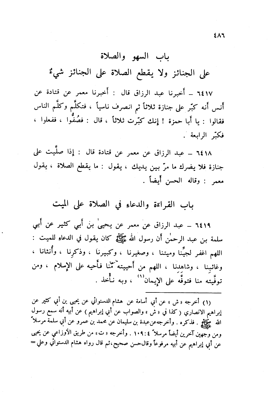 ٦٤١٩ - عَنْ مَعْمَرٍ، عَنْ يَحْيَى بْنِ أَبِي كَثِيرٍ، عَنْ أَبِي سَلَمَةَ بْنِ عَبْدِ الرَّحْمَنِ، أَنَّ رَسُولَ اللَّهِ صَلَّى اللهُ عَلَيْهِ وَسَلَّمَ كَانَ يَقُولُ فِي الدُّعَاءِ لِلْمَيِّتِ: «اللَّهُمَّ اغْفِرْ لِحَيِّنَا وَمَيِّتِنَا، وَصَغِيرِنَا وَكَبِيرِنَا، وَذَكَرِنَا وَأُنْثَانَا، وَغَائِبِنَا وَشَاهِدِنَا، اللَّهُمَّ مَنْ أَحْيَيْتَهُ مِنَّا فَأَحْيِهِ عَلَى الْإِسْلَامِ، وَمَنْ تَوَفَّيْتَهُ مِنَّا فَتَوَفَّهُ عَلَى الْإِيمَانِ» وَبِهِ نَأْخُذُ
