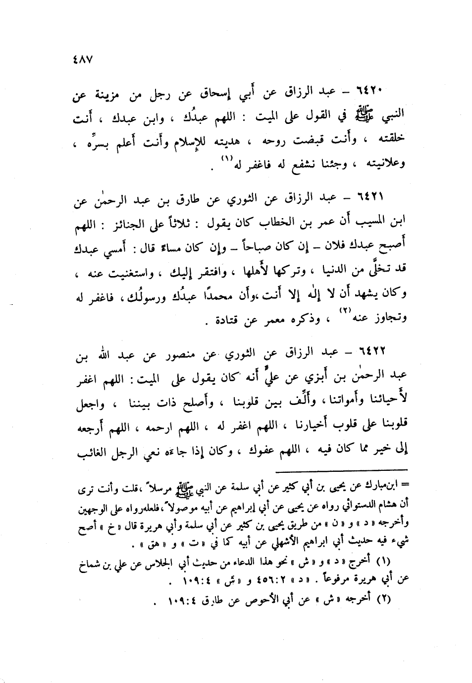 ٦٤٢١ - عَنِ الثَّوْرِيِّ، عَنْ طَارِقِ بْنِ عَبْدِ الرَّحْمَنِ، عَنِ ابْنِ الْمُسَيِّبِ، أَنَّ عُمَرَ بْنَ الْخَطَّابِ، كَانَ يَقُولُ ثَلَاثًا عَلَى الْجَنَائِزِ: «اللَّهُمَّ أَصْبَحَ عَبْدُكَ فُلَانٌ، إِنْ كَانَ صَبَاحًا، وَإِنْ كَانَ مَسَاءً» قَالَ: " أَمْسَى عَبْدُكَ قَدْ تَخَلَّى مِنَ الدُّنْيَا وَتَرَكَهَا لِأَهْلِهَا، وَافْتَقَرَ إِلَيْكَ وَاسْتَغْنَيْتَ عَنْهُ، وَكَانَ يَشْهَدُ أَنْ لَا إِلَهَ إِلَّا أَنْتَ وَأَنَّ مُحَمَّدًا عَبْدُكَ وَرَسُولُكَ فَاغْفِرْ لَهُ، وَتَجَاوَزْ عَنْهُ، وَذَكَرَهُ مَعْمَرٌ عَنْ قَتَادَةَ