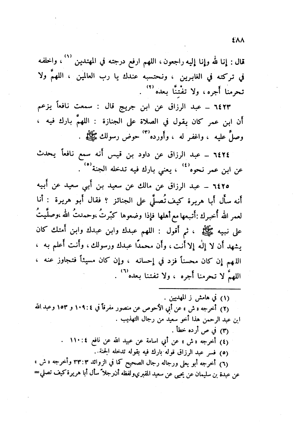 ٦٤٢٥ - عَنْ مَالِكٍ، عَنْ سَعِيدِ بْنِ أَبِي سَعِيدٍ، عَنْ أَبِيهِ، أَنَّهُ سَأَلَ أَبَا هُرَيْرَةَ: كَيْفَ تُصَلِّي عَلَى الْجَنَائِزِ؟ فَقَالَ أَبُو هُرَيْرَةَ: أَنَا لَعُمَرُ اللَّهِ أُخْبِرُكَ: أتَّبِعُهَا مَعَ أَهْلِهَا، فَإِذَا وَضَعُوهَا كَبَّرْتُ وَحَمِدْتُ اللَّهَ وَصَلَّيْتُ عَلَى نَبِيِّهِ صَلَّى اللهُ عَلَيْهِ وَسَلَّمَ ثُمَّ أَقُولُ: «اللَّهُمَّ عَبْدُكَ وَابْنُ عَبْدُكَ وَابْنُ أَمَتِكَ، كَانَ يَشْهَدُ أَنْ لَا إِلَهَ إِلَّا أَنْتَ وَأَنَّ مُحَمَّدًا عَبْدُكَ وَرَسُولُكَ، وَأَنْتَ أَعْلَمُ بِهِ، اللَّهُمَّ إِنْ كَانَ مُحْسِنًا فَزِدْ فِي إِحْسَانِهِ، وَإِنْ كَانَ مُسِيئًا فَتَجَاوَزْ عَنْهُ، اللَّهُمَّ لَا تَحْرِمْنَا أَجْرَهُ وَلَا تَفْتِنَّا بَعْدهُ»