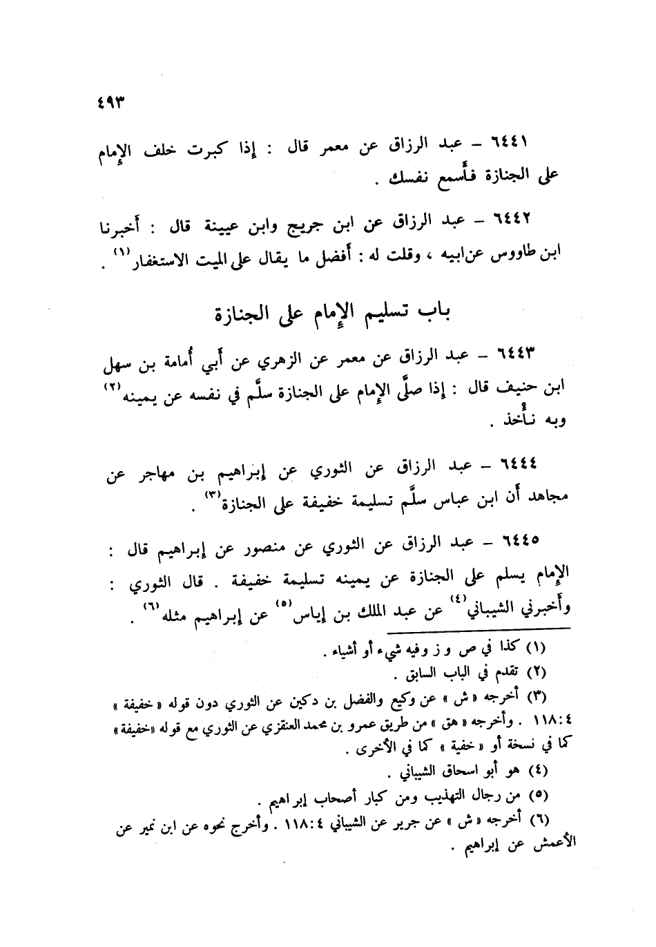 ٦٤٤٥ - عَنِ الثَّوْرِيِّ، عَنْ مَنْصُورٍ، عَنْ إِبْرَاهِيمَ قَالَ: «الْإِمَامُ يُسَلِّمُ عَلَى الْجِنَازَةِ، عَنْ يَمِينِهِ تَسْلِيمَةً خَفِيفَةً»، قَالَ الثَّوْرِيُّ وَأَخْبَرَنِي الشَّيْبَانِيُّ، عَنْ عَبْدِ الْمَلِكِ بْنِ إِيَاسٍ، عَنْ إِبْرَاهِيمَ مِثْلَهُ