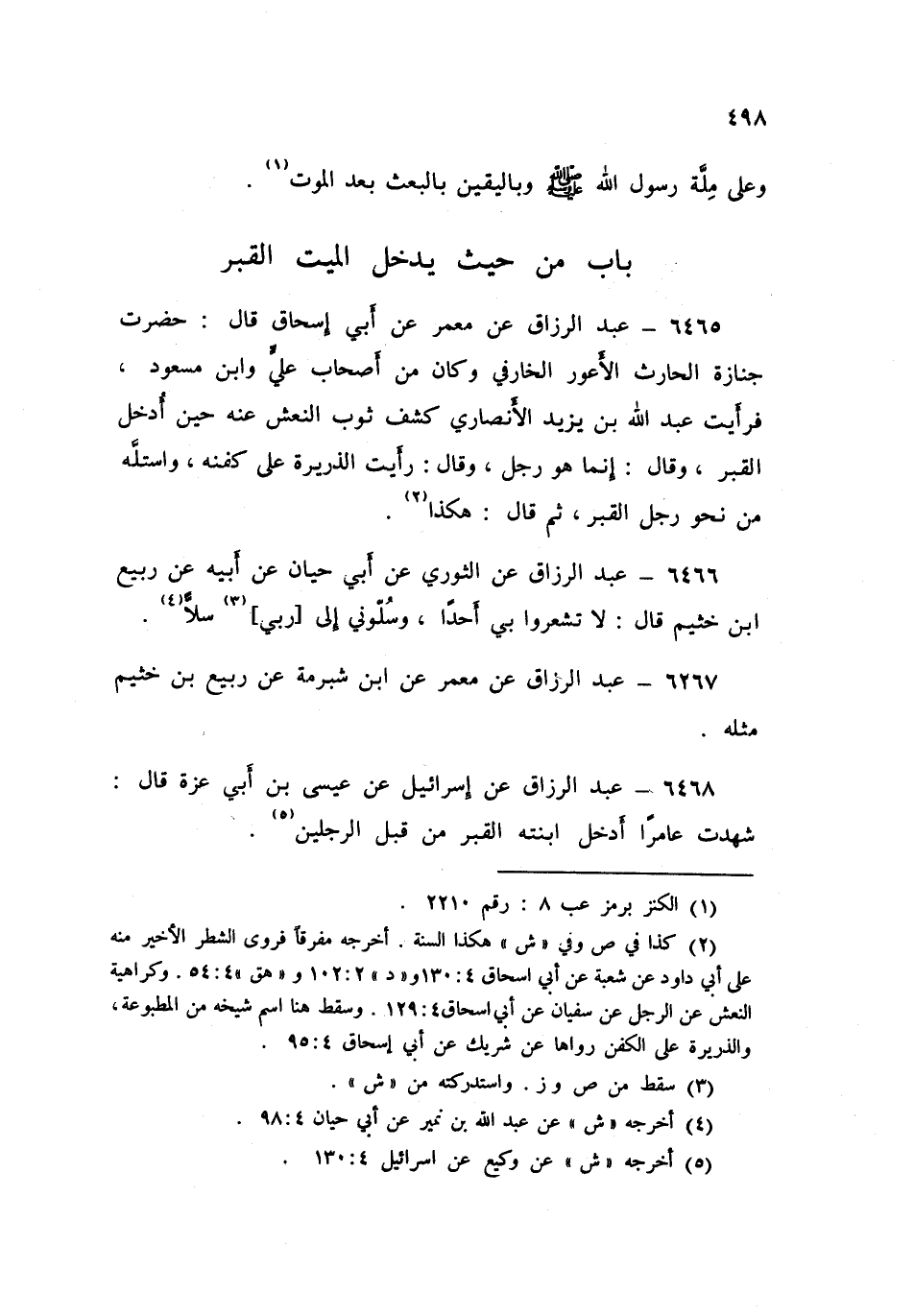 ٦٤٦٥ - عَنْ مَعْمَرٍ، عَنْ أَبِي إِسْحَاقَ قَالَ: حَضَرْتُ جِنَازَةَ الْحَارِثِ الْأَعْوَرِ الْخَارِفِيِّ وَكَانَ مِنْ أَصْحَابِ عَلِيٍّ، وَابْنِ مَسْعُودٍ، فَرَأَيْتُ عَبْدَ اللَّهِ بْنَ يَزِيدَ الْأَنْصَارِيَّ كَشَفَ ثَوْبَ النَّعْشِ عَنْهُ حِينَ أُدْخِلَ الْقَبْرَ، وَقَالَ: «إِنَّمَا هُوَ رَجُلٌ»، وَقَالَ: «رَأَيْتُ الذَّرِيرَةَ عَلَى كَفَنِهِ، وَاسْتَلَّهُ مِنْ نَحْوِ رَجُلِ الْقَبْرِ»، ثُمَّ قَالَ: «هَكَذَا»