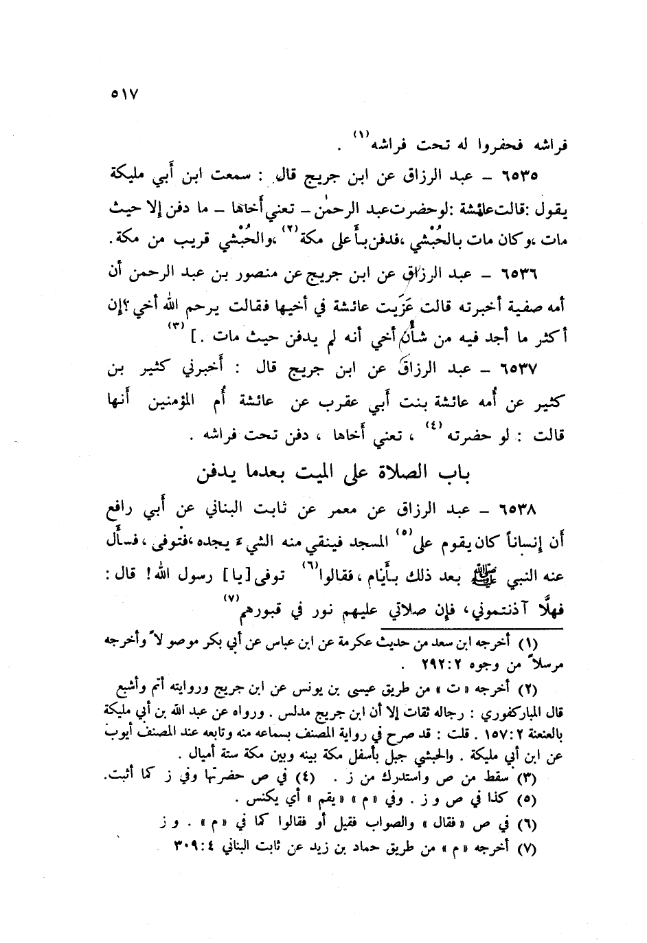 ٦٥٣٩ - عَنْ مَعْمَرٍ، عَنْ أَيُّوبَ، عَنِ ابْنِ أَبِي مُلَيْكَةَ قَالَ: تُوُفِّيَ عَبْدُ الرَّحْمَنِ بْنُ أَبِي بَكْرٍ عَلَى سِتَّةِ أَمْيَالٍ مِنْ مَكَّةَ فَحَمَلْنَاهُ حَتَّى جِئْنَا بِهِ إِلَى مَكَّةَ فَدَفَنَّاهُ فَقَدِمَتْ عَلَيْنَا عَائِشَةُ بَعْدَ ذَلِكَ فَعَابَتْ ذَلِكَ عَلَيْنَا، ثُمَّ قَالَتْ: «أَيْنَ قَبْرُ أَخِي؟ فَدَلَلْنَاهَا عَلَيْهِ فَوُضِعَتْ فِي هَوْدَجِهَا عِنْدَ قَبْرِهِ فَصَلَّتْ عَلَيْهِ»