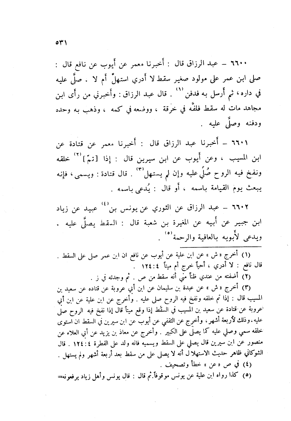 ٦٦٠١ - عَبْدُ الرَّزَّاقِ قَالَ: أَخْبَرَنَا مَعْمَرٌ، عَنْ قَتَادَةَ، عَنِ ابْنِ الْمُسَيِّبِ، وَعَنْ أَيُّوبَ، عَنِ ابْنِ سِيرِينَ قَالَ: «إِذَا تَمَّ خَلْقُهُ وَنُفِخَ فِيهِ الرُّوحُ صُلِّيَ عَلَيْهِ وَإِنْ لَمْ يَسْتَهِلَّ». قَالَ قَتَادَةُ: وَيُسَمَّى، فَإِنَّهُ يُبْعَثُ يَوْمَ الْقِيَامَةِ بِاسْمِهِ - أَوْ قَالَ -: يُدْعَى بِاسْمِهِ "