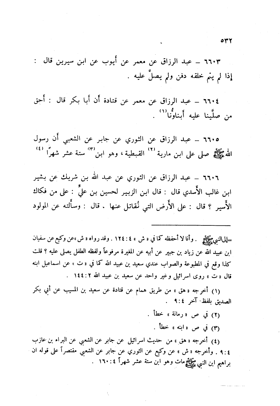 ٦٦٠٥ - عَنِ الثَّوْرِيِّ، عَنْ جَابِرٍ، عَنِ الشَّعْبِيِّ، أَنَّ رَسُولَ اللَّهِ صَلَّى اللهُ عَلَيْهِ وَسَلَّمَ «صَلَّى عَلَى ابْنِ مَارِيَةَ الْقِبْطِيَّةِ وَهُوَ ابْنُ سِتَّةَ عَشَرَ شَهْرً»
