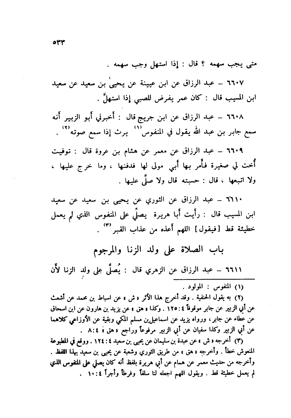 ٦٦١٢ - عَنِ الثَّوْرِيِّ، عَنْ جَابِرٍ، عَنْ أَبِي النُّعْمَانِ، عَنْ عَمْرِو بْنِ يَحْيَى قَالَ: «صَلَّى رَسُولُ اللَّهِ صَلَّى اللهُ عَلَيْهِ وَسَلَّمَ عَلَى وَلَدِ الزِّنَا وَأُمُّهُ مَاتَتْ فِي نِفَاسِهَا»