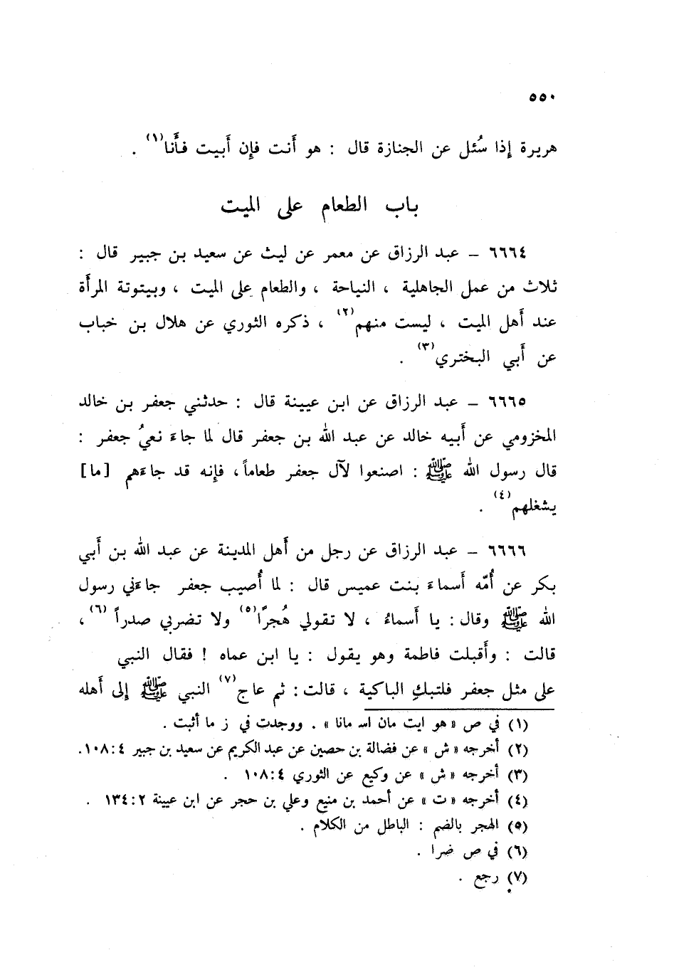 ٦٦٦٦ - عَنْ رَجُلٍ، مِنْ أَهْلِ الْمَدِينَةِ، عَنْ عَبْدِ اللَّهِ بْنِ أَبِي بَكْرٍ، عَنْ أُمِّهِ أَسْمَاءَ بِنْتِ عُمَيْسٍ قَالَتْ: لَمَّا أُصِيبَ جَعْفَرٌ جَاءَنِي رَسُولُ اللَّهِ صَلَّى اللهُ عَلَيْهِ وَسَلَّمَ وَقَالَ: «يَا أَسْمَاءُ لَا تَقُولِي هُجْرًا، وَلَا تَضْرِبِي صَدْرًا» قَالَتْ: وَأَقْبَلَتْ فَاطِمَةُ وَهُوَ يَقُولُ: «يَا ابْنَ عَمَّاهُ» فَقَالَ النَّبِيُّ صَلَّى اللهُ عَلَيْهِ وَسَلَّمَ: «عَلَى مِثْلِ جَعْفَرٍ فَلْتَبْكِ الْبَاكِيَةُ» قَالَتْ: ثُمَّ عَاجَ النَّبِيُّ صَلَّى اللهُ عَلَيْهِ وَسَلَّمَ إِلَى أَهْلِهِ فَقَالَ: «اصْنَعُوا لِآلِ جَعْفَرٍ طَعَامًا، فَقَدْ شُغِلُوا الْيَوْمَ». قَالَ: وَأَخْبَرَنِي عَبْدُ اللَّهِ بْنُ أَبِي بَكْرٍ، عَنْ سَوْدَةَ ابْنَةِ حَارِثَةَ امْرَأَةِ عَمْرِو بْنِ حَزْمٍ قَالَتْ: «قَدْ كَانَ يُؤْمَرُ أَنْ نَصْنَعَ لِأَهْلِ الْمَيِّتِ طَعَامًا»