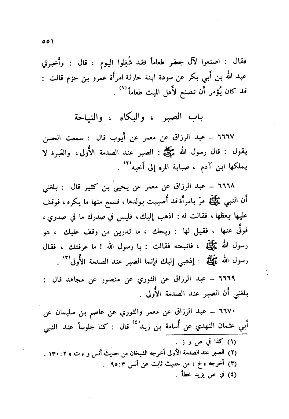 ٦٦٦٨ - عَنْ مَعْمَرٍ، عَنْ يَحْيَى بْنِ كَثِيرٍ قَالَ: بَلَغَنِي أَنَّ النَّبِيَّ صَلَّى اللهُ عَلَيْهِ وَسَلَّمَ مَرَّ بِامْرَأَةٍ قَدْ أُصِيبَتْ بِوَلَدِهَا فَسَمِعَ مِنْهَا مَا يَكْرَهُ فَوَقَفَ عَلَيْهَا يَعِظُهَا فَقَالَتْ لَهُ: اذْهَبْ إِلَيْكَ، فَلَيْسَ فِي صَدْرِكَ مَا فِي صَدْرِي، فَوَلَّى عَنْهَا، فَقِيلَ لَهَا: وَيْحَكِ مَا تَدْرِينَ مَنْ وَقَفَ عَلَيْكِ؟ هُوَ رَسُولُ اللَّهِ صَلَّى اللهُ عَلَيْهِ وَسَلَّمَ فَاتَّبَعْتُهُ فَقَالَتْ: يَا رَسُولَ اللَّهِ، مَا عَرَفْتُكَ، فَقَالَ رَسُولُ اللَّهِ صَلَّى اللهُ عَلَيْهِ وَسَلَّمَ: «اذْهَبِي إِلَيْكِ، فَإِنَّمَا الصَّبْرُ عِنْدَ الصَّدْمَةِ الْأُولَى»
