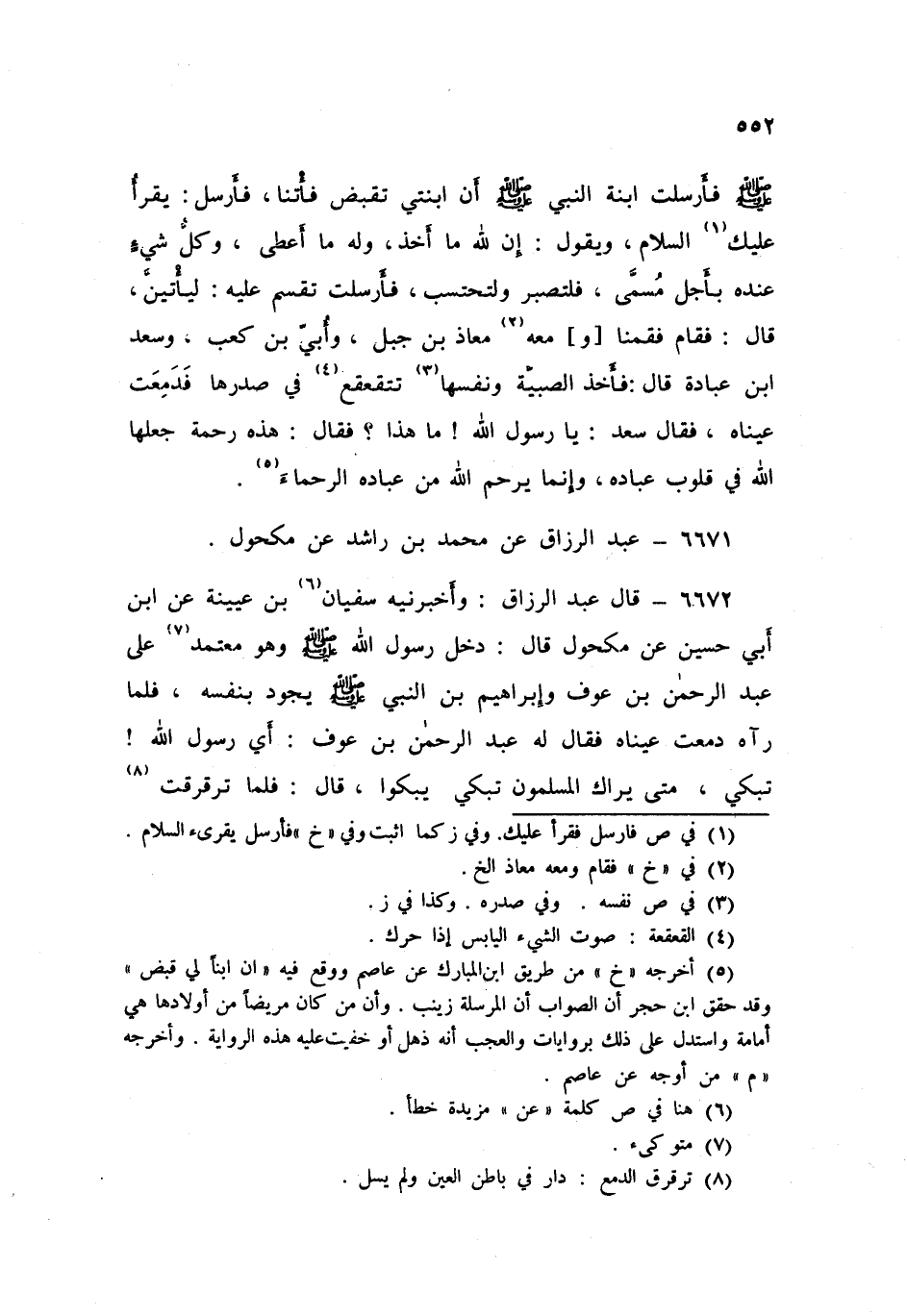 ٦٦٧٢ - قَالَ عَبْدُ الرَّزَّاقِ: وَأَخْبَرَنِيهِ سُفْيَانُ بْنُ عُيَيْنَةَ، عَنِ ابْنِ أَبِي حُسَيْنٍ، عَنْ مَكْحُولٍ قَالَ: دَخَلَ رَسُولُ اللَّهِ صَلَّى اللهُ عَلَيْهِ وَسَلَّمَ وَهُوَ مُعْتَمِدٌ عَلَى عَبْدِ الرَّحْمَنِ بْنِ عَوْفٍ وَإِبْرَاهِيمُ ابْنُ النَّبِيِّ صَلَّى اللهُ عَلَيْهِ وَسَلَّمَ يَجُودُ بِنَفْسِهِ، فَلَمَّا رَآهُ دَمَعَتْ عَيْنَاهُ فَقَالَ لَهُ عَبْدُ الرَّحْمَنِ بْنُ عَوْفٍ: أَيْ رَسُولَ اللَّهِ، تَبْكِي؟ مَتَى يَرَاكَ الْمُسْلِمُونَ تَبْكِي يَبْكُوا قَالَ: فَلَمَّا تَرَقْرَقَتْ ⦗٥٥٣⦘ عَبْرَتُهُ قَالَ: «إِنَّمَا هَذَا رَحِمٌ، وَإِنَّ مَنْ لَا يَرْحَمُ لَا يُرْحَمُ، إِنَّمَا أَنْهَى النَّاسَ عَنِ النِّيَاحَةِ وَأَنْ يُنْدُبَ الْمَيِّتُ بِمَا لَيْسَ فِيهِ» فَلَمَّا قَضَى قَالَ: «لَوْلَا أَنَّهُ وَعْدٌ جَامِعٌ وَسَبِيلٌ مَأْتِيٌّ، وَأَنَّ الْآخِرَ مِنَّا يَلْحَقُ بِالْأَوَّلِ لَوَجَدْنَا غَيْرَ الَّذِي وَجَدْنَا، وَإِنَّا بِكَ يَا إِبْرَاهِيمُ لَمَحْزُونُونَ، تَدْمَعُ الْعَيْنُ، وَيَجِدُ الْقَلْبُ، وَلَا نَقُولُ مَا يُسْخِطُ الرَّبَّ، وَفَضْلُ رَضَاعِهِ فِي الْجَنَّةِ»
