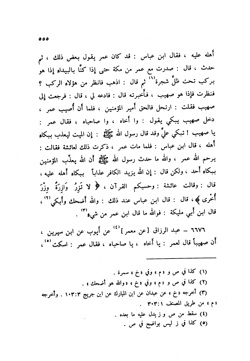 ٦٦٧٦ - عَنْ مَعْمَرٍ، عَنْ أَيُّوبَ، عَنِ ابْنِ سِيرِينَ، أَنَّ صُهَيْبًا، قَالَ لِعُمَرَ: يَا أَخَاهُ، يَا صَاحِبَاهُ، فَقَالَ عُمَرُ: «اسْكُتْ، وَيْحَكَ أَمَا سَمِعْتَنَا نَتَحَدَّثُ أَنَّ الْمُعَوَّلَ عَلَيْهِ يُعَذَّبُ؟». عَبْدُ الرَّزَّاقِ،