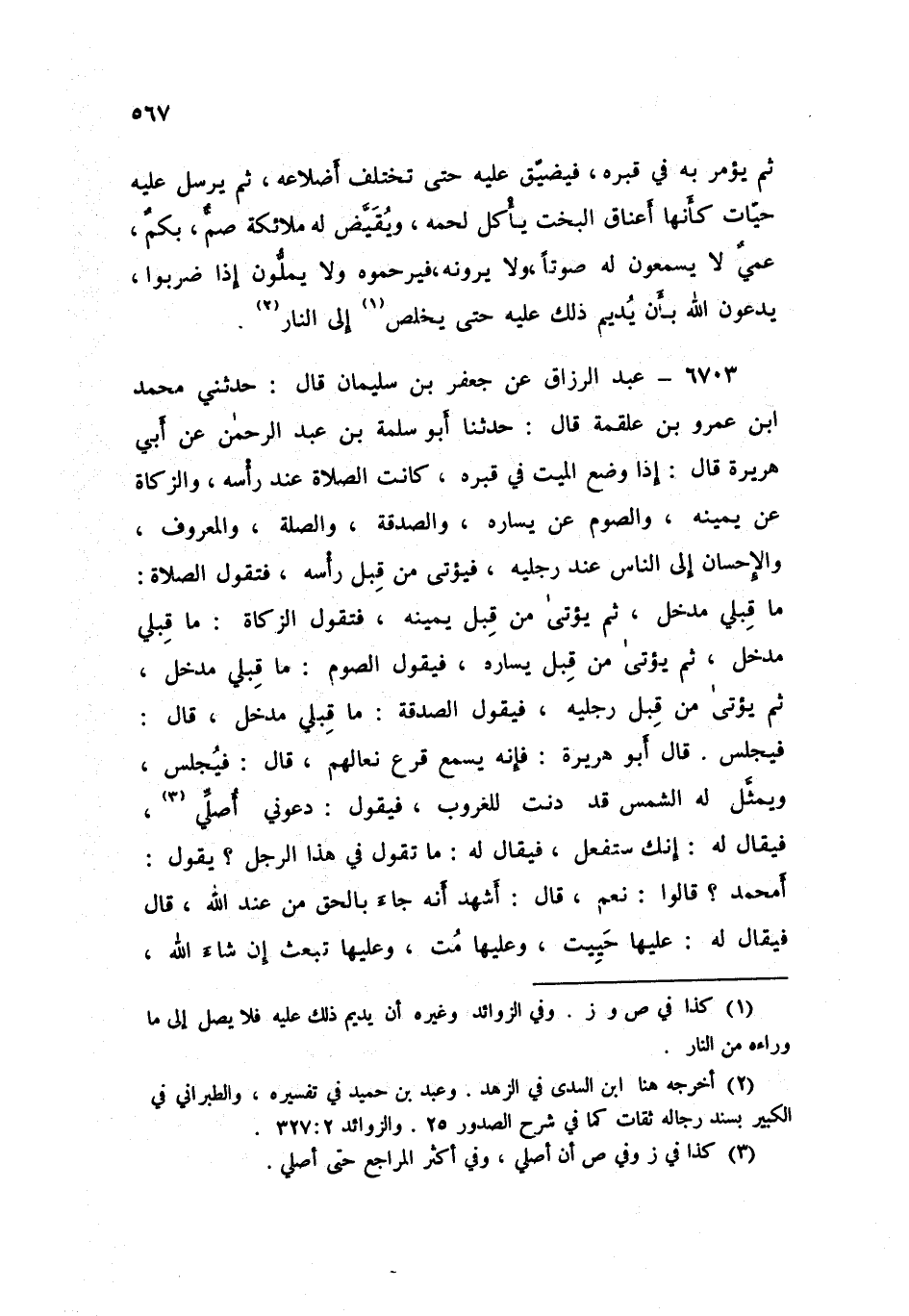 ٦٧٠٣ - عَنْ جَعْفَرِ بْنِ سُلَيْمَانَ قَالَ: حَدَّثَنِي مُحَمَّدُ بْنُ عَمْرِو بْنِ عَلْقَمَةَ قَالَ: حَدَّثَنَا أَبُو سَلَمَةَ بْنُ عَبْدِ الرَّحْمَنِ، عَنْ أَبِي هُرَيْرَةَ قَالَ: " إِذَا وُضِعَ الْمَيِّتُ فِي قَبْرِهِ كَانَتِ الصَّلَاةُ عِنْدَ رَأْسِهِ، وَالزَّكَاةُ عَنْ يَمِينِهِ، وَالصَّوْمُ عَنْ يَسَارِهِ، وَالصَّدَقَةُ وَالصِّلَةُ وَالْمَعْرُوفُ وَالْإِحْسَانُ إِلَى النَّاسِ عِنْدَ رِجْلَيْهِ، فَيُؤْتَى مِنْ قِبَلِ رَأْسِهِ فَتَقُولُ الصَّلَاةُ: مَا قِبَلِي مَدْخَلٌ، ثُمَّ يُؤْتَى مِنْ قِبَلِ يَمِينِهِ فَتَقُولُ الزَّكَاةُ: مَا قِبَلِي مَدْخَلٌ، ثُمَّ يُؤْتَى مِنْ قِبَلِ يَسَارِهِ فَيَقُولُ الصَّوْمُ: مَا قِبَلِي مَدْخَلٌ، ثُمَّ يُؤْتَى مِنْ قِبَلِ رِجْلَيْهِ فَيَقُولُ الصَّدَقَةُ: مَا قِبَلِي مَدْخَلٌ قَالَ: فَيُجْلَسُ " قَالَ أَبُو هُرَيْرَةَ: فَإِنَّهُ يَسْمَعُ قَرْعَ نِعَالِهِمْ قَالَ: فَيُجْلَسُ وَيُمَثَّلُ لَهُ الشَّمْسُ قَدْ دَنَتْ لِلْغُرُوبِ، فَيَقُولُ: دَعُونِي أُصَلِّي، فَيُقَالُ لَهُ: إِنَّكَ سَتَفْعَلُ، فَيُقَالُ لَهُ: مَا تَقُولُ فِي هَذَا الرَّجُلِ؟ يَقُولُ: أَمُحَمَّدٌ؟ قَالُوا: نَعَمْ: قَالَ: أَشْهَدُ أَنَّهُ جَاءَ بِالْحَقِّ مِنْ عِنْدِ اللَّهِ قَالَ: فَيُقَالُ لَهُ: عَلَيْهَا حَيِيتَ وَعَلَيْهَا مُتَّ وَعَلَيْهَا تُبْعَثُ إِنْ شَاءَ اللَّهُ ⦗٥٦٨⦘ قَالَ: فَذَلِكَ قَوْلُهُ: {يُثَبِّتُ اللَّهُ الَّذِينَ آمَنُوا بِالْقَوْلِ الثَّابِتِ فِي الْحَيَاةِ الدُّنْيَا وَفِي الْآخِرَةِ} [إبراهيم: ٢٧] قَالَ: فَيُفْتَحُ لَهُ بَابٌ مِنَ النَّارِ فَيَنْظُرُ إِلَى مَسَاكِنِهِ فِيهَا، فَيُقَالُ لَهُ: لَوْ كُنْتَ عَصَيْتَ كَانَتْ هَذِهِ مَسَاكِنَكَ، فَيَزْدَادُ غِبْطَةً وَسُرُورًا، وَيُفْسَحُ لَهُ فِي قَبْرِهِ قَالَ: سَبْعِينَ، قَالَ عَبْدُ الرَّحْمَنِ بْنُ يَحْيَى بْنِ حَنْطَبٍ: ثُمَّ يُقَالُ: نَمْ نَوْمَةَ الْعَرُوسِ لَا يُوقِظُهُ إِلَّا أَحَبُّ الْخَلْقِ إِلَيْهِ ـ رَجَعَ الْحَدِيثُ إِلَى أَبِي هُرَيْرَةَ ـ قَالَ: " تُجْعَلُ رُوحُهُ فِي النَّسِيمِ الطِّيبِ فِي أَجْوَافِ طَيْرٍ تَعْلُقُ بَيْنَ شَجَرٍ مِنْ شَجَرِ الْجَنَّةِ، أَوْ تَعْلُقُ بِشَجَرِ الْجَنَّةِ قَالَ: وَتَعُودُ الْأَجْسَادُ لِلَّذِي خُلِقَتْ لَهُ قَالَ: وَإِنَّ الْكَافِرَ يُؤْتَى مِنْ قِبَلِ رَأْسِهِ فَلَا يُوجَدُ لَهُ شَيْءٌ، فَيُجْلَسُ ثُمَّ يُقَالُ لَهُ: مَا كُنْتَ تَقُولُ فِي هَذَا الرَّجُلِ، مَرَّتَيْنِ؟ لَا يَذْكُرُهُ حَتَّى يُلَقَّنَهُ، فَيَقُولُ: مُحَمَّدًا قَالَ: كُنْتُ أَقُولُ مَا يَقُولُ النَّاسُ، فَيُقَالُ لَهُ: صَدَقْتَ، عَلَيْهَا حَيِيتَ وَعَلَيْهَا مُتَّ وَعَلَيْهَا تُبْعَثُ إِنْ شَاءَ اللَّهُ، ثُمَّ يُفْتَحُ بَابٌ مِنَ الْجَنَّةِ فَيَرَى مَسَاكِنَهَا فَيُقَالُ لَهُ: لَوْ كُنْتَ فَعَلْتَ وَأَطَعْتَ اللَّهَ كَانَتْ هَذِهِ مَسَاكِنَكَ، فَيَزْدَادُ حَسْرَةً وَثُبُورًا قَالَ: ثُمَّ يُغْلَقُ عَلَيْهِ وَيُفْتَحُ لَهُ بَابٌ مِنَ النَّارِ فَيَرَى مَسَاكِنَهُ فِيهَا وَمَا أَعَدَّ اللَّهُ لَهُ مِنَ الْعَذَابِ وَيَزْدَادُ حَسْرَةً وَثُبُورًا، وَيُضَيَّقُ عَلَيْهِ قَبْرُهُ حَتَّى تَلْتَقِيَ أَضْلَاعُهُ "، فَذَلِكَ قَوْلُ ⦗٥٦٩⦘ اللَّهِ عَزَّ وَجَلَّ: {مَعِيشَةً ضَنْكًا} [طه: ١٢٤] قَالَ: «وَتُجْعَلُ رُوحُهُ فِي سِجِّينٍ»