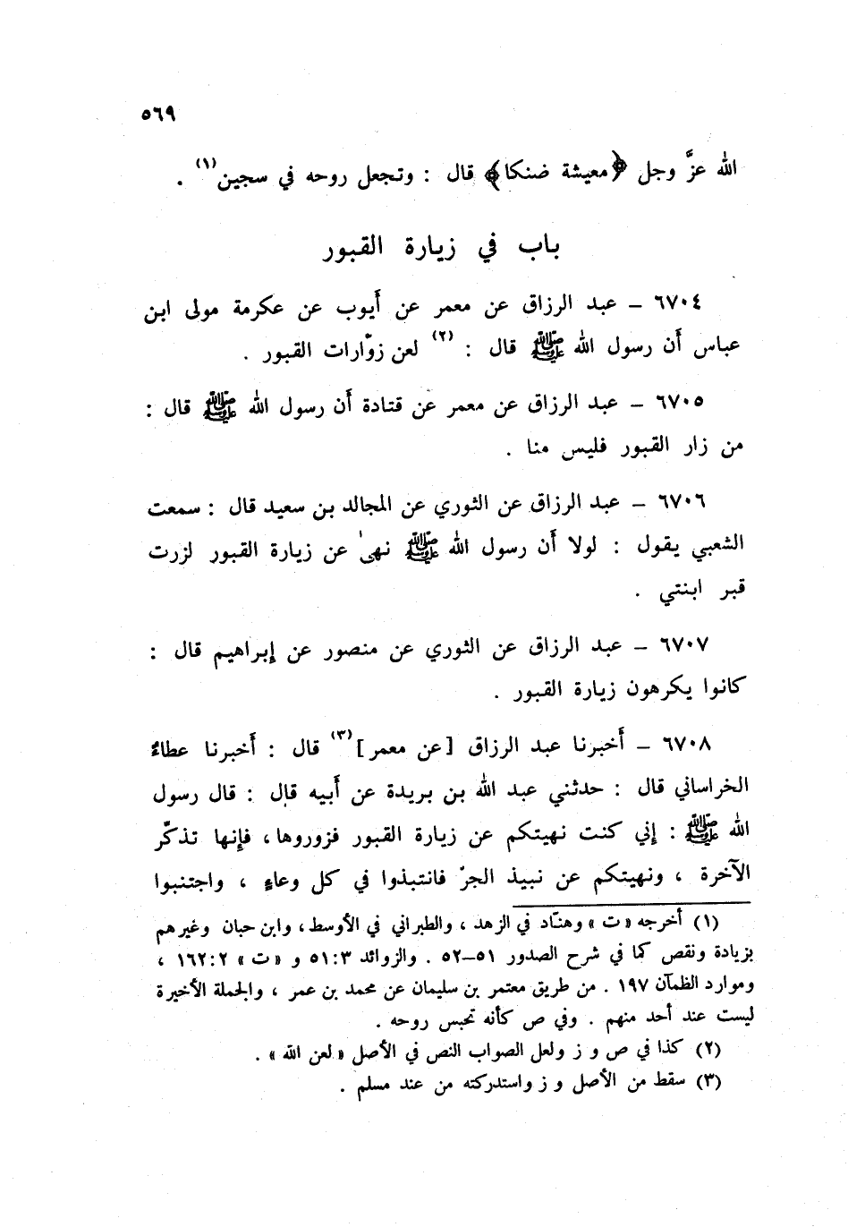 ٦٧٠٤ - عَنْ مَعْمَرٍ، عَنْ أَيُّوبَ، عَنْ عِكْرِمَةَ، مَوْلَى ابْنِ عَبَّاسٍ: أَنَّ رَسُولَ اللَّهِ صَلَّى اللهُ عَلَيْهِ وَسَلَّمَ قَالَ: «لُعِنَ زَوَّارَاتُ الْقُبُورِ»