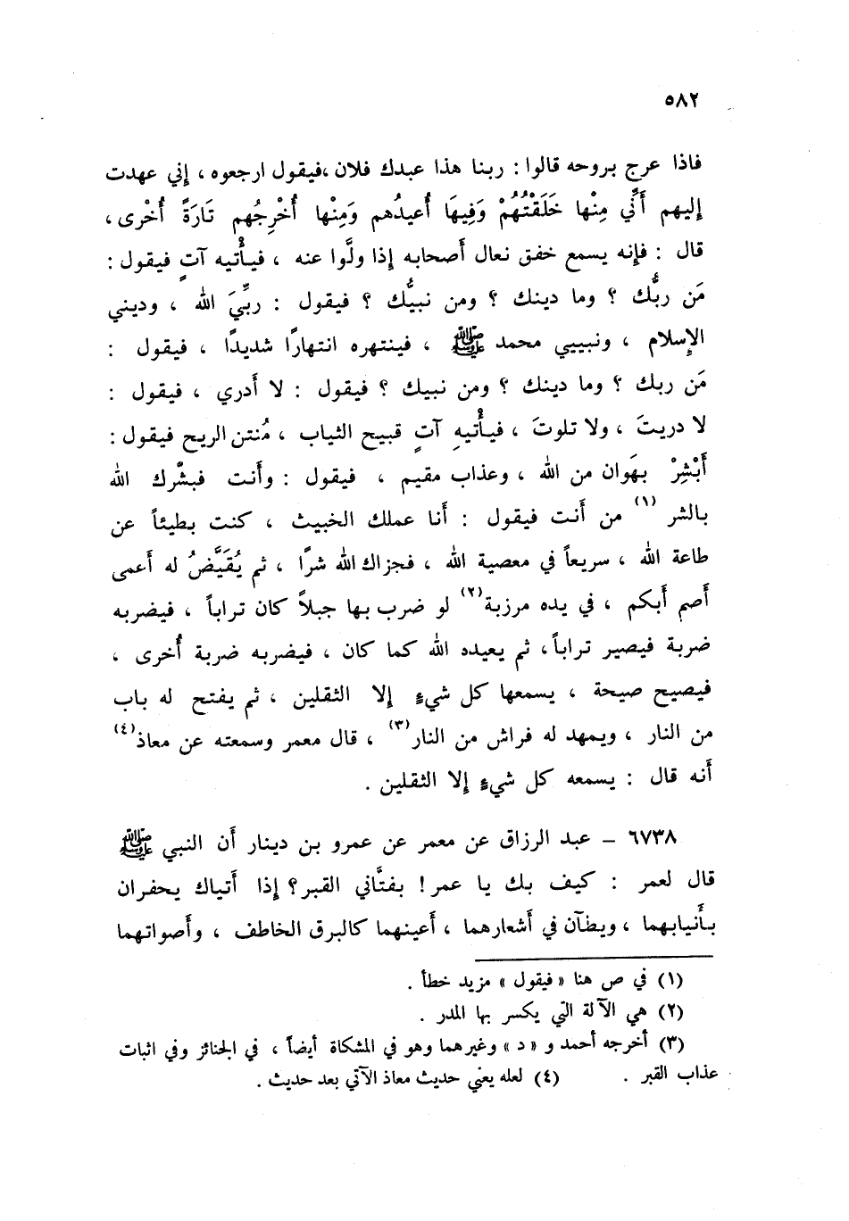 ٦٧٣٨ - عَنْ مَعْمَرٍ، عَنْ عَمْرِو بْنِ دِينَارٍ، أَنَّ النَّبِيَّ صَلَّى اللهُ عَلَيْهِ وَسَلَّمَ قَالَ لِعُمَرَ: «كَيْفَ بِكَ يَا عُمَرُ بِفَتَّانَيِ الْقَبْرِ إِذَا أَتَيَاكَ يَحْفِرَانِ بِأَنْيَابِهِمَا، وَيَطَآنِ فِي أَشْعَارِهِمَا، أَعْيُنُهُمَا كَالْبَرْقِ الْخَاطِفِ، وَأَصْوَاتُهُمَا كَالرَّعْدِ الْقَاصِفِ، مَعَهُمَا مِزْرَبَّةٌ لَوِ اجْتَمَعَ عَلَيْهَا أَهْلُ مِنًى لَمْ يُقِلُّوهَا» قَالَ عُمَرُ: وَأَنَا عَلَى مَا أَنَا عَلَيْهِ الْيَوْمَ؟ قَالَ: «وَأَنْتَ عَلَى مَا أَنْتَ عَلَيْهِ الْيَوْمَ» قَالَ: «إِذًا أَكْفِيهِمَا إِنْ شَاءَ اللَّهُ» قَالَ: وَكَانَ عُبَيْدُ بْنُ عُمَيْرٍ يَقُولُ: نَعَمْ، ذَلِكَ مُنْكَرٌ وَنَكِيرٌ