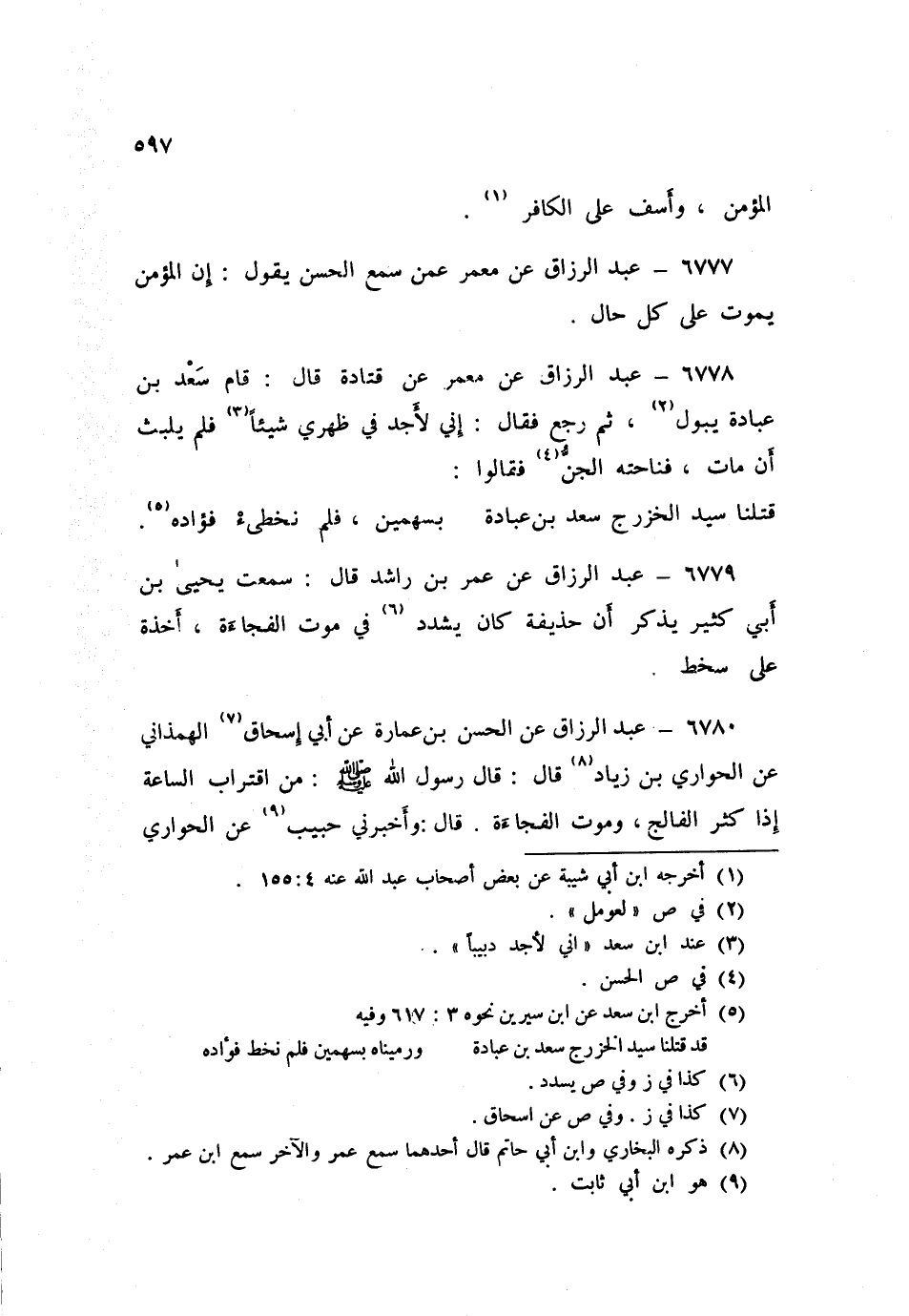 ٦٧٧٨ - عَنْ مَعْمَرٍ، عَنْ قَتَادَةَ قَالَ: قَامَ سَعْدُ بْنُ عُبَادَةَ يَبُولُ ثُمَّ رَجَعَ فَقَالَ: " إِنِّي لَأَجِدُ فِي ظَهْرِي شَيْئًا فَلَمْ يَلْبَثْ أَنْ مَاتَ، فَنَاحَتْهُ الْجِنُّ فَقَالُوا: