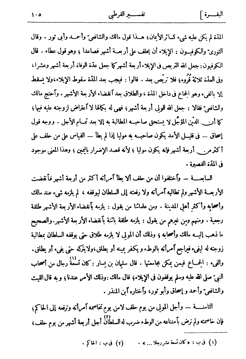 المدة لم يكن عليه شي كَسَائِرِ الْأَيْمَانِ، هَذَا قَوْلُ مَالِكٍ وَالشَّافِعِيِّ وَأَحْمَدَ وَأَبِي ثَوْرٍ. وَقَالَ الثَّوْرِيُّ وَالْكُوفِيُّونَ: الْإِيلَاءُ أَنْ يَحْلِفَ عَلَى أَرْبَعَةِ أَشْهُرٍ فَصَاعِدًا، وَهُوَ قَوْلُ عَطَاءٍ. قَالَ الْكُوفِيُّونَ: جَعَلَ اللَّهُ التَّرَبُّصَ فِي الْإِيلَاءِ أَرْبَعَةَ أَشْهُرٍ كَمَا جَعَلَ عِدَّةَ الْوَفَاةِ أَرْبَعَةَ أَشْهُرٍ وَعَشْرًا، وَفِي الْعِدَّةِ ثَلَاثَةُ قُرُوءٍ، فَلَا تَرَبُّصَ بَعْدُ. قَالُوا: فَيَجِبُ بَعْدَ الْمُدَّةِ سقوط الإيلاء، ولا يسقط إلا بألفي وَهُوَ الْجِمَاعُ فِي دَاخِلِ الْمُدَّةِ، وَالطَّلَاقُ بَعْدَ انْقِضَاءِ الْأَرْبَعَةِ الْأَشْهُرِ. وَاحْتَجَّ مَالِكٌ وَالشَّافِعِيُّ فَقَالَا: جَعَلَ اللَّهُ لِلْمُولِي أَرْبَعَةَ أَشْهُرٍ، فَهِيَ لَهُ بِكَمَالِهَا لَا اعْتِرَاضَ لِزَوْجَتِهِ عَلَيْهِ فِيهَا، كَمَا أَنَّ الدَّيْنَ الْمُؤَجَّلَ لَا يَسْتَحِقُّ صَاحِبُهُ الْمُطَالَبَةَ بِهِ إِلَّا بَعْدَ تَمَامِ الْأَجَلِ. وَوَجْهُ قَوْلِ إِسْحَاقَ- فِي قَلِيلِ الْأَمَدِ يَكُونُ صَاحِبُهُ بِهِ مُولِيًا إِذَا لَمْ يَطَأْ- الْقِيَاسُ عَلَى مَنْ حَلَفَ عَلَى أَكْثَرَ مِنْ أَرْبَعَةِ أَشْهُرٍ فَإِنَّهُ يَكُونُ مُولِيًا، لِأَنَّهُ قَصَدَ الْإِضْرَارَ بِالْيَمِينِ، وَهَذَا الْمَعْنَى مَوْجُودٌ فِي الْمُدَّةِ الْقَصِيرَةِ. السَّابِعَةُ- وَاخْتَلَفُوا أَنَّ مَنْ حَلَفَ أَلَّا يَطَأَ امْرَأَتَهُ أَكْثَرَ مِنْ أَرْبَعَةِ أَشْهُرٍ فَانْقَضَتِ الْأَرْبَعَةُ الْأَشْهُرُ وَلَمْ تُطَالِبْهُ امْرَأَتُهُ وَلَا رَفَعَتْهُ إِلَى السُّلْطَانِ لِيُوقِفَهُ، لم يلزمه شي عِنْدَ مَالِكٍ وَأَصْحَابِهِ وَأَكْثَرِ أَهْلِ الْمَدِينَةِ. وَمِنْ عُلَمَائِنَا مَنْ يَقُولُ: يَلْزَمُهُ بِانْقِضَاءِ الْأَرْبَعَةِ الْأَشْهُرِ طَلْقَةٌ رَجْعِيَّةٌ. وَمِنْهُمْ وَمِنْ غَيْرِهِمْ مَنْ يَقُولُ: يَلْزَمُهُ طَلْقَةٌ بَائِنَةٌ بِانْقِضَاءِ الْأَرْبَعَةِ الْأَشْهُرِ. وَالصَّحِيحُ مَا ذَهَبَ إِلَيْهِ مَالِكٌ وَأَصْحَابُهُ، وَذَلِكَ أَنَّ الْمُولِيَ لَا يَلْزَمُهُ طَلَاقٌ حَتَّى يُوقِفَهُ السُّلْطَانُ بمطالبة زوجنه له ليفي فيراجع امرأته بالوطي وَيُكَفِّرُ يَمِينَهُ أَوْ يُطَلِّقُ، وَلَا يَتْرُكُهُ حَتَّى يفئ أَوْ يُطَلِّقَ. وَالْفَيْءُ: الْجِمَاعُ فِيمَنْ يُمْكِنُ مُجَامَعَتُهَا. قَالَ سُلَيْمَانُ بْنُ يَسَارٍ: كَانَ تِسْعَةُ «١» رِجَالٍ مِنْ أَصْحَابِ النَّبِيِّ صَلَّى اللَّهُ عَلَيْهِ وَسَلَّمَ يُوقَفُونَ فِي الْإِيلَاءِ، قَالَ مَالِكٌ: وَذَلِكَ الْأَمْرُ عِنْدَنَا، وَبِهِ قَالَ اللَّيْثُ وَالشَّافِعِيُّ وَأَحْمَدُ وَإِسْحَاقُ وَأَبُو ثَوْرٍ، وَاخْتَارَهُ ابْنُ الْمُنْذِرِ. الثَّامِنَةُ- وَأَجَلُ المولى من يوم حلف لأمن يَوْمِ تَخَاصُمِهِ امْرَأَتَهُ وَتَرْفَعُهُ إِلَى الْحَاكِمِ، فَإِنْ خاصمته ولم ترض بامتناعه من الوطي ضَرَبَ لَهُ السُّلْطَانُ «٢» أَجَلَ أَرْبَعَةِ أَشْهُرٍ مِنْ يوم حلف،
