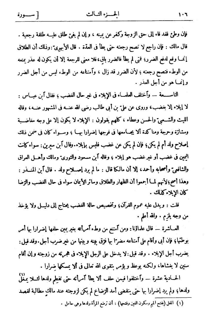 فَإِنْ وَطِئَ فَقَدْ فَاءَ إِلَى حَقِّ الزَّوْجَةِ وَكَفَّرَ عَنْ يَمِينِهِ، وَإِنْ لَمْ يَفِئْ طَلَّقَ عَلَيْهِ طَلْقَةً رَجْعِيَّةً. قَالَ مَالِكٌ: فَإِنْ رَاجَعَ لَا تَصِحُّ رَجْعَتُهُ حَتَّى يَطَأَ فِي الْعِدَّةِ. قَالَ الْأَبْهَرِيُّ: وَذَلِكَ أَنَّ الطَّلَاقَ إِنَّمَا وَقَعَ لِدَفْعِ الضَّرَرِ، فَمَتَى لَمْ يَطَأْ فَالضَّرَرُ بَاقٍ، فَلَا مَعْنَى لِلرَّجْعَةِ إِلَّا أَنْ يَكُونَ لَهُ عذر يمنعه من الوطي فَتَصِحُّ رَجْعَتُهُ، لِأَنَّ الضَّرَرَ قَدْ زَالَ، وَامْتِنَاعُهُ من الوطي لَيْسَ مِنْ أَجْلِ الضَّرَرِ وَإِنَّمَا هُوَ مِنْ أَجْلِ الْعُذْرِ. التَّاسِعَةُ- وَاخْتَلَفَ الْعُلَمَاءُ فِي الْإِيلَاءِ فِي غَيْرِ حَالِ الْغَضَبِ، فَقَالَ ابْنُ عَبَّاسٍ: لَا إِيلَاءَ إِلَّا بِغَضَبٍ، وَرُوِيَ عَنْ عَلِيِّ بْنِ أَبِي طَالِبٍ رَضِيَ اللَّهُ عَنْهُ فِي الْمَشْهُورِ عَنْهُ، وَقَالَهُ اللَّيْثُ وَالشَّعْبِيُّ وَالْحَسَنُ وَعَطَاءٌ، كُلُّهُمْ يَقُولُونَ: الْإِيلَاءُ لَا يَكُونُ إِلَّا عَلَى وجه مغاضبة ومشارة وَحَرَجَةٍ وَمُنَاكَدَةٍ أَلَّا يُجَامِعَهَا فِي فَرْجِهَا إِضْرَارًا بِهَا، وَسَوَاءٌ كَانَ فِي ضِمْنِ ذَلِكَ إِصْلَاحُ وَلَدٍ أَمْ لَمْ يَكُنْ، فَإِنْ لَمْ يَكُنْ عَنْ غَضَبٍ فَلَيْسَ بِإِيلَاءٍ. وَقَالَ ابْنُ سِيرِينَ: سَوَاءٌ كَانَتِ الْيَمِينُ فِي غَضَبٍ أَوْ غَيْرِ غَضَبٍ هُوَ إِيلَاءٌ، وَقَالَهُ ابْنُ مَسْعُودٍ وَالثَّوْرِيُّ وَمَالِكٌ وَأَهْلُ الْعِرَاقِ وَالشَّافِعِيُّ وَأَصْحَابُهُ وَأَحْمَدُ، إِلَّا أَنَّ مَالِكًا قَالَ: مَا لَمْ يُرِدْ إِصْلَاحَ وَلَدٍ. قَالَ ابْنُ الْمُنْذِرِ: وَهَذَا أَصَحُّ، لِأَنَّهُمْ لَمَّا أَجْمَعُوا أَنَّ الظِّهَارَ وَالطَّلَاقَ وَسَائِرَ الْأَيْمَانِ سَوَاءٌ فِي حَالِ الْغَضَبِ وَالرِّضَا كَانَ الْإِيلَاءُ كَذَلِكَ. قُلْتُ: وَيَدُلُّ عَلَيْهِ عُمُومُ الْقُرْآنِ، وَتَخْصِيصُ حَالَةِ الْغَضَبِ يَحْتَاجُ إِلَى دَلِيلٍ وَلَا يُؤْخَذُ مِنْ وَجْهٍ يُلْزِمُ. وَاللَّهُ أَعْلَمُ. الْعَاشِرَةُ- قَالَ علماؤنا: ومن امتنع من وطئ امْرَأَتِهِ بِغَيْرِ يَمِينٍ حَلَفَهَا إِضْرَارًا بِهَا أُمِرَ بِوَطْئِهَا، فَإِنْ أَبَى وَأَقَامَ عَلَى امْتِنَاعِهِ مُضِرًّا بِهَا فُرِّقَ بَيْنَهُ وَبَيْنَهَا مِنْ غَيْرِ ضَرْبِ أَجَلٍ. وَقَدْ قِيلَ: يُضْرَبُ أَجَلُ الْإِيلَاءِ. وَقَدْ قِيلَ: لَا يَدْخُلُ عَلَى الرَّجُلِ الْإِيلَاءُ فِي هِجْرَتِهِ مِنْ زَوْجَتِهِ وَإِنْ أَقَامَ سِنِينَ لَا يَغْشَاهَا، وَلَكِنَّهُ يُوعَظُ وَيُؤْمَرُ بِتَقْوَى اللَّهِ تَعَالَى فِي أَلَّا يُمْسِكَهَا ضِرَارًا. الْحَادِيَةَ عَشْرَةَ- وَاخْتَلَفُوا فِيمَنْ حَلَفَ أَلَّا يَطَأَ امْرَأَتَهُ حَتَّى تَفْطِمَ وَلَدَهَا لِئَلَّا يُمْغَلَ «١» وَلَدُهَا، وَلَمْ يُرِدْ إِضْرَارًا بِهَا حَتَّى يَنْقَضِيَ أَمَدُ الرَّضَاعِ لَمْ يَكُنْ لزوجته عند مالك مطالبة لقصد