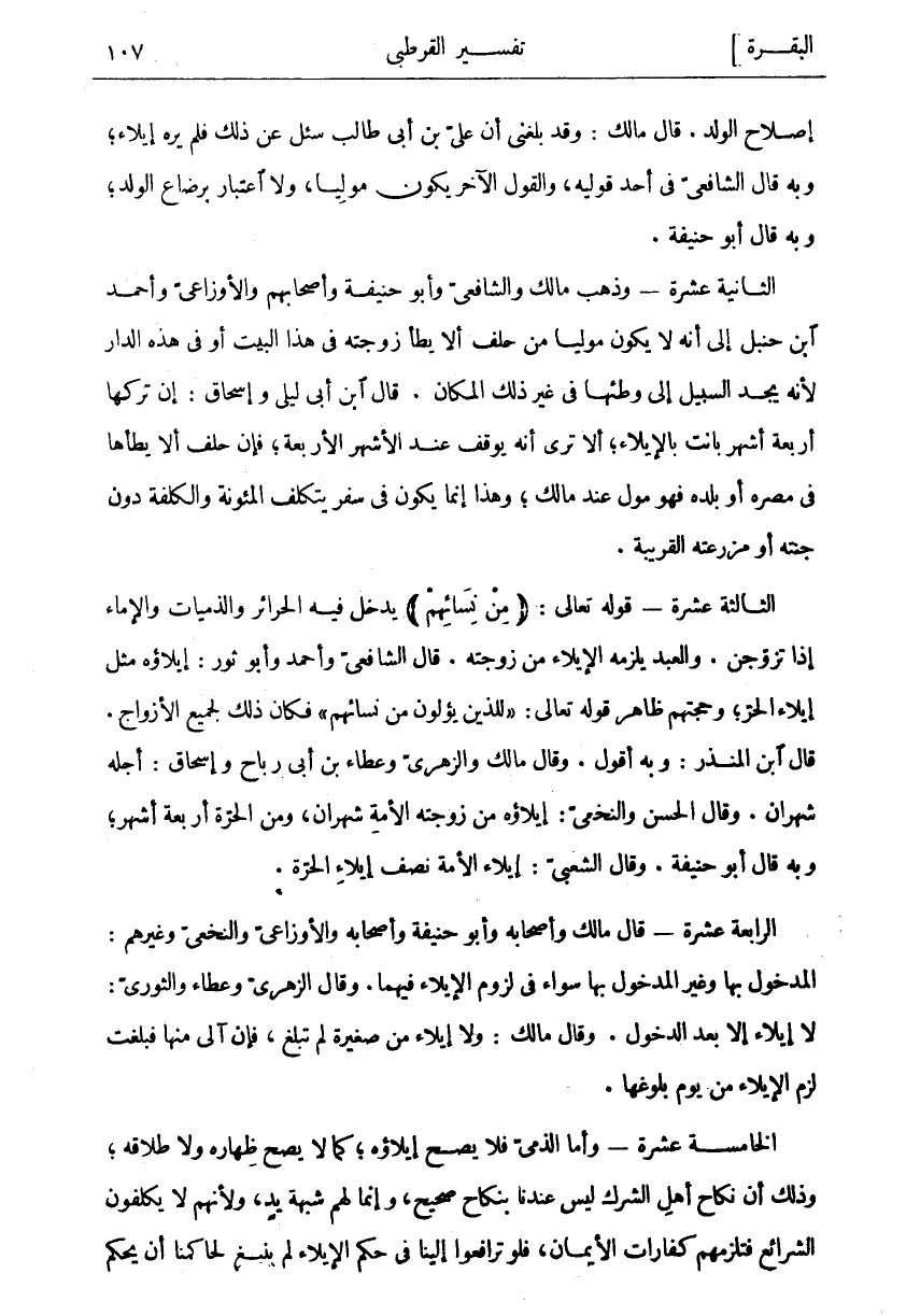 إِصْلَاحِ الْوَلَدِ. قَالَ مَالِكٌ: وَقَدْ بَلَغَنِي أَنَّ عَلِيَّ بْنَ أَبِي طَالِبٍ سُئِلَ عَنْ ذَلِكَ فَلَمْ يَرَهُ إِيلَاءً، وَبِهِ قَالَ الشَّافِعِيُّ فِي أَحَدِ قَوْلَيْهِ، وَالْقَوْلُ الْآخَرُ يَكُونُ مُولِيًا، وَلَا اعْتِبَارَ بِرَضَاعِ الْوَلَدِ، وَبِهِ قَالَ أَبُو حَنِيفَةَ. الثَّانِيَةَ عَشْرَةَ- وَذَهَبَ مَالِكٌ وَالشَّافِعِيُّ وَأَبُو حَنِيفَةَ وَأَصْحَابُهُمْ وَالْأَوْزَاعِيُّ وَأَحْمَدُ بْنُ حَنْبَلٍ إِلَى أَنَّهُ لَا يَكُونُ مُولِيًا مَنْ حَلَفَ أَلَّا يَطَأَ زَوْجَتَهُ فِي هَذَا الْبَيْتِ أَوْ فِي هَذِهِ الدَّارِ لِأَنَّهُ يَجِدُ السَّبِيلَ إِلَى وَطْئِهَا فِي غَيْرِ ذَلِكَ الْمَكَانِ. قَالَ ابْنُ أَبِي لَيْلَى وَإِسْحَاقُ: إِنْ تَرَكَهَا أَرْبَعَةَ أَشْهُرٍ بَانَتْ بِالْإِيلَاءِ، أَلَا تَرَى أَنَّهُ يُوقَفُ عِنْدَ الْأَشْهُرِ الْأَرْبَعَةِ، فَإِنْ حَلَفَ أَلَّا يَطَأَهَا فِي مِصْرِهِ أَوْ بَلَدِهِ فَهُوَ مُولٍ عِنْدَ مَالِكٍ، وَهَذَا إِنَّمَا يَكُونُ فِي سَفَرٍ يَتَكَلَّفُ الْمَئُونَةَ وَالْكُلْفَةَ دُونَ جَنَّتِهِ أَوْ مَزْرَعَتِهِ الْقَرِيبَةِ. الثَّالِثَةَ عَشْرَةَ- قَوْلُهُ تَعَالَى: (مِنْ نِسائِهِمْ) يَدْخُلُ فِيهِ الْحَرَائِرُ وَالذِّمِّيَّاتُ وَالْإِمَاءُ إِذَا تَزَوَّجْنَ. وَالْعَبْدُ يَلْزَمُهُ الْإِيلَاءُ مِنْ زَوْجَتِهِ. قَالَ الشَّافِعِيُّ وَأَحْمَدُ وَأَبُو ثَوْرٍ: إِيلَاؤُهُ مِثْلُ إِيلَاءِ الْحُرِّ، وَحُجَّتُهُمْ ظَاهِرُ قَوْلِهِ تَعَالَى:" لِلَّذِينَ يُؤْلُونَ مِنْ نِسائِهِمْ" فَكَانَ ذَلِكَ لِجَمِيعِ الْأَزْوَاجِ. قَالَ ابْنُ الْمُنْذِرِ: وَبِهِ أَقُولُ. وَقَالَ مَالِكٌ وَالزُّهْرِيُّ وَعَطَاءُ بْنُ أَبِي رَبَاحٍ وَإِسْحَاقُ: أَجَلُهُ شَهْرَانِ. وَقَالَ الْحَسَنُ وَالنَّخَعِيُّ: إِيلَاؤُهُ مِنْ زَوْجَتِهِ الْأَمَةِ شَهْرَانِ، وَمِنَ الْحُرَّةِ أَرْبَعَةُ أَشْهُرٍ، وَبِهِ قَالَ أَبُو حَنِيفَةَ. وَقَالَ الشَّعْبِيُّ: إِيلَاءُ الْأَمَةِ نِصْفُ إِيلَاءِ الْحُرَّةِ. الرَّابِعَةَ عَشْرَةَ- قَالَ مَالِكٌ وَأَصْحَابُهُ وَأَبُو حَنِيفَةَ وَأَصْحَابُهُ وَالْأَوْزَاعِيُّ وَالنَّخَعِيُّ وَغَيْرُهُمْ: الْمَدْخُولُ بِهَا وَغَيْرُ الْمَدْخُولِ بِهَا سَوَاءٌ فِي لُزُومِ الْإِيلَاءِ فِيهِمَا. وَقَالَ الزُّهْرِيُّ وَعَطَاءٌ وَالثَّوْرِيُّ: لَا إِيلَاءَ إِلَّا بَعْدَ الدُّخُولِ. وَقَالَ مَالِكٌ: وَلَا إِيلَاءَ مِنْ صَغِيرَةٍ لَمْ تَبْلُغْ، فَإِنْ آلَى مِنْهَا فَبَلَغَتْ لَزِمَ الْإِيلَاءُ مِنْ يَوْمِ بُلُوغِهَا. الْخَامِسَةَ عَشْرَةَ- وَأَمَّا الذِّمِّيُّ فَلَا يَصِحُّ إِيلَاؤُهُ، كَمَا لَا يَصِحُّ ظِهَارُهُ وَلَا طَلَاقُهُ، وَذَلِكَ أَنَّ نِكَاحَ أَهْلِ الشِّرْكِ لَيْسَ عِنْدَنَا بِنِكَاحٍ صَحِيحٍ، وَإِنَّمَا لَهُمْ شُبْهَةُ يَدٍ، وَلِأَنَّهُمْ لَا يُكَلَّفُونَ الشَّرَائِعَ فَتَلْزَمُهُمْ كَفَّارَاتُ الْأَيْمَانِ، فَلَوْ تَرَافَعُوا إِلَيْنَا فِي حُكْمِ الْإِيلَاءِ لَمْ يَنْبَغِ لِحَاكِمِنَا أَنْ يَحْكُمَ
