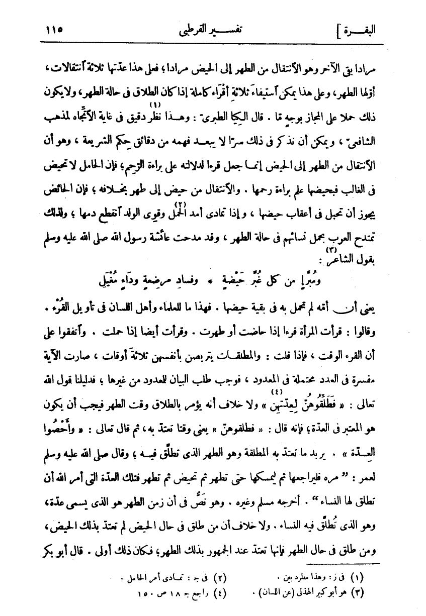 مُرَادًا بَقِيَ الْآخَرُ وَهُوَ الِانْتِقَالُ مِنَ الطُّهْرِ إِلَى الْحَيْضِ مُرَادًا، فَعَلَى هَذَا عِدَّتُهَا ثَلَاثَةُ انْتِقَالَاتٍ، أَوَّلُهَا الطُّهْرُ، وَعَلَى هَذَا يُمْكِنُ اسْتِيفَاءُ ثَلَاثَةِ أَقْرَاءٍ كَامِلَةٍ إِذَا كَانَ الطَّلَاقُ فِي حَالَةِ الطُّهْرِ، وَلَا يَكُونُ ذَلِكَ حَمْلًا عَلَى الْمَجَازِ بِوَجْهٍ مَا. قَالَ الْكِيَا الطَّبَرِيُّ: وَهَذَا نَظَرٌ «١» دَقِيقٌ فِي غَايَةِ الِاتِّجَاهِ لِمَذْهَبِ الشَّافِعِيِّ، وَيُمْكِنُ أَنْ نَذْكُرَ فِي ذَلِكَ سِرًّا لَا يَبْعُدُ فَهْمُهُ مِنْ دَقَائِقِ حُكْمِ الشَّرِيعَةِ، وَهُوَ أَنَّ الِانْتِقَالَ مِنَ الطُّهْرِ إِلَى الْحَيْضِ إِنَّمَا جُعِلَ قُرْءًا لِدَلَالَتِهِ عَلَى بَرَاءَةِ الرَّحِمِ، فَإِنَّ الْحَامِلَ لَا تَحِيضُ فِي الْغَالِبِ فَبِحَيْضِهَا عُلِمَ بَرَاءَةُ رَحِمِهَا. وَالِانْتِقَالُ مِنْ حَيْضٍ إِلَى طُهْرٍ بِخِلَافِهِ، فَإِنَّ الْحَائِضَ يَجُوزُ أَنْ تَحْبَلَ فِي أَعْقَابِ حَيْضِهَا، وَإِذَا تَمَادَى أَمَدُ الْحَمْلِ «٢» وَقَوِيَ الْوَلَدُ انْقَطَعَ دَمُهَا، وَلِذَلِكَ تَمْتَدِحُ الْعَرَبُ بِحَمْلِ نِسَائِهِمْ فِي حَالَةِ الطُّهْرِ، وَقَدْ مَدَحَتْ عَائِشَةُ رَسُولَ اللَّهِ صَلَّى اللَّهُ عَلَيْهِ وَسَلَّمَ بِقَوْلِ الشَّاعِرِ «٣»:
