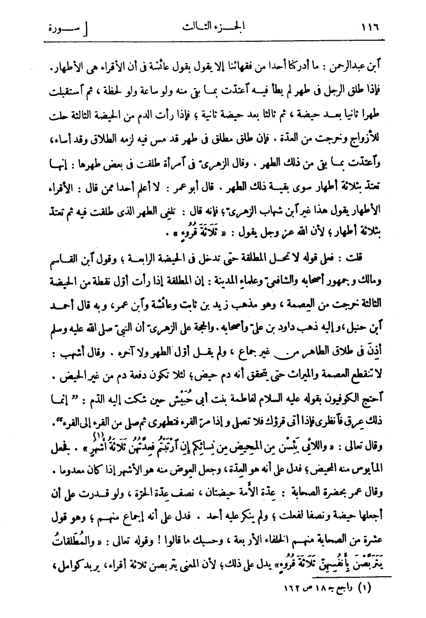 ابن عَبْدِ الرَّحْمَنِ: مَا أَدْرَكْنَا أَحَدًا مِنْ فُقَهَائِنَا إِلَّا يَقُولُ بِقَوْلِ عَائِشَةَ فِي أَنَّ الْأَقْرَاءَ هِيَ الْأَطْهَارُ. فَإِذَا طَلَّقَ الرَّجُلُ فِي طُهْرٍ لَمْ يَطَأْ فِيهِ اعْتَدَّتْ بِمَا بَقِيَ مِنْهُ وَلَوْ سَاعَةً وَلَوْ لَحْظَةً، ثُمَّ اسْتَقْبَلَتْ طُهْرًا ثَانِيًا بَعْدَ حَيْضَةٍ، ثُمَّ ثَالِثًا بَعْدَ حَيْضَةٍ ثَانِيَةٍ، فَإِذَا رَأَتِ الدَّمَ مِنَ الْحَيْضَةِ الثَّالِثَةِ حَلَّتْ لِلْأَزْوَاجِ وَخَرَجَتْ مِنَ الْعِدَّةِ. فَإِنْ طَلَّقَ مُطَلِّقٌ فِي طُهْرٍ قَدْ مَسَّ فِيهِ لَزِمَهُ الطَّلَاقُ وَقَدْ أَسَاءَ، وَاعْتَدَّتْ بِمَا بَقِيَ مِنْ ذَلِكَ الطُّهْرِ. وَقَالَ الزُّهْرِيُّ فِي امْرَأَةٍ طُلِّقَتْ فِي بَعْضِ طُهْرِهَا: إِنَّهَا تَعْتَدُّ بِثَلَاثَةِ أَطْهَارٍ سِوَى بَقِيَّةِ ذَلِكَ الطُّهْرِ. قَالَ أَبُو عُمَرَ: لَا أَعْلَمُ أَحَدًا مِمَّنْ قَالَ: الْأَقْرَاءُ الْأَطْهَارُ يَقُولُ هَذَا غَيْرَ ابْنِ شِهَابٍ الزُّهْرِيِّ، فَإِنَّهُ قَالَ: تُلْغِي الطُّهْرَ الَّذِي طُلِّقَتْ فِيهِ ثُمَّ تَعْتَدُّ بِثَلَاثَةِ أَطْهَارٍ، لِأَنَّ اللَّهَ عَزَّ وَجَلَّ يَقُولُ:" ثَلاثَةَ قُرُوءٍ". قُلْتُ: فَعَلَى قَوْلِهِ لَا تَحِلُّ الْمُطَلَّقَةُ حَتَّى تَدْخُلَ فِي الْحَيْضَةِ الرَّابِعَةِ، وَقَوْلُ ابْنِ الْقَاسِمِ وَمَالِكٍ وَجُمْهُورِ أَصْحَابِهِ وَالشَّافِعِيِّ وَعُلَمَاءِ الْمَدِينَةِ: إِنَّ الْمُطَلَّقَةَ إِذَا رَأَتْ أَوَّلَ نُقْطَةٍ مِنَ الْحَيْضَةِ الثَّالِثَةِ خَرَجَتْ مِنَ الْعِصْمَةِ، وَهُوَ مَذْهَبُ زَيْدِ بْنِ ثَابِتٍ وَعَائِشَةَ وَابْنِ عمر، وبه قال أحمد ابن حَنْبَلٍ، وَإِلَيْهِ ذَهَبَ دَاوُدُ بْنُ عَلِيٍّ وَأَصْحَابُهُ. وَالْحُجَّةُ عَلَى الزُّهْرِيِّ أَنَّ النَّبِيَّ صَلَّى اللَّهُ عَلَيْهِ وَسَلَّمَ أَذِنَ فِي طَلَاقِ الطَّاهِرِ مِنْ غَيْرِ جِمَاعٍ، وَلَمْ يَقُلْ أَوَّلَ الطُّهْرِ وَلَا آخِرَهُ. وَقَالَ أَشْهَبُ: لَا تَنْقَطِعُ الْعِصْمَةُ وَالْمِيرَاثُ حَتَّى يَتَحَقَّقَ أَنَّهُ دَمُ حَيْضٍ، لِئَلَّا تَكُونُ دُفْعَةَ دَمٍ مِنْ غَيْرِ الْحَيْضِ. احْتَجَّ الْكُوفِيُّونَ بقول عَلَيْهِ السَّلَامُ لِفَاطِمَةَ بِنْتِ أَبِي حُبَيْشٍ حِينَ شَكَتْ إِلَيْهِ الدَّمَ:" إِنَّمَا ذَلِكَ عِرْقٌ فَانْظُرِي فَإِذَا أَتَى قُرْؤُكِ فَلَا تُصَلِّي وَإِذَا مَرَّ الْقُرْءُ فَتَطَهَّرِي ثُمَّ صَلِّي مِنَ الْقُرْءِ إِلَى الْقُرْءِ". وَقَالَ تَعَالَى:" وَاللَّائِي يَئِسْنَ مِنَ الْمَحِيضِ مِنْ نِسائِكُمْ إِنِ ارْتَبْتُمْ فَعِدَّتُهُنَّ ثَلاثَةُ أَشْهُرٍ «١» ". فجعل المأيوس مِنْهُ الْمَحِيضَ، فَدَلَّ عَلَى أَنَّهُ هُوَ الْعِدَّةُ، وَجَعَلَ الْعِوَضَ مِنْهُ هُوَ الْأَشْهُرَ إِذَا كَانَ مَعْدُومًا. وَقَالَ عُمَرُ بِحَضْرَةِ الصَّحَابَةِ: عِدَّةُ الْأَمَةِ حَيْضَتَانِ، نِصْفُ عِدَّةِ الْحُرَّةِ، وَلَوْ قَدَرْتُ عَلَى أَنْ أَجْعَلَهَا حَيْضَةً وَنِصْفًا لَفَعَلْتُ، وَلَمْ يُنْكِرْ عَلَيْهِ أَحَدٌ. فَدَلَّ عَلَى أَنَّهُ إِجْمَاعٌ مِنْهُمْ، وَهُوَ قَوْلُ عَشَرَةٍ مِنَ الصَّحَابَةِ مِنْهُمُ الْخُلَفَاءُ الْأَرْبَعَةُ، وَحَسْبُكَ مَا قَالُوا! وَقَوْلُهُ تَعَالَى:" وَالْمُطَلَّقاتُ يَتَرَبَّصْنَ بِأَنْفُسِهِنَّ ثَلاثَةَ قُرُوءٍ" يَدُلُّ عَلَى ذَلِكَ، لِأَنَّ الْمَعْنَى يَتَرَبَّصْنَ ثَلَاثَةَ أَقْرَاءٍ، يُرِيدُ كَوَامِلَ،