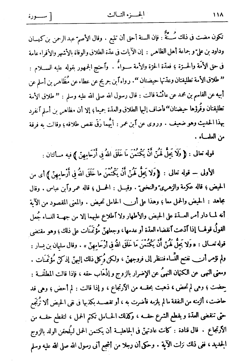 تَكُونَ مَضَتْ فِي ذَلِكَ سُنَّةٌ: فَإِنَّ السُّنَّةَ أَحَقُّ أَنْ تُتَّبَعَ. وَقَالَ الْأَصَمُّ عَبْدُ الرَّحْمَنِ بْنُ كَيْسَانَ وَدَاوُدُ بْنُ عَلِيٍّ وَجَمَاعَةُ أَهْلِ الظَّاهِرِ: إِنَّ الْآيَاتِ فِي عِدَّةِ الطَّلَاقِ وَالْوَفَاةِ بِالْأَشْهُرِ وَالْأَقْرَاءِ عَامَّةٌ فِي حَقِّ الْأَمَةِ وَالْحُرَّةِ، فَعِدَّةُ الْحُرَّةِ وَالْأَمَةِ سَوَاءٌ. وَاحْتَجَّ الْجُمْهُورُ بِقَوْلِهِ عَلَيْهِ السَّلَامُ:" طَلَاقُ الْأَمَةِ تَطْلِيقَتَانِ وَعِدَّتُهَا حَيْضَتَانِ". رَوَاهُ ابْنُ جُرَيْجٍ عَنْ عَطَاءٍ عَنْ مُظَاهِرِ بْنِ أَسْلَمَ عَنْ أَبِيهِ عَنِ الْقَاسِمِ بْنِ مُحَمَّدٍ عَنْ عَائِشَةَ قَالَتْ: قَالَ رَسُولُ اللَّهِ صَلَّى اللَّهُ عَلَيْهِ وَسَلَّمَ:" طَلَاقُ الْأَمَةِ تَطْلِيقَتَانِ وَقُرْؤُهَا حَيْضَتَانِ" فَأَضَافَ إِلَيْهَا الطَّلَاقَ وَالْعِدَّةَ جَمِيعًا، إِلَّا أَنَّ مُظَاهِرَ بْنَ أَسْلَمَ انْفَرَدَ بِهَذَا الْحَدِيثِ وَهُوَ ضَعِيفٌ. وَرُوِيَ عَنِ ابْنِ عُمَرَ: أَيُّهُمَا رَقَّ نَقَصَ طَلَاقُهُ، وَقَالَتْ بِهِ فِرْقَةٌ مِنَ الْعُلَمَاءِ. قَوْلُهُ تَعَالَى: (وَلا يَحِلُّ لَهُنَّ أَنْ يَكْتُمْنَ مَا خَلَقَ اللَّهُ فِي أَرْحامِهِنَّ) فِيهِ مَسْأَلَتَانِ: الْأُولَى- قَوْلُهُ تَعَالَى: (وَلا يَحِلُّ لَهُنَّ أَنْ يَكْتُمْنَ مَا خَلَقَ اللَّهُ فِي أَرْحامِهِنَّ) أَيْ مِنَ الْحَيْضِ، قَالَهُ عِكْرِمَةُ وَالزُّهْرِيُّ وَالنَّخَعِيُّ. وَقِيلَ: الْحَمْلُ، قَالَهُ عُمَرُ وَابْنُ عَبَّاسٍ. وَقَالَ مُجَاهِدٌ: الْحَيْضُ وَالْحَمْلُ مَعًا، وَهَذَا عَلَى أَنَّ الْحَامِلَ تَحِيضُ. وَالْمَعْنَى الْمَقْصُودُ مِنَ الْآيَةِ أَنَّهُ لَمَّا دَارَ أَمْرُ الْعِدَّةِ عَلَى الْحَيْضِ وَالْأَطْهَارِ وَلَا اطِّلَاعَ إِلَّا مِنْ جِهَةِ النِّسَاءِ جُعِلَ الْقَوْلُ قَوْلَهَا إِذَا ادَّعَتِ انْقِضَاءَ الْعِدَّةِ أَوْ عَدَمَهَا، وَجَعَلَهُنَّ مُؤْتَمَنَاتٍ عَلَى ذَلِكَ، وَهُوَ مُقْتَضَى قَوْلِهِ تَعَالَى:" وَلا يَحِلُّ لَهُنَّ أَنْ يَكْتُمْنَ مَا خَلَقَ اللَّهُ فِي أَرْحامِهِنَّ". وَقَالَ سُلَيْمَانُ بْنُ يَسَارٍ: وَلَمْ نُؤْمَرْ أَنْ نَفْتَحَ النِّسَاءَ فَنَنْظُرُ إِلَى فُرُوجِهِنَّ، وَلَكِنْ وُكِّلَ ذَلِكَ إِلَيْهِنَّ إِذْ كُنَّ مُؤْتَمَنَاتٍ. وَمَعْنَى النَّهْيِ عَنِ الْكِتْمَانِ النَّهْيُ عَنِ الْإِضْرَارِ بِالزَّوْجِ وَإِذْهَابِ حَقِّهِ، فَإِذَا قَالَتِ الْمُطَلَّقَةُ: حِضْتُ، وَهِيَ لَمْ تَحِضْ، ذَهَبَتْ بِحَقِّهِ مِنَ الِارْتِجَاعِ، وَإِذَا قَالَتْ: لَمْ أَحِضْ، وَهِيَ قَدْ حَاضَتْ، أَلْزَمَتْهُ مِنَ النَّفَقَةِ مَا لَمْ يَلْزَمْهُ فَأَضَرَّتْ بِهِ، أَوْ تَقْصِدُ بِكَذِبِهَا فِي نَفْيِ الْحَيْضِ أَلَّا تَرْتَجِعَ حَتَّى تَنْقَضِيَ الْعِدَّةُ وَيَقْطَعَ الشَّرْعُ حَقَّهُ، وَكَذَلِكَ الْحَامِلُ تَكْتُمُ الْحَمْلَ، لِتَقْطَعَ حَقَّهُ مِنَ الِارْتِجَاعِ. قَالَ قَتَادَةُ: كَانَتْ عَادَتُهُنَّ فِي الْجَاهِلِيَّةِ أَنْ يَكْتُمْنَ الْحَمْلَ لِيُلْحِقْنَ الْوَلَدَ بِالزَّوْجِ الْجَدِيدِ، فَفِي ذَلِكَ نَزَلَتِ الْآيَةُ. وَحُكِيَ أَنَّ رَجُلًا مِنْ أَشْجَعَ أَتَى رَسُولَ اللَّهِ صَلَّى اللَّهُ عَلَيْهِ وَسَلَّمَ