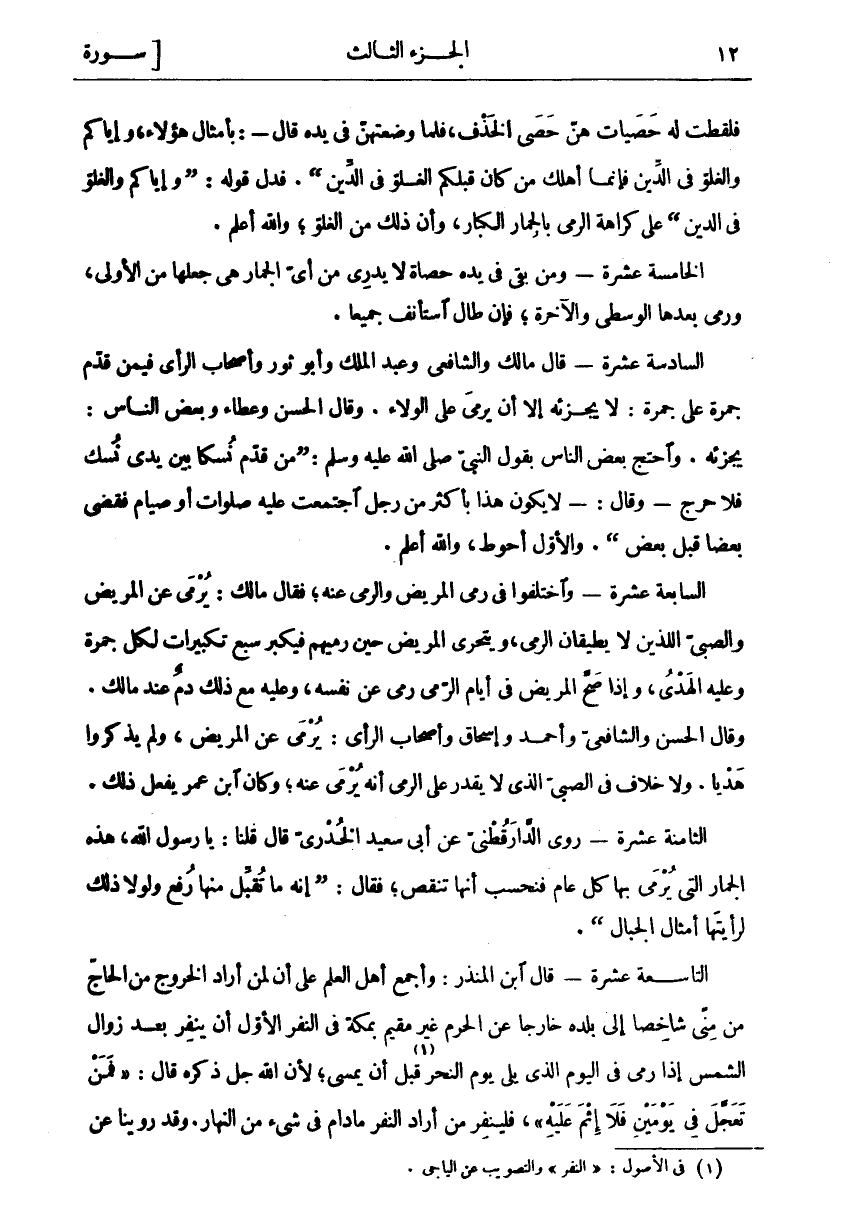 فَلَقَطْتُ لَهُ حَصَيَاتٍ هُنَّ حَصَى الْخَذْفِ، فَلَمَّا وَضَعْتُهُنَّ فِي يَدِهِ قَالَ-: بِأَمْثَالِ هَؤُلَاءِ، وَإِيَّاكُمْ وَالْغُلُوَّ فِي الدِّينِ فَإِنَّمَا أَهْلَكَ مَنْ كَانَ قَبْلَكُمُ الْغُلُوُّ فِي الدِّينِ". فَدَلَّ قَوْلُهُ:" وَإِيَّاكُمْ وَالْغُلُوَّ فِي الدِّينِ" عَلَى كَرَاهَةِ الرَّمْيِ بِالْجِمَارِ الْكِبَارِ، وَأَنَّ ذَلِكَ مِنَ الْغُلُوِّ، وَاللَّهُ أَعْلَمُ. الْخَامِسَةَ عَشْرَةَ- وَمَنْ بَقِيَ فِي يَدِهِ حَصَاةٌ لَا يَدْرِي مِنْ أَيِّ الْجِمَارِ هِيَ جَعَلَهَا مِنَ الْأُولَى، وَرَمَى بَعْدَهَا الْوُسْطَى وَالْآخِرَةَ، فَإِنْ طَالَ اسْتَأْنَفَ جَمِيعًا. السَّادِسَةَ عَشْرَةَ- قَالَ مَالِكٌ وَالشَّافِعِيُّ وَعَبْدُ الْمَلِكِ وَأَبُو ثَوْرٍ وَأَصْحَابُ الرَّأْيِ فِيمَنْ قَدَّمَ جَمْرَةً عَلَى جَمْرَةٍ: لَا يُجْزِئُهُ إِلَّا أَنْ يَرْمِيَ عَلَى الْوَلَاءِ. وَقَالَ الْحَسَنُ وَعَطَاءٌ وَبَعْضُ النَّاسِ: يُجْزِئُهُ. وَاحْتَجَّ بَعْضُ النَّاسِ بِقَوْلِ النَّبِيِّ صَلَّى اللَّهُ عَلَيْهِ وَسَلَّمَ:" مَنْ قَدَّمَ نُسُكًا بَيْنَ يَدَيْ نُسُكٍ فَلَا حَرَجَ- وَقَالَ:- لَا يَكُونُ هَذَا بِأَكْثَرَ مِنْ رَجُلٍ اجْتَمَعَتْ عَلَيْهِ صَلَوَاتٌ أَوْ صِيَامٌ فَقَضَى بَعْضًا قَبْلَ بَعْضٍ". وَالْأَوَّلُ أَحْوَطُ، وَاللَّهُ أَعْلَمُ. السَّابِعَةَ عَشْرَةَ- وَاخْتَلَفُوا فِي رَمْيِ الْمَرِيضِ وَالرَّمْيِ عَنْهُ، فَقَالَ مَالِكٌ: يُرْمَى عَنِ الْمَرِيضِ وَالصَّبِيِّ اللَّذَيْنِ لَا يُطِيقَانِ الرَّمْيَ، وَيَتَحَرَّى الْمَرِيضُ حِينَ رَمْيِهِمْ فَيُكَبِّرُ سَبْعَ تَكْبِيرَاتٍ لِكُلِّ جَمْرَةٍ وَعَلَيْهِ الْهَدْيُ، وَإِذَا صَحَّ الْمَرِيضُ فِي أَيَّامِ الرَّمْيِ رَمَى عَنْ نَفْسِهِ، وَعَلَيْهِ مَعَ ذَلِكَ دَمٌ عِنْدَ مَالِكٍ. وَقَالَ الْحَسَنُ وَالشَّافِعِيُّ وَأَحْمَدُ وَإِسْحَاقُ وَأَصْحَابُ الرَّأْيِ: يُرْمَى عَنِ الْمَرِيضِ، وَلَمْ يَذْكُرُوا هَدْيًا. وَلَا خِلَافَ فِي الصَّبِيِّ الَّذِي لَا يَقْدِرُ عَلَى الرَّمْيِ أَنَّهُ يُرْمَى عَنْهُ، وَكَانَ ابْنُ عُمَرَ يَفْعَلُ ذَلِكَ. الثَّامِنَةَ عَشْرَةَ- رَوَى الدَّارَقُطْنِيُّ عَنْ أَبِي سَعِيدٍ الْخُدْرِيِّ قَالَ قُلْنَا: يَا رَسُولَ اللَّهِ، هَذِهِ الْجِمَارُ الَّتِي يُرْمَى بِهَا كُلَّ عَامٍ فَنَحْسِبُ أَنَّهَا تَنْقُصُ، فَقَالَ:" إِنَّهُ مَا تُقُبِّلَ مِنْهَا رُفِعَ وَلَوْلَا ذَلِكَ لَرَأَيْتَهَا أَمْثَالَ الْجِبَالِ". التَّاسِعَةَ عَشْرَةَ- قَالَ ابْنُ الْمُنْذِرِ: وَأَجْمَعَ أَهْلُ الْعِلْمِ عَلَى أَنَّ لِمَنْ أَرَادَ الْخُرُوجَ مِنَ الْحَاجِّ مِنْ مِنًى شَاخِصًا إِلَى بَلَدِهِ خَارِجًا عَنِ الْحَرَمِ غَيْرَ مُقِيمٍ بِمَكَّةَ فِي النَّفْرِ الْأَوَّلِ أَنْ يَنْفِرَ بَعْدَ زَوَالِ الشَّمْسِ إِذَا رَمَى فِي الْيَوْمِ الَّذِي يَلِي يَوْمَ النَّحْرِ «١» قَبْلَ أَنْ يُمْسِيَ، لِأَنَّ اللَّهَ جَلَّ ذِكْرُهُ قَالَ:" فَمَنْ تَعَجَّلَ فِي يَوْمَيْنِ فَلا إِثْمَ عَلَيْهِ"، فَلْيَنْفِرْ مَنْ أَرَادَ النَّفْرَ ما دام في شي من النهار. وقد روينا عن