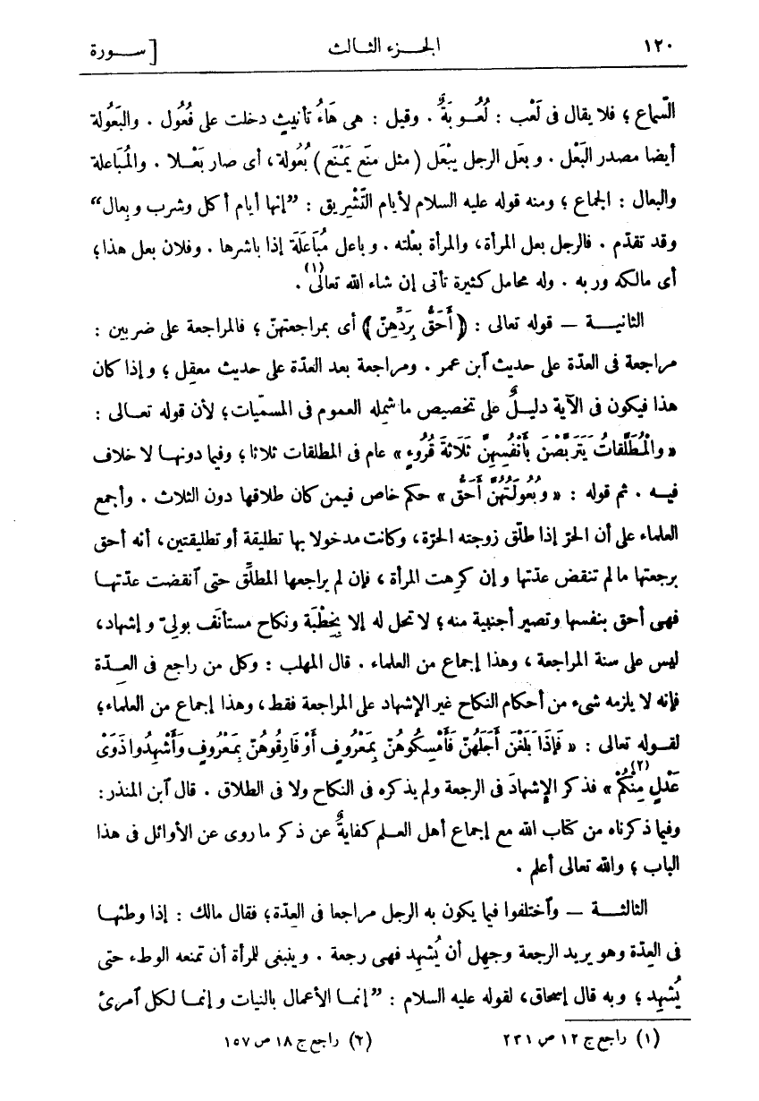 السَّمَاعُ، فَلَا يُقَالُ فِي لَعْبٍ: لُعُوبَةٌ. وَقِيلَ: هِيَ هَاءُ تَأْنِيثٍ دَخَلَتْ عَلَى فُعُولٍ. وَالْبُعُولَةُ أَيْضًا مَصْدَرُ الْبَعْلِ. وَبَعَلَ الرَّجُلُ يَبْعَلُ (مِثْلَ مَنَعَ يَمْنَعُ) بُعُولَةً، أَيْ صَارَ بَعْلًا. وَالْمُبَاعَلَةُ وَالْبِعَالُ: الْجِمَاعُ، وَمِنْهُ قَوْلُهُ عَلَيْهِ السَّلَامُ لِأَيَّامِ التَّشْرِيقِ:" إِنَّهَا أَيَّامُ أَكْلٍ وَشُرْبٍ وَبِعَالٍ" وَقَدْ تَقَدَّمَ. فَالرَّجُلُ بَعْلُ الْمَرْأَةِ، وَالْمَرْأَةُ بَعْلَتُهُ. وَبَاعَلَ مُبَاعَلَةً إِذَا بَاشَرَهَا. وَفُلَانٌ بَعْلُ هَذَا، أَيْ مَالِكُهُ وَرَبُّهُ. وَلَهُ مَحَامِلُ كَثِيرَةٌ تَأْتِي إِنْ شَاءَ اللَّهُ تَعَالَى «١». الثَّانِيَةُ- قَوْلُهُ تَعَالَى: (أَحَقُّ بِرَدِّهِنَّ) أَيْ بِمُرَاجَعَتِهِنَّ، فَالْمُرَاجَعَةُ عَلَى ضَرْبَيْنِ: مُرَاجَعَةٌ فِي الْعِدَّةِ عَلَى حَدِيثِ ابْنِ عُمَرَ. وَمُرَاجَعَةٌ بَعْدَ الْعِدَّةِ عَلَى حَدِيثِ مَعْقِلٍ، وَإِذَا كَانَ هَذَا فَيَكُونُ فِي الْآيَةِ دَلِيلٌ عَلَى تَخْصِيصِ مَا شَمِلَهُ الْعُمُومُ فِي الْمُسَمَّيَاتِ، لِأَنَّ قَوْلَهُ تَعَالَى:" وَالْمُطَلَّقاتُ يَتَرَبَّصْنَ بِأَنْفُسِهِنَّ ثَلاثَةَ قُرُوءٍ" عَامٌّ فِي الْمُطَلَّقَاتِ ثَلَاثًا، وَفِيمَا دُونَهَا لَا خِلَافَ فِيهِ. ثُمَّ قَوْلَهُ:" وَبُعُولَتُهُنَّ أَحَقُّ" حُكْمٌ خَاصٌّ فِيمَنْ كَانَ طَلَاقُهَا دُونَ الثَّلَاثِ. وَأَجْمَعَ الْعُلَمَاءُ عَلَى أَنَّ الْحُرَّ إِذَا طَلَّقَ زَوْجَتَهُ الْحُرَّةَ، وَكَانَتْ مَدْخُولًا بِهَا تَطْلِيقَةً أَوْ تَطْلِيقَتَيْنِ، أَنَّهُ أَحَقُّ بِرَجْعَتِهَا مَا لَمْ تَنْقَضِ عِدَّتُهَا وَإِنْ كَرِهَتِ الْمَرْأَةُ، فَإِنْ لَمْ يُرَاجِعْهَا الْمُطَلِّقُ حَتَّى انْقَضَتْ عِدَّتُهَا فَهِيَ أَحَقُّ بِنَفْسِهَا وَتَصِيرُ أَجْنَبِيَّةً مِنْهُ، لَا تَحِلُّ لَهُ إِلَّا بِخِطْبَةٍ وَنِكَاحٍ مُسْتَأْنَفٍ بِوَلِيٍّ وَإِشْهَادٍ، لَيْسَ عَلَى سُنَّةِ الْمُرَاجَعَةِ، وَهَذَا إِجْمَاعٌ مِنَ الْعُلَمَاءِ. قَالَ الْمُهَلَّبُ: وَكُلُّ مَنْ رَاجَعَ فِي الْعِدَّةِ فَإِنَّهُ لَا يَلْزَمُهُ شي مِنْ أَحْكَامِ النِّكَاحِ غَيْرَ الْإِشْهَادِ عَلَى الْمُرَاجَعَةِ فَقَطْ، وَهَذَا إِجْمَاعٌ مِنَ الْعُلَمَاءِ، لِقَوْلِهِ تَعَالَى:" فَإِذا بَلَغْنَ أَجَلَهُنَّ فَأَمْسِكُوهُنَّ بِمَعْرُوفٍ أَوْ فارِقُوهُنَّ بِمَعْرُوفٍ وَأَشْهِدُوا ذَوَيْ عَدْلٍ «٢» مِنْكُمْ" فَذَكَرَ الْإِشْهَادَ فِي الرَّجْعَةِ وَلَمْ يَذْكُرْهُ فِي النِّكَاحِ وَلَا فِي الطَّلَاقِ. قَالَ ابْنُ الْمُنْذِرِ: وَفِيمَا ذَكَرْنَاهُ مِنْ كِتَابِ اللَّهِ مَعَ إِجْمَاعِ أَهْلِ الْعِلْمِ كِفَايَةٌ عَنْ ذِكْرِ مَا رُوِيَ عَنِ الْأَوَائِلِ فِي هَذَا الْبَابِ، وَاللَّهُ تَعَالَى أَعْلَمُ. الثَّالِثَةُ- وَاخْتَلَفُوا فِيمَا يَكُونُ بِهِ الرَّجُلُ مُرَاجِعًا فِي الْعِدَّةِ، فَقَالَ مَالِكٌ: إِذَا وَطِئَهَا فِي الْعِدَّةِ وَهُوَ يُرِيدُ الرَّجْعَةَ وَجَهِلَ أَنْ يُشْهِدَ فَهِيَ رجعة. وينبغي للمرأة أن تمنعه الوطي حَتَّى يُشْهِدَ، وَبِهِ قَالَ إِسْحَاقُ، لِقَوْلِهِ عَلَيْهِ السَّلَامُ:" إِنَّمَا الْأَعْمَالُ بِالنِّيَّاتِ وَإِنَّمَا لِكُلِّ امْرِئٍ
