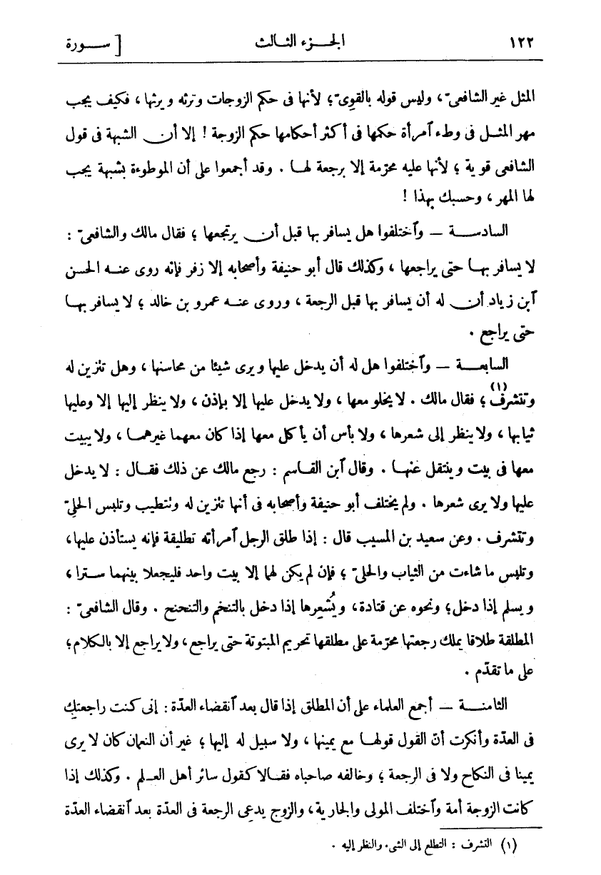 الْمِثْلِ غَيْرَ الشَّافِعِيِّ، وَلَيْسَ قَوْلُهُ بِالْقَوِيِّ، لِأَنَّهَا فِي حُكْمِ الزَّوْجَاتِ وَتَرِثُهُ وَيَرِثُهَا، فَكَيْفَ يَجِبُ مهر المثل في وطئ امْرَأَةٍ حُكْمُهَا فِي أَكْثَرِ أَحْكَامِهَا حُكْمُ الزَّوْجَةِ! إِلَّا أَنَّ الشُّبْهَةَ فِي قَوْلِ الشَّافِعِيِّ قَوِيَّةٌ، لِأَنَّهَا عَلَيْهِ مُحَرَّمَةٌ إِلَّا بِرَجْعَةٍ لَهَا. وَقَدْ أَجْمَعُوا عَلَى أَنَّ الْمَوْطُوءَةَ بِشُبْهَةٍ يَجِبُ لَهَا الْمَهْرُ، وَحَسْبُكَ بِهَذَا! السَّادِسَةُ- وَاخْتَلَفُوا هَلْ يُسَافِرُ بِهَا قَبْلَ أَنْ يَرْتَجِعَهَا، فَقَالَ مَالِكٌ وَالشَّافِعِيُّ: لَا يُسَافِرُ بِهَا حَتَّى يُرَاجِعَهَا، وَكَذَلِكَ قَالَ أَبُو حَنِيفَةَ وَأَصْحَابُهُ إِلَّا زُفَرَ فَإِنَّهُ رَوَى عنه الحسن ابن زِيَادٍ أَنَّ لَهُ أَنْ يُسَافِرَ بِهَا قَبْلَ الرَّجْعَةِ، وَرَوَى عَنْهُ عَمْرُو بْنُ خَالِدٍ، لَا يُسَافِرُ بِهَا حَتَّى يُرَاجِعَ. السَّابِعَةُ- وَاخْتَلَفُوا هَلْ لَهُ أَنْ يَدْخُلَ عَلَيْهَا وَيَرَى شَيْئًا مِنْ مَحَاسِنِهَا، وَهَلْ تَتَزَيَّنُ لَهُ وَتَتَشَرَّفُ «١»، فَقَالَ مَالِكٌ. لَا يَخْلُو مَعَهَا، وَلَا يَدْخُلُ عَلَيْهَا إِلَّا بِإِذْنٍ، وَلَا يَنْظُرُ إِلَيْهَا إِلَّا وَعَلَيْهَا ثِيَابُهَا، وَلَا يَنْظُرُ إِلَى شَعْرِهَا، وَلَا بَأْسَ أَنْ يَأْكُلَ مَعَهَا إِذَا كَانَ مَعَهُمَا غَيْرُهُمَا، وَلَا يَبِيتُ مَعَهَا فِي بَيْتٍ وَيَنْتَقِلُ عَنْهَا. وَقَالَ ابْنُ الْقَاسِمِ: رَجَعَ مَالِكٌ عَنْ ذَلِكَ فَقَالَ: لَا يَدْخُلُ عَلَيْهَا وَلَا يَرَى شَعْرَهَا. وَلَمْ يَخْتَلِفْ أَبُو حَنِيفَةَ وَأَصْحَابُهُ فِي أَنَّهَا تَتَزَيَّنُ لَهُ وَتَتَطَيَّبُ وَتَلْبَسُ الْحُلِيَّ وَتَتَشَرَّفُ. وَعَنْ سَعِيدِ بْنِ الْمُسَيَّبِ قَالَ: إِذَا طَلَّقَ الرَّجُلُ امْرَأَتَهُ تَطْلِيقَةً فَإِنَّهُ يَسْتَأْذِنُ عَلَيْهَا، وَتَلْبَسُ مَا شَاءَتْ مِنَ الثِّيَابِ وَالْحُلِيِّ، فَإِنْ لَمْ يَكُنْ لَهُمَا إِلَّا بَيْتٌ وَاحِدٌ فَلْيَجْعَلَا بَيْنَهُمَا سِتْرًا، وَيُسَلِّمُ إِذَا دَخَلَ، وَنَحْوُهُ عَنْ قَتَادَةَ، وَيُشْعِرُهَا إِذَا دَخَلَ بِالتَّنَخُّمِ وَالتَّنَحْنُحِ. وَقَالَ الشَّافِعِيُّ: الْمُطَلَّقَةُ طَلَاقًا يَمْلِكُ رَجْعَتَهَا مُحَرَّمَةٌ عَلَى مُطَلِّقِهَا تَحْرِيمَ الْمَبْتُوتَةِ حَتَّى يُرَاجِعَ، وَلَا يُرَاجِعُ إِلَّا بِالْكَلَامِ، عَلَى مَا تَقَدَّمَ. الثَّامِنَةُ- أَجْمَعَ الْعُلَمَاءُ عَلَى أَنَّ الْمُطَلِّقَ إِذَا قَالَ بَعْدَ انْقِضَاءِ الْعِدَّةِ: إِنِّي كُنْتُ رَاجَعْتُكَ فِي الْعِدَّةِ وَأَنْكَرَتْ أَنَّ الْقَوْلَ قَوْلُهَا مَعَ يَمِينِهَا، وَلَا سَبِيلَ لَهُ إِلَيْهَا، غَيْرَ أَنَّ النُّعْمَانَ كَانَ لَا يَرَى يَمِينًا في النكاح ولا في الرجمة، وَخَالَفَهُ صَاحِبَاهُ فَقَالَا كَقَوْلِ سَائِرِ أَهْلِ الْعِلْمِ. وَكَذَلِكَ إِذَا كَانَتِ الزَّوْجَةُ أَمَةً وَاخْتَلَفَ الْمَوْلَى وَالْجَارِيَةُ، وَالزَّوْجُ يَدَّعِي الرَّجْعَةَ فِي الْعِدَّةِ بَعْدَ انقضاء العدة