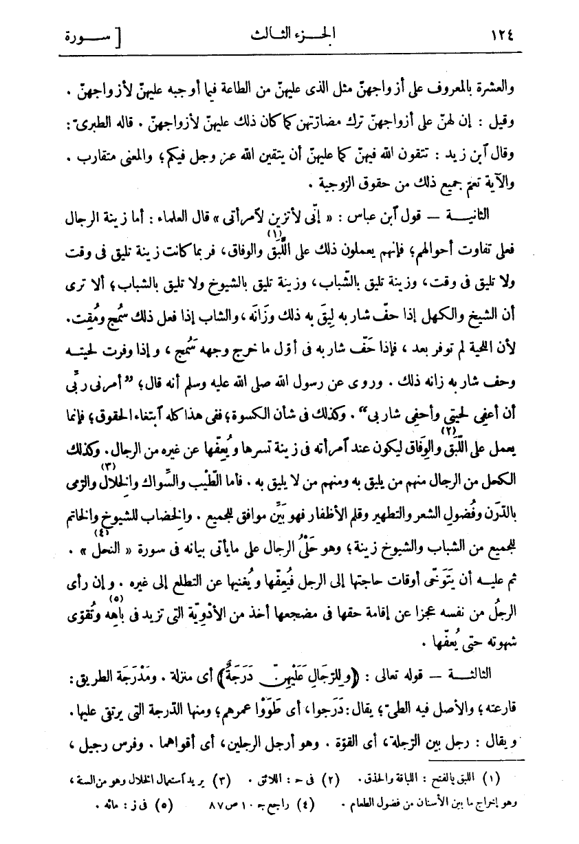 وَالْعِشْرَةِ بِالْمَعْرُوفِ عَلَى أَزْوَاجِهِنَّ مِثْلُ الَّذِي عَلَيْهِنَّ من الطاعة فيما أوجبه عليهن لأزواجهن. وقبل: إِنَّ لَهُنَّ عَلَى أَزْوَاجِهِنَّ تَرْكُ. مُضَارَّتِهِنَّ كَمَا كان ذلك عليهن لأزواجهن. قال الطَّبَرِيُّ: وَقَالَ ابْنُ زَيْدٍ: تَتَّقُونَ اللَّهَ فِيهِنَّ كَمَا عَلَيْهِنَّ أَنْ يَتَّقِينَ اللَّهَ عَزَّ وَجَلَّ فِيكُمْ، وَالْمَعْنَى مُتَقَارِبٌ. وَالْآيَةُ تَعُمُّ جَمِيعَ ذَلِكَ مِنْ حُقُوقِ الزَّوْجِيَّةِ. الثَّانِيَةُ- قَوْلُ ابْنِ عَبَّاسٍ:" إِنِّي لَأَتَزَيَّنُ لِامْرَأَتِي". قَالَ الْعُلَمَاءُ: أَمَّا زِينَةُ الرِّجَالِ فَعَلَى تَفَاوُتِ أَحْوَالِهِمْ، فَإِنَّهُمْ يَعْمَلُونَ ذَلِكَ عَلَى اللَّبَقِ «١» وَالْوِفَاقِ، فَرُبَّمَا كَانَتِ زِينَةً تَلِيقُ فِي وَقْتٍ وَلَا تَلِيقُ فِي وَقْتٍ، وَزِينَةً تَلِيقُ بِالشَّبَابِ، وَزِينَةً تَلِيقُ بِالشُّيُوخِ وَلَا تَلِيقُ بِالشَّبَابِ، أَلَا تَرَى أَنَّ الشَّيْخَ وَالْكَهْلَ إِذَا حَفَّ شَارِبَهُ لِيقَ بِهِ ذَلِكَ وَزَانَهُ، وَالشَّابَّ إِذَا فَعَلَ ذَلِكَ سَمُجَ وَمُقِتَ. لِأَنَّ اللِّحْيَةَ لَمْ تُوفِرْ بَعْدُ، فَإِذَا حَفَّ شَارِبَهُ فِي أَوَّلِ مَا خَرَجَ وَجْهُهُ سَمُجَ، وَإِذَا وَفَرَتْ لِحْيَتُهُ وَحُفَّ شَارِبُهُ زَانَهُ ذَلِكَ. وَرُوِيَ عَنْ رَسُولِ اللَّهِ صَلَّى اللَّهُ عَلَيْهِ وَسَلَّمَ أَنَّهُ قَالَ،" أَمَرَنِي رَبِّي أَنْ أُعْفِيَ لِحْيَتِي وَأُحْفِيَ شَارِبِي". وَكَذَلِكَ فِي شَأْنِ الْكُسْوَةِ، فَفِي هَذَا كُلِّهِ ابْتِغَاءُ الْحُقُوقِ، فَإِنَّمَا يُعْمَلُ عَلَى اللَّبَقِ «٢» وَالْوِفَاقِ لِيَكُونَ عِنْدَ امْرَأَتِهِ فِي زِينَةٍ تَسُرُّهَا وَيُعِفُّهَا عَنْ غَيْرِهِ مِنَ الرِّجَالِ. وَكَذَلِكَ الْكُحْلُ مِنَ الرِّجَالِ مِنْهُمْ مَنْ يَلِيقُ بِهِ وَمِنْهُمْ مَنْ لَا يَلِيقُ بِهِ. فَأَمَّا الطِّيبُ وَالسِّوَاكُ وَالْخِلَالُ «٣» وَالرَّمْيُ بِالدَّرَنِ وَفُضُولِ الشَّعْرِ وَالتَّطْهِيرُ وَقَلْمُ الْأَظْفَارِ فَهُوَ بَيِّنٌ مُوَافِقٌ لِلْجَمِيعِ. وَالْخِضَابُ لِلشُّيُوخِ وَالْخَاتَمُ لِلْجَمِيعِ مِنَ الشَّبَابِ وَالشُّيُوخِ زِينَةٌ، وَهُوَ حَلْيُ الرِّجَالِ عَلَى مَا يَأْتِي بَيَانُهُ فِي سُورَةِ" النَّحْلِ «٤» ". ثُمَّ عَلَيْهِ أَنْ يَتَوَخَّى أَوْقَاتِ حَاجَتِهَا إِلَى الرَّجُلِ فَيُعِفُّهَا وَيُغْنِيهَا عَنِ التَّطَلُّعِ إِلَى غَيْرِهِ. وَإِنْ رَأَى الرَّجُلُ مِنْ نَفْسِهِ عَجْزًا عَنْ إِقَامَةِ حَقِّهَا فِي مَضْجَعِهَا أَخَذَ مِنَ الْأَدْوِيَةِ الَّتِي تَزِيدُ فِي بَاهِهِ «٥» وَتُقَوِّي شَهْوَتَهُ حَتَّى يُعِفَّهَا. الثَّالِثَةُ- قَوْلُهُ تَعَالَى: (وَلِلرِّجالِ عَلَيْهِنَّ دَرَجَةٌ) أَيْ مَنْزِلَةٌ. وَمَدْرَجَةُ الطَّرِيقِ: قَارِعَتُهُ، وَالْأَصْلُ فِيهِ الطَّيُّ، يُقَالُ: دَرَجُوا، أَيْ طَوَوْا عُمْرَهُمْ، وَمِنْهَا الدَّرَجَةُ الَّتِي يُرْتَقَى عَلَيْهَا. وَيُقَالُ: رَجُلٌ بَيِّنُ الرَّجْلَةِ، أَيِ الْقُوَّةِ. وَهُوَ أَرْجَلُ الرجلين، أي أقواهما. وفرس رجيل،