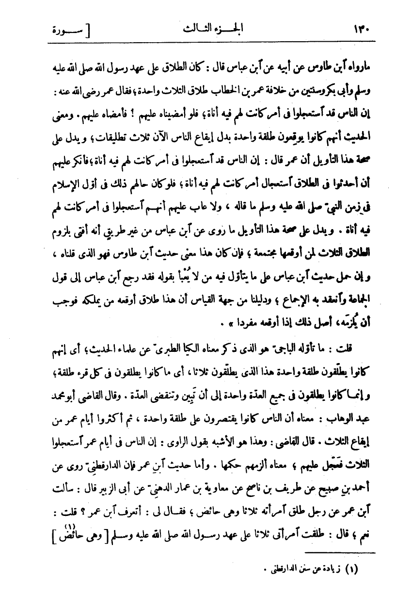 مَا رَوَاهُ ابْنُ طَاوُسٍ عَنْ أَبِيهِ عَنِ ابْنِ عَبَّاسٍ قَالَ: كَانَ الطَّلَاقُ عَلَى عَهْدِ رَسُولِ اللَّهِ صَلَّى اللَّهُ عَلَيْهِ وَسَلَّمَ وَأَبِي بَكْرٍ وَسَنَتَيْنِ مِنْ خِلَافَةِ عُمَرَ بْنِ الْخَطَّابِ طلاق الثلاث واحدة، فقأ عُمَرُ رَضِيَ اللَّهُ عَنْهُ: إِنَّ النَّاسَ قَدِ اسْتَعْجَلُوا فِي أَمْرٍ كَانَتْ لَهُمْ فِيهِ أَنَاةٌ، فَلَوْ أَمْضَيْنَاهُ عَلَيْهِمْ! فَأَمْضَاهُ عَلَيْهِمْ. وَمَعْنَى الْحَدِيثِ أَنَّهُمْ كَانُوا يُوقِعُونَ طَلْقَةً وَاحِدَةً بَدَلَ إِيقَاعِ النَّاسِ الْآنَ ثَلَاثَ تَطْلِيقَاتٍ، وَيَدُلُّ عَلَى صِحَّةِ هَذَا التَّأْوِيلِ أَنَّ عُمَرَ قَالَ: إِنَّ النَّاسَ قَدِ اسْتَعْجَلُوا فِي أَمْرٍ كَانَتْ لَهُمْ فِيهِ أَنَاةٌ، فَأَنْكَرَ عَلَيْهِمْ أَنْ أَحْدَثُوا فِي الطَّلَاقِ اسْتِعْجَالَ أَمْرٍ كَانَتْ لَهُمْ فِيهِ أَنَاةٌ، فَلَوْ كان ذلك حالهم فِي أَوَّلِ الْإِسْلَامِ فِي زَمَنِ النَّبِيِّ صَلَّى اللَّهُ عَلَيْهِ وَسَلَّمَ مَا قَالَهُ، وَلَا عَابَ عَلَيْهِمْ أَنَّهُمُ اسْتَعْجَلُوا فِي أَمْرٍ كَانَتْ لَهُمْ فِيهِ أَنَاةٌ. وَيَدُلُّ عَلَى صِحَّةِ هَذَا التَّأْوِيلِ مَا رُوِيَ عَنِ ابْنِ عَبَّاسٍ مِنْ غَيْرِ طَرِيقٍ أَنَّهُ أَفْتَى بِلُزُومِ الطَّلَاقِ الثَّلَاثِ لِمَنْ أَوْقَعَهَا مُجْتَمِعَةٌ، فَإِنْ كَانَ هَذَا مَعْنَى حَدِيثِ ابْنِ طَاوُسٍ فَهُوَ الَّذِي قُلْنَاهُ، وَإِنْ حُمِلَ حَدِيثُ ابْنِ عَبَّاسٍ عَلَى مَا يَتَأَوَّلُ فِيهِ من لا يعبأ بقول فَقَدْ رَجَعَ ابْنُ عَبَّاسٍ إِلَى قَوْلِ الْجَمَاعَةِ وَانْعَقَدَ بِهِ الْإِجْمَاعُ، وَدَلِيلُنَا مِنْ جِهَةِ الْقِيَاسِ أَنَّ هَذَا طَلَاقٌ أَوْقَعَهُ مَنْ يَمْلِكُهُ فَوَجَبَ أَنْ يَلْزَمَهُ، أَصْلُ ذَلِكَ إِذَا أَوْقَعَهُ مُفْرَدًا". قُلْتُ: مَا تَأَوَّلَهُ الْبَاجِيُّ هُوَ الَّذِي ذَكَرَ مَعْنَاهُ الْكِيَا الطَّبَرِيُّ عَنْ عُلَمَاءِ الْحَدِيثِ، أَيْ إِنَّهُمْ كَانُوا يُطَلِّقُونَ طَلْقَةً وَاحِدَةً هَذَا الَّذِي يُطَلِّقُونَ ثَلَاثًا، أَيْ مَا كَانُوا يُطَلِّقُونَ فِي كُلِّ قُرْءٍ طَلْقَةً، وَإِنَّمَا كَانُوا يُطَلِّقُونَ فِي جَمِيعِ الْعِدَّةِ وَاحِدَةً إِلَى أَنْ تَبِينَ وَتَنْقَضِيَ الْعِدَّةُ. وَقَالَ الْقَاضِي أَبُو مُحَمَّدٍ عَبْدُ الْوَهَّابِ: مَعْنَاهُ أَنَّ النَّاسَ كَانُوا يَقْتَصِرُونَ عَلَى طَلْقَةٍ وَاحِدَةٍ، ثُمَّ أَكْثَرُوا أَيَّامَ عُمَرَ مِنْ إِيقَاعٍ الثَّلَاثِ. قَالَ الْقَاضِي: وَهَذَا هُوَ الْأَشْبَهُ بِقَوْلِ الرَّاوِي: إِنَّ النَّاسَ فِي أَيَّامِ عُمَرَ اسْتَعْجَلُوا الثَّلَاثَ فَعَجَّلَ عَلَيْهِمْ، مَعْنَاهُ أَلْزَمَهُمْ حُكْمَهَا. وَأَمَّا حَدِيثُ ابْنِ عُمَرَ فَإِنَّ الدَّارَقُطْنِيَّ رَوَى عَنْ أَحْمَدَ بْنِ صُبَيْحٍ عَنْ طَرِيفِ بْنِ نَاصِحٍ عَنْ مُعَاوِيَةَ بْنِ عَمَّارٍ الدُّهْنِيِّ عَنْ أَبِي الزُّبَيْرِ قَالَ: سَأَلْتُ ابْنَ عُمَرَ عَنْ رَجُلٍ طَلَّقَ امْرَأَتَهُ ثَلَاثًا وَهِيَ، حَائِضٌ، فَقَالَ لِي: أَتَعْرِفُ ابْنَ عُمَرَ؟ قُلْتُ: نَعَمْ، قَالَ: طَلَّقْتُ امْرَأَتِي ثَلَاثًا عَلَى عَهْدِ رَسُولِ اللَّهِ صَلَّى اللَّهُ عَلَيْهِ وَسَلَّمَ [وهى حائض «١»]
