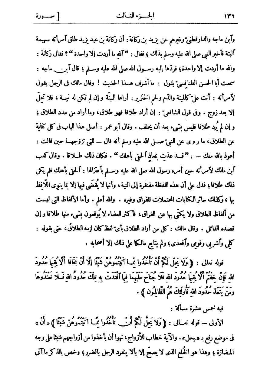 وَابْنُ مَاجَهْ وَالدَّارَقُطْنِيُّ وَغَيْرُهُمْ عَنْ يَزِيدَ بْنِ رُكَانَةَ: أَنَّ رُكَانَةَ بْنَ عَبْدِ يَزِيدَ طَلَّقَ امْرَأَتَهُ سُهَيْمَةَ الْبَتَّةَ فَأَخْبَرَ النَّبِيَّ صَلَّى اللَّهُ عَلَيْهِ وَسَلَّمَ بِذَلِكَ، فَقَالَ:" آللَّهِ مَا أَرَدْتَ إِلَّا وَاحِدَةً"؟ فَقَالَ رُكَانَةُ: وَاللَّهِ مَا أَرَدْتُ إِلَّا وَاحِدَةً، فَرَدَّهَا إِلَيْهِ رَسُولُ اللَّهِ صَلَّى اللَّهُ عَلَيْهِ وَسَلَّمَ، قَالَ ابْنُ مَاجَهْ: سَمِعْتُ أَبَا الْحَسَنِ الطَّنَافِسِيَّ يَقُولُ: مَا أَشْرَفَ هَذَا الْحَدِيثَ! وَقَالَ مَالِكٌ فِي الرَّجُلِ يَقُولُ لِامْرَأَتِهِ: أَنْتِ عَلَيَّ كَالْمَيْتَةِ وَالدَّمِ وَلَحْمِ الْخِنْزِيرِ: أَرَاهَا الْبَتَّةَ وَإِنْ لَمْ تَكُنْ لَهُ نِيَّةٌ، فَلَا تَحِلُّ إِلَّا بَعْدَ زَوْجٍ. وَفِي قَوْلِ الشَّافِعِيِّ: إِنْ أَرَادَ طَلَاقًا فَهُوَ طَلَاقٌ، وَمَا أَرَادَ مِنْ عَدَدِ الطَّلَاقِ، وَإِنْ لَمْ يُرِدْ طَلَاقًا فَلَيْسَ بِشَيْءٍ بَعْدَ أَنْ يَحْلِفَ. وَقَالَ أَبُو عُمَرَ: أَصْلُ هَذَا الْبَابِ فِي كُلِّ كِنَايَةٍ عَنِ الطَّلَاقِ، مَا رُوِيَ عَنِ النَّبِيِّ صَلَّى اللَّهُ عَلَيْهِ وَسَلَّمَ أَنَّهُ قَالَ- لِلَّتِي تَزَوَّجَهَا حِينَ قَالَتْ: أَعُوذُ بِاللَّهِ مِنْكَ-:" قَدْ عُذْتِ بِمُعَاذٍ الْحَقِي بِأَهْلِكِ". فَكَانَ ذَلِكَ طَلَاقًا. وَقَالَ كعب ابن مَالِكٍ لِامْرَأَتِهِ حِينَ أَمَرَهُ رَسُولُ اللَّهِ صَلَّى اللَّهُ عَلَيْهِ وَسَلَّمَ بِاعْتِزَالِهَا: الْحَقِي بِأَهْلِكِ فَلَمْ يَكُنْ ذَلِكَ طَلَاقًا، فَدَلَّ عَلَى أَنَّ هَذِهِ اللَّفْظَةَ مُفْتَقِرَةٌ إِلَى النِّيَّةِ، وَأَنَّهَا لَا يُقْضَى فِيهَا إِلَّا بِمَا يَنْوِي اللَّافِظُ بِهَا، وَكَذَلِكَ سَائِرُ الْكِنَايَاتِ الْمُحْتَمَلَاتِ لِلْفِرَاقِ وَغَيْرِهِ. وَاللَّهُ أَعْلَمُ. وَأَمَّا الْأَلْفَاظُ الَّتِي لَيْسَتْ مِنْ أَلْفَاظِ الطَّلَاقِ وَلَا يُكَنَّى بِهَا عَنِ الْفِرَاقِ، فَأَكْثَرُ الْعُلَمَاءِ لَا يُوقِعُونَ بِشَيْءٍ مِنْهَا طَلَاقًا وَإِنْ قَصَدَهُ الْقَائِلُ. وَقَالَ مَالِكٌ: كُلُّ مَنْ أَرَادَ الطَّلَاقَ بِأَيِ لَفْظٍ كَانَ لَزِمَهُ الطَّلَاقُ، حَتَّى بِقَوْلِهِ: كُلِي وَاشْرَبِي وَقُومِي وَاقْعُدِي، وَلَمْ يُتَابِعْ مَالِكًا عَلَى ذَلِكَ إِلَّا أَصْحَابُهُ. قَوْلُهُ تَعَالَى: (وَلا يَحِلُّ لَكُمْ أَنْ تَأْخُذُوا مِمَّا آتَيْتُمُوهُنَّ شَيْئاً إِلَّا أَنْ يَخافا أَلَّا يُقِيما حُدُودَ اللَّهِ فَإِنْ خِفْتُمْ أَلَّا يُقِيما حُدُودَ اللَّهِ فَلا جُناحَ عَلَيْهِما فِيمَا افْتَدَتْ بِهِ تِلْكَ حُدُودُ اللَّهِ فَلا تَعْتَدُوها وَمَنْ يَتَعَدَّ حُدُودَ اللَّهِ فَأُولئِكَ هُمُ الظَّالِمُونَ (. فِيهِ خَمْسَ عَشْرَةَ مَسْأَلَةً: الْأُولَى- قَوْلُهُ تَعَالَى:) وَلا يَحِلُّ لَكُمْ أَنْ تَأْخُذُوا مِمَّا آتَيْتُمُوهُنَّ شَيْئاً (" أَنْ
