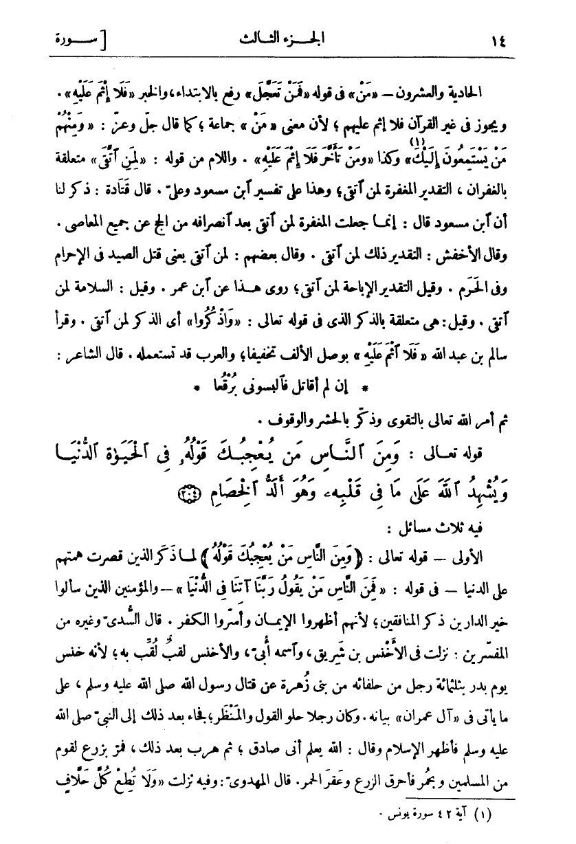 فِيهِ ثَلَاثُ مَسَائِلَ: الْأُولَى- قَوْلُهُ تَعَالَى: وَمِنَ النَّاسِ مَنْ يُعْجِبُكَ قَوْلُهُ لَمَّا ذَكَرَ الَّذِينَ قَصُرَتْ هِمَّتُهُمْ عَلَى الدُّنْيَا- فِي قَوْلِهِ:" فَمِنَ النَّاسِ مَنْ يَقُولُ رَبَّنا آتِنا فِي الدُّنْيا"- وَالْمُؤْمِنِينَ الَّذِينَ سَأَلُوا خَيْرَ الدَّارَيْنِ ذَكَرَ الْمُنَافِقِينَ، لِأَنَّهُمْ أَظْهَرُوا الْإِيمَانَ وَأَسَرُّوا الْكُفْرَ. قَالَ السُّدِّيُّ وَغَيْرُهُ مِنَ الْمُفَسِّرِينَ: نَزَلَتْ فِي الْأَخْنَسِ بْنِ شُرَيْقٍ، وَاسْمُهُ أُبَيٌّ، وَالْأَخْنَسُ لَقَبٌ لُقِّبَ بِهِ، لِأَنَّهُ خَنَسَ يَوْمَ بَدْرٍ بِثَلَاثِمِائَةِ رَجُلٍ مِنْ حُلَفَائِهِ مِنْ بَنِي زُهْرَةَ عَنْ قِتَالِ رَسُولِ اللَّهِ صَلَّى اللَّهُ عَلَيْهِ وَسَلَّمَ، عَلَى مَا يَأْتِي فِي" آلِ عِمْرَانَ" بَيَانُهُ. وَكَانَ رَجُلًا حُلْوَ الْقَوْلِ وَالْمَنْظَرِ، فَجَاءَ بَعْدَ ذَلِكَ إِلَى النَّبِيِّ صَلَّى اللَّهُ عَلَيْهِ وَسَلَّمَ فَأَظْهَرَ الْإِسْلَامَ وَقَالَ: اللَّهُ يَعْلَمُ أَنَّى صَادِقٌ، ثُمَّ هَرَبَ بَعْدَ ذَلِكَ، فَمَرَّ بِزَرْعٍ لِقَوْمٍ مِنَ الْمُسْلِمِينَ وَبِحُمُرٍ فَأَحْرَقَ الزَّرْعَ وعقر الحمر. قال المهدوي: وفية نزلت