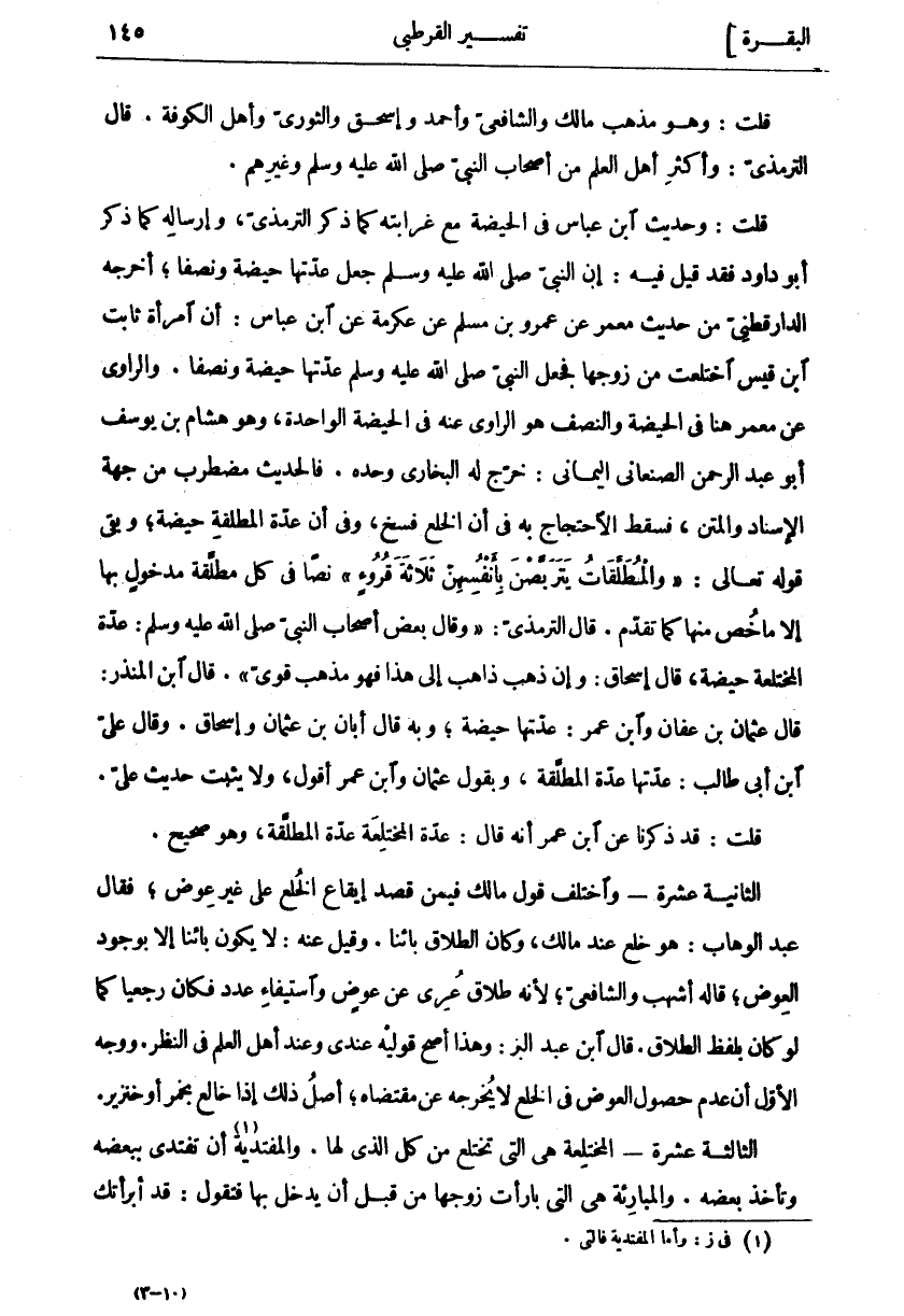 قُلْتُ: وَهُوَ مَذْهَبُ مَالِكٍ وَالشَّافِعِيِّ وَأَحْمَدَ وَإِسْحَاقَ وَالثَّوْرِيِّ وَأَهْلِ الْكُوفَةِ. قَالَ التِّرْمِذِيُّ: وَأَكْثَرِ أَهْلِ الْعِلْمِ مِنْ أَصْحَابِ النَّبِيِّ صَلَّى اللَّهُ عَلَيْهِ وَسَلَّمَ وَغَيْرِهِمْ. قُلْتُ: وَحَدِيثُ ابْنِ عَبَّاسٍ فِي الْحَيْضَةِ مَعَ غَرَابَتِهِ كَمَا ذَكَرَ التِّرْمِذِيُّ، وَإِرْسَالِهِ كَمَا ذَكَرَ أَبُو دَاوُدَ فَقَدْ قِيلَ فِيهِ: إِنَّ النَّبِيَّ صَلَّى اللَّهُ عَلَيْهِ وَسَلَّمَ جَعَلَ عِدَّتَهَا حَيْضَةً وَنِصْفًا، أَخْرَجَهُ الدَّارَقُطْنِيُّ مِنْ حَدِيثِ مَعْمَرٍ عَنْ عَمْرِو بْنِ مُسْلِمٍ عَنْ عِكْرِمَةَ عن ابن عباس: أن امرأة ثابت ابن قَيْسٍ اخْتَلَعَتْ مِنْ زَوْجِهَا فَجَعَلَ النَّبِيُّ صَلَّى اللَّهُ عَلَيْهِ وَسَلَّمَ عِدَّتَهَا حَيْضَةً وَنِصْفًا. وَالرَّاوِي عَنْ مَعْمَرٍ هُنَا فِي الْحَيْضَةِ وَالنِّصْفِ هُوَ الرَّاوِي عَنْهُ فِي الْحَيْضَةِ الْوَاحِدَةِ، وَهُوَ هِشَامُ بْنُ يُوسُفَ أَبُو عَبْدِ الرَّحْمَنِ الصَّنْعَانِيُّ الْيَمَانِيُّ: خَرَّجَ لَهُ الْبُخَارِيُّ وَحْدَهُ. فَالْحَدِيثُ مُضْطَرِبٌ مِنْ جِهَةِ الْإِسْنَادِ وَالْمَتْنِ، فَسَقَطَ الِاحْتِجَاجُ بِهِ فِي أَنَّ الْخُلْعَ فَسْخٌ، وَفِي أَنَّ عِدَّةَ الْمُطَلَّقَةِ حَيْضَةٌ، وَبَقِيَ قَوْلُهُ تَعَالَى:" وَالْمُطَلَّقاتُ يَتَرَبَّصْنَ بِأَنْفُسِهِنَّ ثَلاثَةَ قُرُوءٍ" نَصًّا فِي كُلِّ مُطَلَّقَةٍ مَدْخُولٍ بِهَا إِلَّا مَا خُصَّ مِنْهَا كَمَا تَقَدَّمَ. قَالَ التِّرْمِذِيُّ:" وَقَالَ بَعْضُ أَصْحَابِ النَّبِيِّ صَلَّى اللَّهُ عَلَيْهِ وَسَلَّمَ: عِدَّةُ الْمُخْتَلِعَةِ حَيْضَةٌ، قَالَ إِسْحَاقُ: وَإِنْ ذَهَبَ ذَاهِبٌ إِلَى هَذَا فَهُوَ مَذْهَبٌ قَوِيٌّ". قَالَ ابْنُ الْمُنْذِرِ: قَالَ عُثْمَانُ بْنُ عَفَّانَ وَابْنُ عُمَرَ: عِدَّتُهَا حَيْضَةٌ، وَبِهِ قَالَ أَبَانُ بْنُ عُثْمَانَ وَإِسْحَاقُ. وَقَالَ عَلِيُّ ابن أَبِي طَالِبٍ: عِدَّتُهَا عِدَّةُ الْمُطَلَّقَةِ، وَبِقَوْلِ عُثْمَانَ وَابْنِ عُمَرَ أَقُولُ، وَلَا يَثْبُتُ حَدِيثُ عَلِيٍّ. قُلْتُ: قَدْ ذَكَرْنَا عَنِ ابْنِ عُمَرَ أَنَّهُ قَالَ: عِدَّةُ الْمُخْتَلِعَةِ عِدَّةُ الْمُطَلَّقَةِ، وَهُوَ صَحِيحٌ. الثَّانِيَةَ عَشْرَةَ- وَاخْتَلَفَ قَوْلُ مَالِكٍ فِيمَنْ قَصَدَ إِيقَاعَ الْخُلْعِ عَلَى غَيْرِ عِوَضٍ، فَقَالَ عَبْدُ الْوَهَّابِ: هُوَ خُلْعٌ عِنْدَ مَالِكٍ، وَكَانَ الطَّلَاقُ بَائِنًا. وَقِيلَ عَنْهُ: لَا يَكُونُ بَائِنًا إِلَّا بِوُجُودِ الْعِوَضِ، قَالَهُ أَشْهَبُ وَالشَّافِعِيُّ، لِأَنَّهُ طَلَاقٌ عُرِيَ عَنْ عِوَضٍ وَاسْتِيفَاءِ عَدَدٍ فَكَانَ رَجْعِيًّا كَمَا لَوْ كَانَ بِلَفْظِ الطَّلَاقِ. قَالَ ابْنُ عَبْدِ الْبَرِّ: وَهَذَا أَصَحُّ قَوْلَيْهِ عِنْدِي وَعِنْدَ أَهْلِ الْعِلْمِ فِي النَّظَرِ. وَوَجْهُ الْأَوَّلِ أَنَّ عَدَمَ حُصُولِ الْعِوَضِ فِي الْخُلْعِ لَا يُخْرِجُهُ عَنْ مُقْتَضَاهُ، أَصْلُ ذَلِكَ إِذَا خَالَعَ بِخَمْرٍ أَوْ خِنْزِيرٍ. الثَّالِثَةَ عَشْرَةَ- الْمُخْتَلِعَةُ هِيَ الَّتِي تَخْتَلِعُ مِنْ كُلِّ الَّذِي لَهَا. وَالْمُفْتَدِيَةُ «١» أَنْ تَفْتَدِيَ بِبَعْضِهِ وَتَأْخُذَ بَعْضَهُ. وَالْمُبَارِئَةُ هِيَ الَّتِي بَارَأَتْ زَوْجَهَا مِنْ قَبْلِ أَنْ يَدْخُلَ بِهَا فتقول: قد أبرأتك