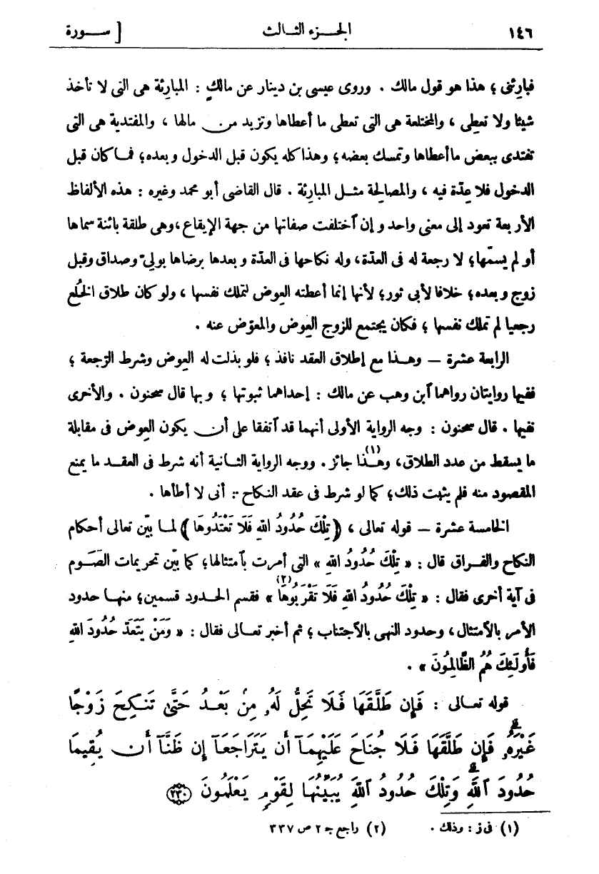 فَإِنْ طَلَّقَها فَلا تَحِلُّ لَهُ مِنْ بَعْدُ حَتَّى تَنْكِحَ زَوْجاً غَيْرَهُ فَإِنْ طَلَّقَها فَلا جُناحَ عَلَيْهِما أَنْ يَتَراجَعا إِنْ ظَنَّا أَنْ يُقِيما حُدُودَ اللَّهِ وَتِلْكَ حُدُودُ اللَّهِ يُبَيِّنُها لِقَوْمٍ يَعْلَمُونَ (٢٣٠)
