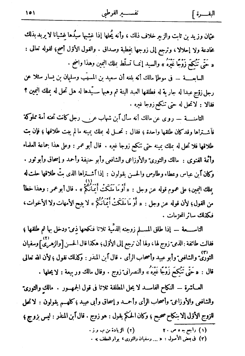 عُثْمَانَ وَزَيْدِ بْنِ ثَابِتٍ وَالزُّبَيْرِ خِلَافُ ذَلِكَ، وَأَنَّهُ يُحِلُّهَا إِذَا غَشِيَهَا سَيِّدُهَا غَشَيَانًا لَا يُرِيدُ بِذَلِكَ مُخَادَعَةً وَلَا إِحْلَالًا، وَتَرْجِعُ إِلَى زَوْجِهَا بِخِطْبَةٍ وَصَدَاقٍ. وَالْقَوْلُ الْأَوَّلُ أَصَحُّ، لِقَوْلِهِ تَعَالَى:" حَتَّى تَنْكِحَ زَوْجاً غَيْرَهُ" وَالسَّيِّدُ إِنَّمَا تَسَلَّطَ بِمِلْكِ الْيَمِينِ وَهَذَا وَاضِحٌ. السَّابِعَةُ- فِي مُوَطَّإِ مَالِكٍ أَنَّهُ بَلَغَهُ أَنَّ سَعِيدَ بْنَ السيب وَسُلَيْمَانَ بْنَ يَسَارٍ سُئِلَا عَنْ رَجُلٍ زَوَّجَ عبد اله جَارِيَةً لَهُ فَطَلَّقَهَا الْعَبْدُ الْبَتَّةَ ثُمَّ وَهَبَهَا سَيِّدُهَا لَهُ هَلْ تَحِلُّ لَهُ بِمِلْكِ الْيَمِينِ؟ فَقَالَا: لَا تَحِلُّ لَهُ حَتَّى تَنْكِحَ زَوْجًا غَيْرَهُ. الثَّامِنَةُ- رُوِيَ عَنْ مَالِكٍ أَنَّهُ سَأَلَ ابْنَ شِهَابٍ عَنْ رَجُلٍ كَانَتْ تَحْتَهُ أَمَةٌ مَمْلُوكَةٌ فَاشْتَرَاهَا وَقَدْ كَانَ طَلَّقَهَا وَاحِدَةً، فَقَالَ: تَحِلُّ لَهُ بِمِلْكِ يَمِينِهِ مَا لَمْ يَبِتَّ طَلَاقَهَا، فَإِنْ بَتَّ طَلَاقَهَا فَلَا تَحِلُّ لَهُ بِمِلْكِ يَمِينِهِ حَتَّى تَنْكِحَ زَوْجًا غَيْرَهُ. قَالَ أَبُو عُمَرَ: وَعَلَى هَذَا جَمَاعَةُ الْعُلَمَاءِ وَأَئِمَّةُ الْفَتْوَى: مَالِكٌ وَالثَّوْرِيُّ وَالْأَوْزَاعِيُّ وَالشَّافِعِيُّ وَأَبُو حَنِيفَةَ وَأَحْمَدُ وَإِسْحَاقُ وَأَبُو ثَوْرٍ. وَكَانَ ابْنُ عَبَّاسٍ وَعَطَاءٌ وَطَاوُسٌ وَالْحَسَنُ يَقُولُونَ: إِذَا اشْتَرَاهَا الَّذِي بَتَّ طَلَاقَهَا حَلَّتْ لَهُ بِمِلْكِ الْيَمِينِ، عَلَى عُمُومِ قَوْلِهِ عَزَّ وَجَلَّ:" أَوْ مَا مَلَكَتْ أَيْمانُكُمْ «١» ". قَالَ أَبُو عُمَرَ: وَهَذَا خَطَأٌ مِنَ الْقَوْلِ، لِأَنَّ قَوْلَهُ عَزَّ وَجَلَّ:" أَوْ مَا مَلَكَتْ أَيْمانُكُمْ" لَا يُبِيحُ الْأُمَّهَاتِ وَلَا الْأَخَوَاتِ، فَكَذَلِكَ سَائِرُ الْمُحَرَّمَاتِ. التَّاسِعَةُ- إِذَا طَلَّقَ الْمُسْلِمُ زَوْجَتَهُ الذِّمِّيَّةَ ثَلَاثًا فَنَكَحَهَا ذِمِّيٌّ وَدَخَلَ بِهَا ثُمَّ طَلَّقَهَا، فَقَالَتْ طَائِفَةٌ: الذِّمِّيُّ زَوْجٌ لَهَا، وَلَهَا أَنْ تَرْجِعَ إِلَى الْأَوَّلِ، هَكَذَا قَالَ الْحَسَنُ [وَالزُّهْرِيُّ «٢»] وَسُفْيَانُ الثَّوْرِيُّ «٣» وَالشَّافِعِيُّ وَأَبُو عُبَيْدٍ وَأَصْحَابُ الرَّأْيِ. قَالَ ابْنُ الْمُنْذِرِ: وَكَذَلِكَ نَقُولُ، لِأَنَّ اللَّهَ تَعَالَى قَالَ:" حَتَّى تَنْكِحَ زَوْجاً غَيْرَهُ" وَالنَّصْرَانِيُّ زَوْجٌ. وَقَالَ مَالِكٌ وَرَبِيعَةُ: لَا يُحِلُّهَا. الْعَاشِرَةُ- النِّكَاحُ الْفَاسِدُ لَا يُحِلُّ الْمُطَلَّقَةَ ثَلَاثًا فِي قَوْلِ الْجُمْهُورِ. مَالِكٌ وَالثَّوْرِيُّ وَالشَّافِعِيُّ وَالْأَوْزَاعِيُّ وَأَصْحَابُ الرَّأْيِ وَأَحْمَدُ وَإِسْحَاقُ وَأَبِي عُبَيْدٍ، كُلُّهُمْ يَقُولُونَ: لَا تَحِلُّ لِلزَّوْجِ الْأَوَّلِ إِلَّا بِنِكَاحٍ صَحِيحٍ، وَكَانَ الْحَكَمُ يَقُولُ: هُوَ زَوْجٌ. قال ابن المنذر: ليس بزوج،