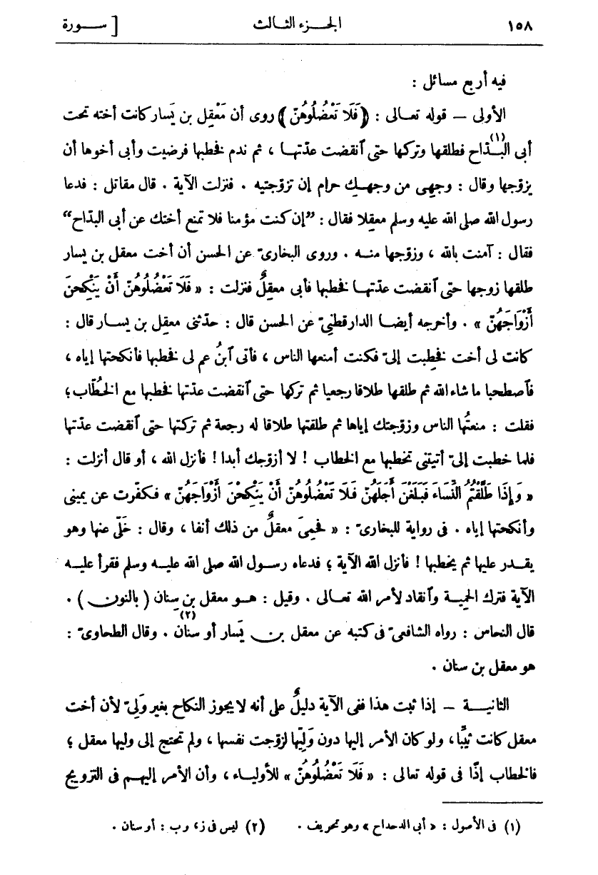 فِيهِ أَرْبَعُ مَسَائِلَ: الْأُولَى- قَوْلُهُ تَعَالَى: (فَلا تَعْضُلُوهُنَّ) رُوِيَ أَنَّ مَعْقِلَ بْنَ يَسَارٍ كَانَتْ أُخْتُهُ تَحْتَ أَبِي الْبَدَّاحِ «١» فَطَلَّقَهَا وَتَرَكَهَا حَتَّى انْقَضَتْ عِدَّتُهَا، ثُمَّ نَدِمَ فَخَطَبَهَا فَرَضِيَتْ وَأَبَى أَخُوهَا أَنْ يُزَوِّجَهَا وَقَالَ: وَجْهِي مِنْ وَجْهِكِ حَرَامٌ إِنْ تَزَوَّجْتِيهِ. فَنَزَلَتِ الْآيَةُ. قَالَ مُقَاتِلٌ: فَدَعَا رَسُولُ اللَّهِ صَلَّى اللَّهُ عَلَيْهِ وَسَلَّمَ مَعْقِلًا فَقَالَ:" إِنْ كُنْتَ مُؤْمِنًا فَلَا تَمْنَعْ أُخْتَكَ عَنْ أَبِي الْبَدَّاحِ" فَقَالَ: آمَنْتُ بِاللَّهِ، وَزَوَّجَهَا مِنْهُ. وَرَوَى الْبُخَارِيُّ عَنِ الْحَسَنِ أَنَّ أُخْتَ مَعْقِلِ بْنِ يَسَارٍ طَلَّقَهَا زَوْجُهَا حَتَّى انْقَضَتْ عِدَّتُهَا فَخَطَبَهَا فَأَبَى مَعْقِلٌ فَنَزَلَتْ:" فَلا تَعْضُلُوهُنَّ أَنْ يَنْكِحْنَ أَزْواجَهُنَّ". وَأَخْرَجَهُ أَيْضًا الدَّارَقُطْنِيُّ عَنِ الْحَسَنِ قَالَ: حَدَّثَنِي مَعْقِلُ بْنُ يَسَارٍ قَالَ: كَانَتْ لِي أُخْتٌ فَخُطِبَتْ إِلَيَّ فَكُنْتُ أَمْنَعُهَا النَّاسَ، فَأَتَى ابْنُ عَمٍّ لِي فَخَطَبَهَا فَأَنْكَحْتُهَا إِيَّاهُ، فَاصْطَحَبَا مَا شَاءَ اللَّهُ ثُمَّ طَلَّقَهَا طَلَاقًا رَجْعِيًّا ثُمَّ تَرَكَهَا حَتَّى انْقَضَتْ عِدَّتُهَا فَخَطَبَهَا مَعَ الْخُطَّابِ، فَقُلْتُ: مَنَعْتُهَا النَّاسَ وَزَوَّجْتُكَ إِيَّاهَا ثُمَّ طَلَّقْتَهَا طَلَاقًا لَهُ رَجْعَةٌ ثُمَّ تَرَكْتَهَا حَتَّى انْقَضَتْ عِدَّتُهَا فَلَمَّا خُطِبَتْ إِلَيَّ أَتَيْتَنِي تَخْطُبُهَا مَعَ الْخُطَّابِ! لَا أُزَوِّجُكَ أَبَدًا! فَأَنْزَلَ اللَّهُ، أَوْ قَالَ أُنْزِلَتْ:" وَإِذا طَلَّقْتُمُ النِّساءَ فَبَلَغْنَ أَجَلَهُنَّ فَلا تَعْضُلُوهُنَّ أَنْ يَنْكِحْنَ أَزْواجَهُنَّ" فَكَفَّرْتُ عَنْ يَمِينِي وَأَنْكَحْتُهَا إِيَّاهُ. فِي رِوَايَةٍ لِلْبُخَارِيِّ:" فَحَمِيَ مَعْقِلٌ مِنْ ذَلِكَ أَنَفًا، وَقَالَ: خَلَّى عَنْهَا وَهُوَ يَقْدِرُ عَلَيْهَا ثُمَّ يَخْطُبُهَا! فَأَنْزَلَ اللَّهُ الْآيَةَ، فَدَعَاهُ رَسُولُ اللَّهِ صَلَّى اللَّهُ عَلَيْهِ وَسَلَّمَ فَقَرَأَ عَلَيْهِ الْآيَةَ فَتَرَكَ الْحَمِيَّةَ وَانْقَادَ لِأَمْرِ اللَّهِ تَعَالَى. وَقِيلَ: هُوَ مَعْقِلُ بْنُ سِنَانٍ (بِالنُّونِ). قَالَ النَّحَّاسُ: رَوَاهُ الشَّافِعِيُّ فِي كُتُبِهِ عَنْ مَعْقِلِ بْنِ يَسَارٍ أَوْ سِنَانٍ «٢». وَقَالَ الطَّحَاوِيُّ: هُوَ مَعْقِلُ بْنُ سِنَانٍ. الثَّانِيَةُ- إِذَا ثَبَتَ هَذَا فَفِي الْآيَةِ دَلِيلٌ عَلَى أَنَّهُ لَا يَجُوزُ النِّكَاحُ بِغَيْرٍ وَلِيٍّ لِأَنَّ أُخْتَ مَعْقِلٍ كَانَتْ ثَيِّبًا، وَلَوْ كَانَ الْأَمْرُ إِلَيْهَا دُونَ وَلِيِّهَا لَزَوَّجَتْ نَفْسَهَا، وَلَمْ تَحْتَجْ إِلَى وَلِيِّهَا مَعْقِلٍ، فَالْخِطَابُ إِذًا فِي قَوْلِهِ تَعَالَى:" فَلا تَعْضُلُوهُنَّ" للأولياء، وأن الامر إليهم في التزويج
